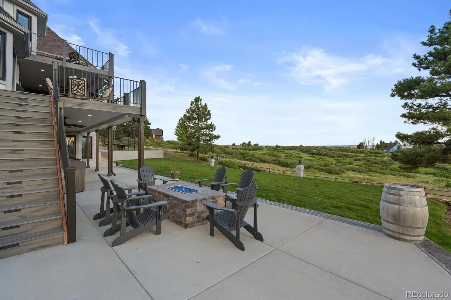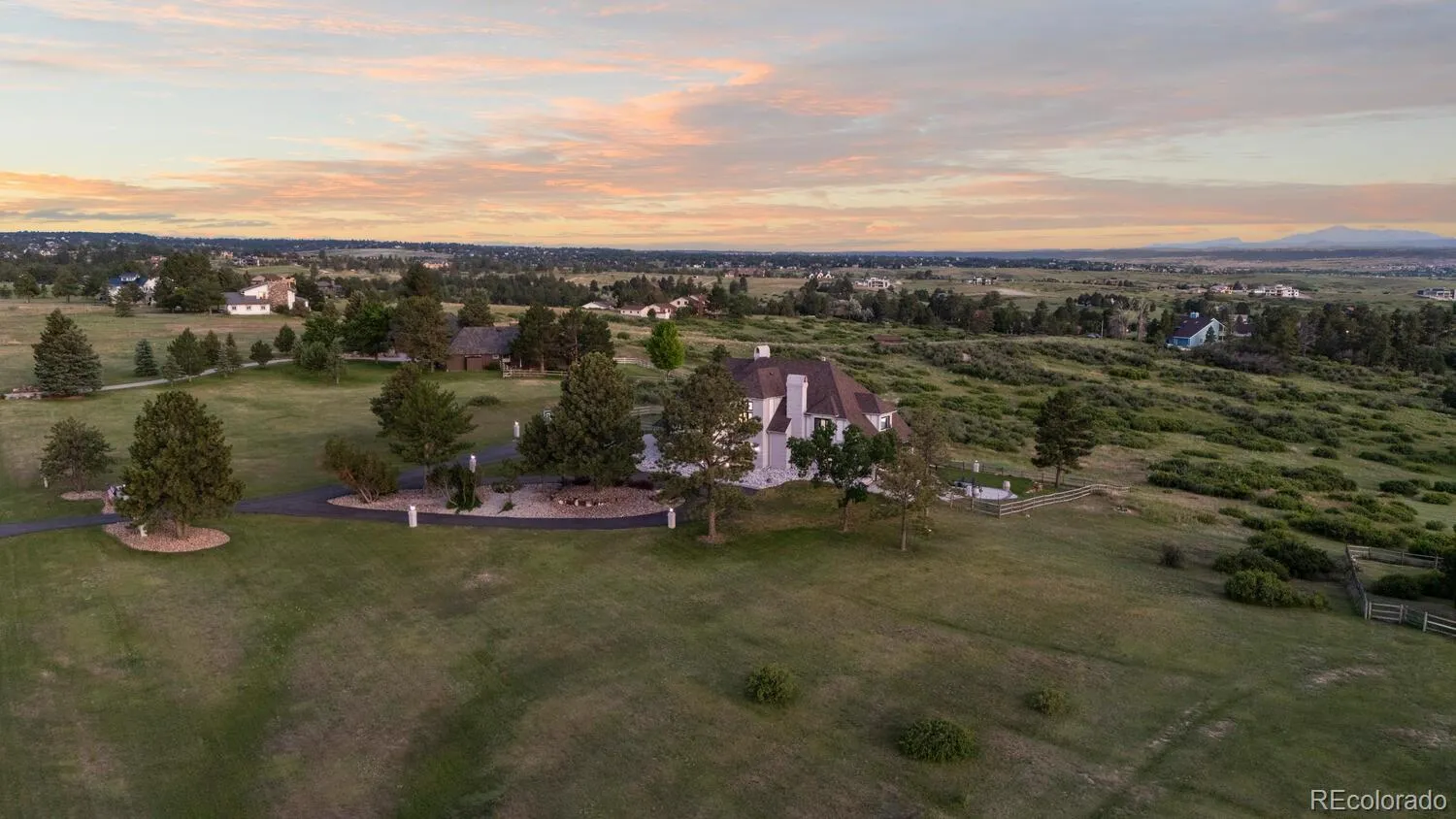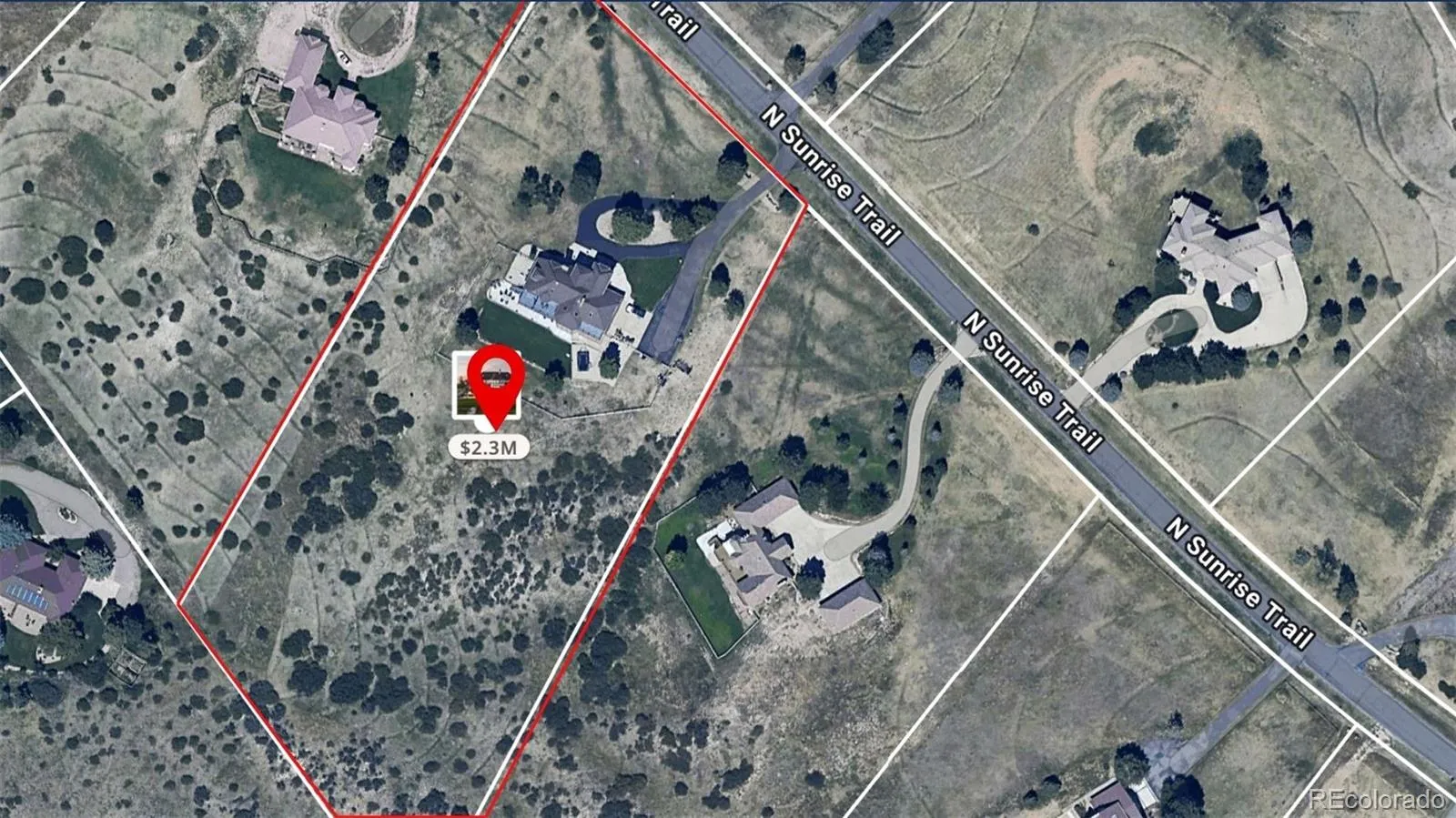 $100K PRICE DROP!! Commanding, unforgettable, & entirely one-of-a-kind, 7689 N. Sunrise Trail is a nearly 7,500 sq. ft. estate crowning 5 pristine acres in Parker’s prestigious Butterfield enclave where cinematic peak-to-peak views ensure every sunset feels like a work of art! With $350K+ in upgrades—including a remodeled Primary Suite bath, new windows throughout, basement kitchen remodel, fresh interior/exterior paint, & new asphalt driveway—this estate balances timeless grandeur with modern elegance. Step inside to the brick herringbone foyer wrapped in timeless shiplap walls, setting the tone for warmth & elegance throughout. The Great Room boasts a dramatic floor-to-ceiling fireplace with a wall of windows that frame the Rocky Mountains in breathtaking panoramas. A corner coffee bar adds charm, while the gourmet kitchen shines w/marble counters, maple cabinetry, gas stove, & a conversational island. An adjacent sunlit breakfast nook offers the perfect setting for casual meals w/views that stretch for miles. A main-level bedroom w/updated ensuite bath, private office, elegant dining room, & stylish laundry/mudroom complete the level. Luxury’s on repeat as you head upstairs to the Primary Suite retreat featuring a newly remodeled 5 piece en-suite bath with dual quartz vanity, freestanding soaking tub, glass shower, & walk-in closet. Down the hall, the perks keep stacking: 3 generous bedrooms—one with a refreshed en-suite, two w/direct deck access, & another full bath. Take it to the top—literally. The 4th level is part penthouse and part playground & makes the perfect guest suite! The walkout basement boasts a remodeled kitchen bar area for mixing, mingling, & margaritas; a full bath; a massive gym/7th non-conforming bedroom & endless room to host, lounge, or live it up. Freedom meets opportunity with RR zoning, well & septic—bring your horses or build an outbuilding; so many options all in the heart of Parker. The views will stop you and this home will move you.