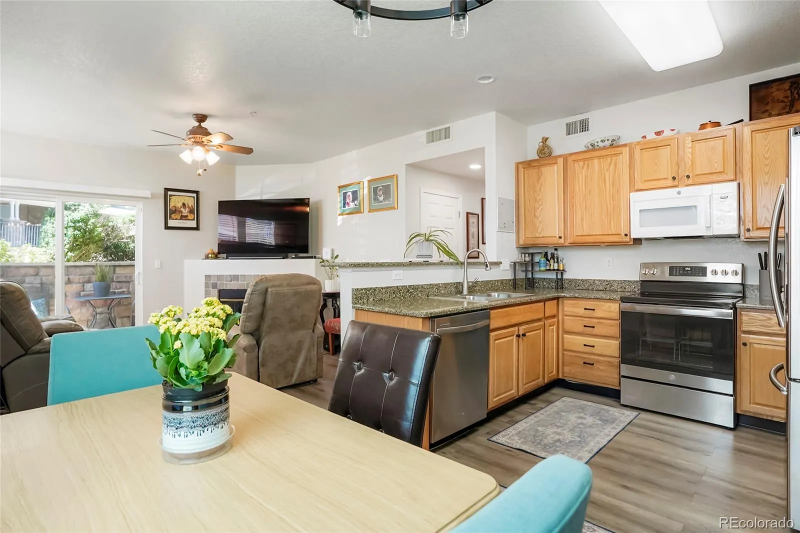 Price Just Reduced! Are you looking for a 2bed 2bath condo on the ground floor with no stairs and a garage in a Great Location?! Stop right now because you have just found your new home! Welcome to your beautiful light and bright end unit condo in the highly desirable Stonegate community! This condo has natural sunlight with tall ceilings throughout! The open concept living room features a cozy gas fireplace that flows into the dining area where there’s plenty of space for family dinners along with a peninsula/breakfast bar to add barstools for more eating space. The kitchen has plenty of cabinet space, granite countertops, stainless appliances(oven also doubles as an air fryer), a custom built buffet, along with a pantry cabinet. Enjoy your coffee or a glass of wine out on the private covered patio. Retreat to the spacious owner’s suite where you will enjoy a 5 piece bathroom with newly tiled shower, separate soaking tub and a large walk in closet with new custom built-ins for all your clothes, shoes and more! There is also a large 2nd bedroom(or office) and another full bathroom. Enjoy the added convenience of an in-unit main level washer and dryer! New light fixtures, LVP flooring, newer appliances, new hot water heater and low-E window in the front of the condo. This condo also comes with a 1 car detached garage with storage and a window for lots of light, and parking in front of your garage as well directly across from the unit and no steps from parking on the back side of the unit! Enjoy access to the many pools, clubhouse facilities, playgrounds, tennis courts, and walking trails. Close to E-470 and I-25, Cherry Creek trails, restaurants, shops, and lots of local favorites. Highly sought after Douglas County schools also close by. Relax in the quiet treed green belt and parks as you stroll through the neighborhood. Call me to schedule a showing today and don’t miss out on this low-maintenance ground level Stonegate gem! A place you will love to call home!