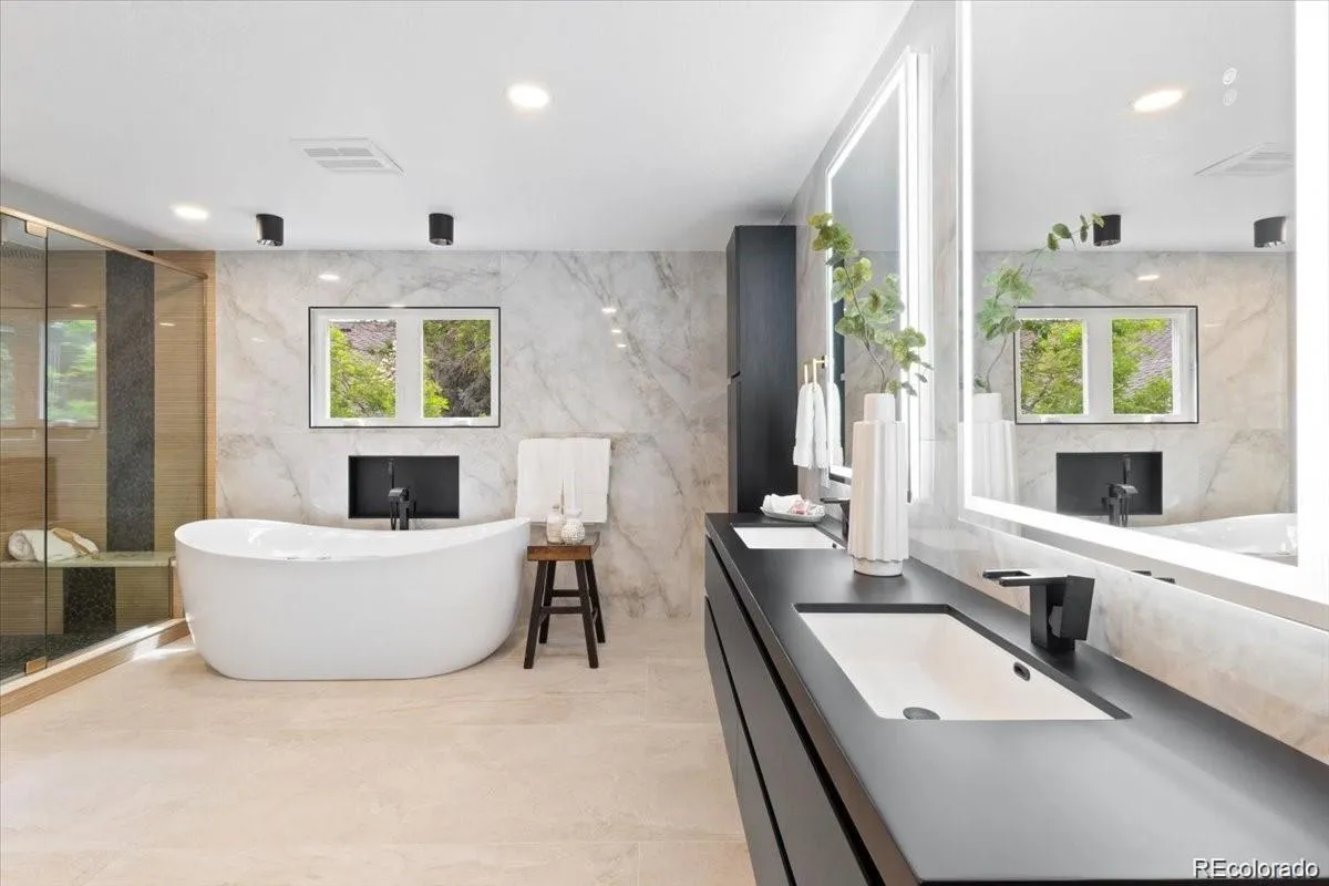 French doors lead to two exceptional outdoor retreats: a private front courtyard ideal for morning coffee or evening wine, and a tranquil back deck overlooking a lush greenbelt and babbling creek. Upstairs, the primary suite is a true sanctuary, featuring its own balcony and a spa-inspired bath with a jetted tub, heated floors, dual vanities, a massive walk-in shower, custom closet, and private water closet. Two additional bedrooms and a beautifully appointed full bath complete the upper level.