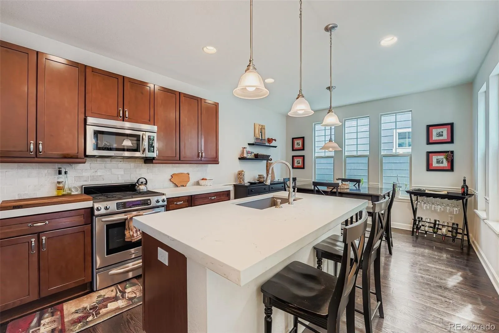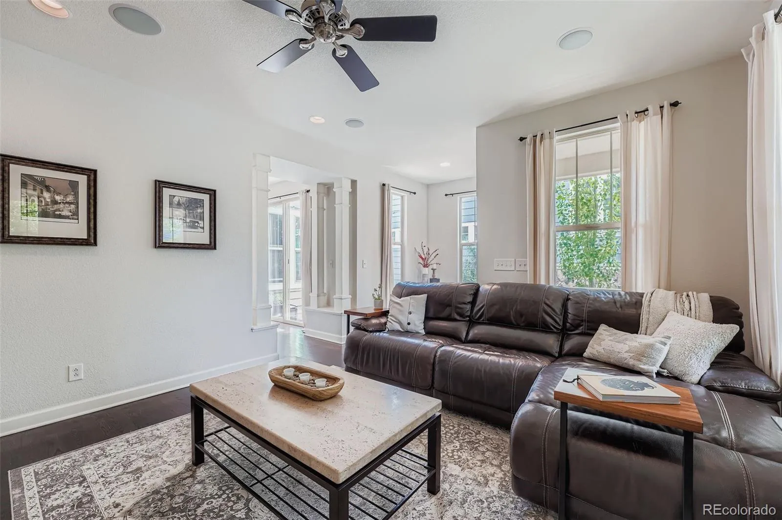 Inside, you’ll find oak hardwood floors, an open-concept design, and a chef’s kitchen with quartz counters, a tumbled Carrara marble backsplash, and plenty of storage. The seamless flow from kitchen ? dining ? living makes entertaining effortless, and a cozy gas fireplace sets the mood for Colorado evenings.