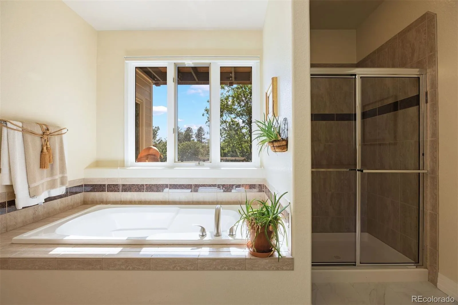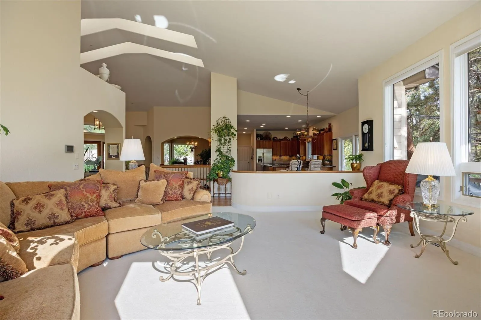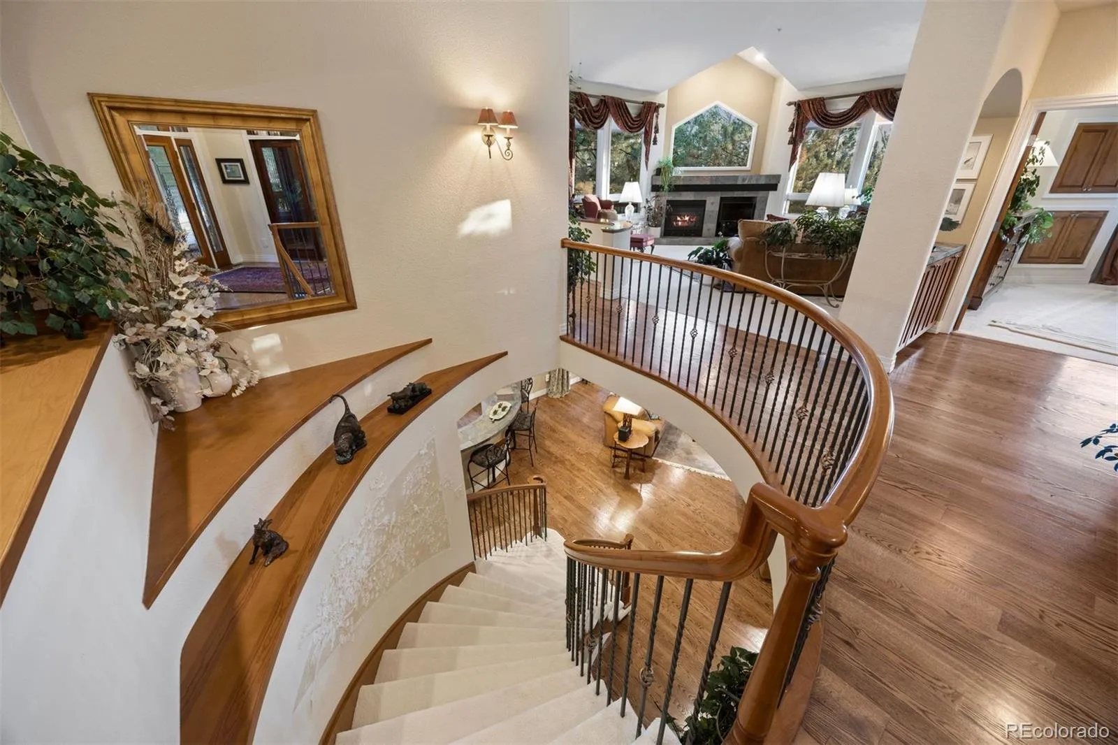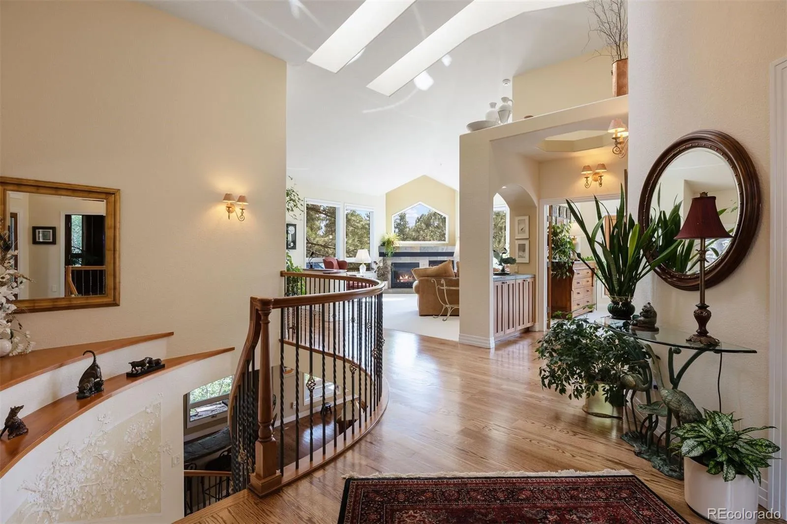 Surrounded by towering pines on a cul-de-sac, this home in The Village Castle Pines offers a beautiful blend of privacy, comfort, and nature. A flagstone walkway and front water feature welcome you to a richly detailed interior with a paneled library, formal dining room, and a gourmet kitchen with granite counters, double ovens, and an eat-in nook opening to a wraparound Trex deck. From here, enjoy mountain vistas, wildlife, and sunsets while relaxing or entertaining. The main-level primary suite is a retreat with its own deck, a two-sided fireplace, updated spa-like bath, and custom closet. The walkout lower level features a wet bar, stone fireplace, and access to multiple flagstone patios in the storybook landscaped backyard. Two lower level, en suite bedrooms and abundant storage complete the space. Recently refreshed with new flooring, updated baths, and modernized systems, this home combines timeless style, peace of mind, and extraordinary outdoor living.