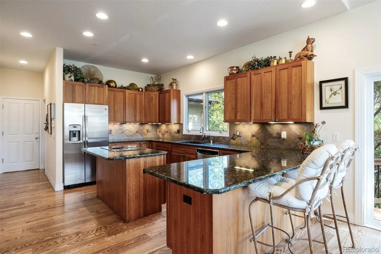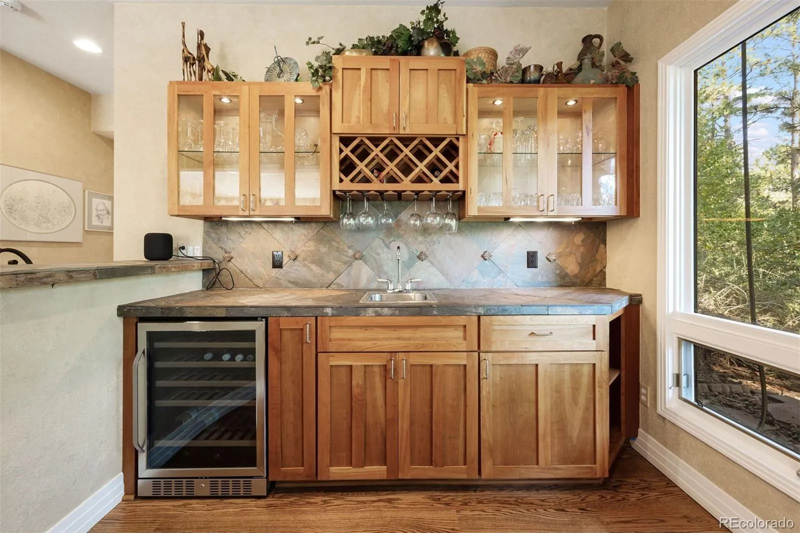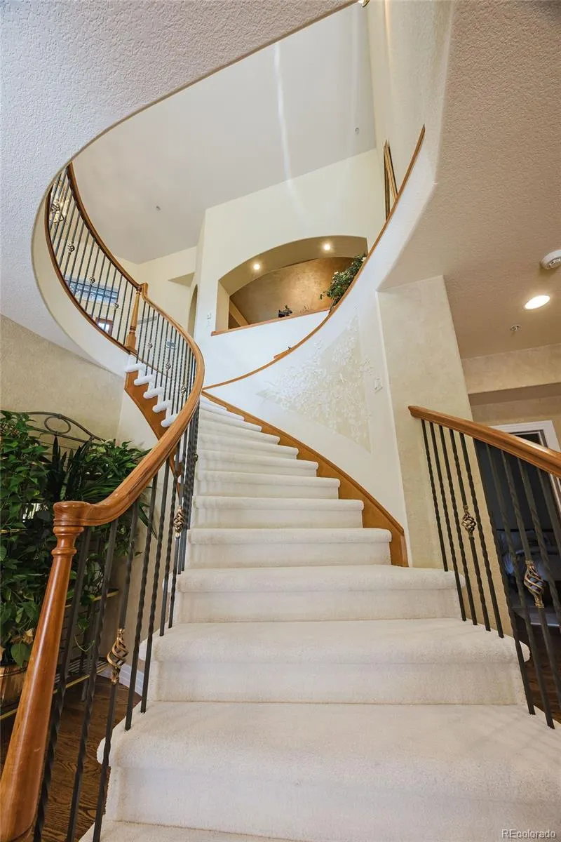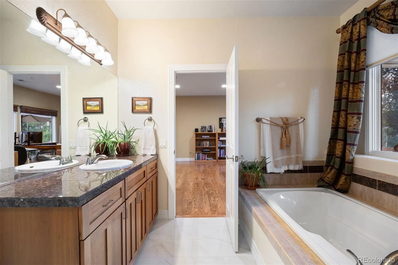 Surrounded by towering pines on a cul-de-sac, this home in The Village Castle Pines offers a beautiful blend of privacy, comfort, and nature. A flagstone walkway and front water feature welcome you to a richly detailed interior with a paneled library, formal dining room, and a gourmet kitchen with granite counters, double ovens, and an eat-in nook opening to a wraparound Trex deck. From here, enjoy mountain vistas, wildlife, and sunsets while relaxing or entertaining. The main-level primary suite is a retreat with its own deck, a two-sided fireplace, updated spa-like bath, and custom closet. The walkout lower level features a wet bar, stone fireplace, and access to multiple flagstone patios in the storybook landscaped backyard. Two lower level, en suite bedrooms and abundant storage complete the space. Recently refreshed with new flooring, updated baths, and modernized systems, this home combines timeless style, peace of mind, and extraordinary outdoor living.