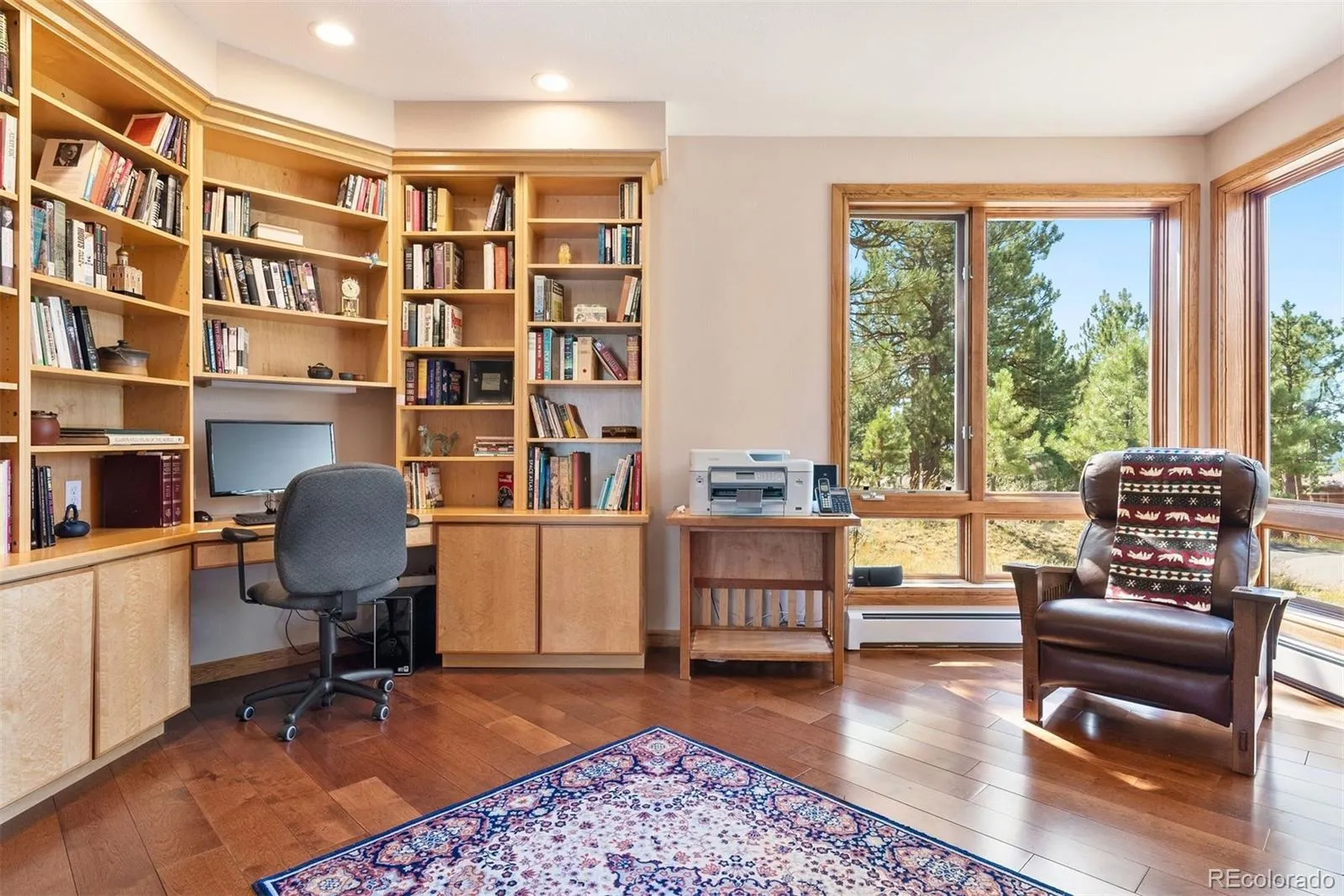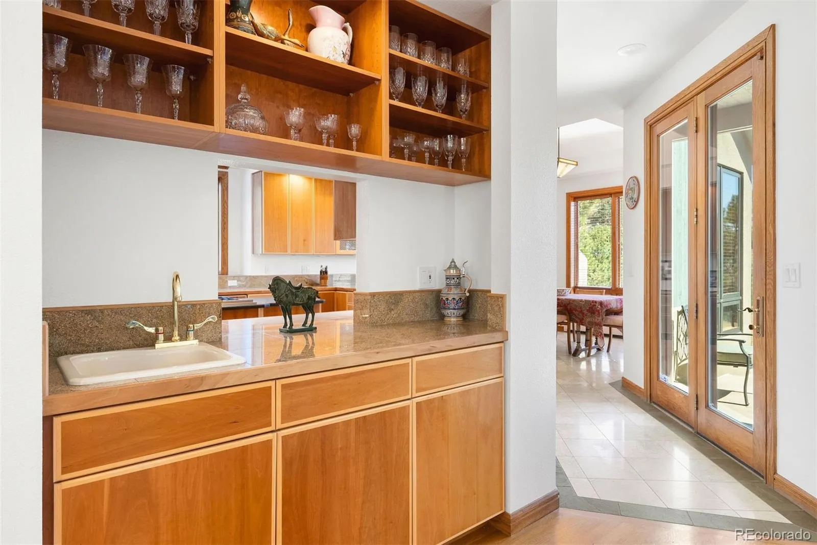 Adjoining a 10 acre meadow of dedicated Genesee open space, this Sears Barrett architectural designed custom home stands the test of time with classic lines and an enduring open floor plan. Quality finishes of custom cherry cabinetry with maple trim; hickory, oak, limestone, slate and marble flooring; hand-finished moldings; solid 8′ oak doors; triple pane skylights; lit art niches; LED and dimmer lighting throughout; metal roof plus high end appliances combine to present a beautiful living environment that is excellent for entertaining and for private relaxing time. Slate foyer is accessed from both the garage side and the expansive southwest mountain view patio side of the home. This unique entrance allows abundant guest parking on the Bristlecone cul-de-sac. Concrete driveway has full sun and is lined with a rock wall. Vaulted great room, enhanced by a solid cherry surround gas fireplace, is filled with natural light from its towering wall of windows. Formal dining room has built-in cherry buffet, mission style sconces and chandelier plus wet bar with pass-through to the 2006 remodeled Kitchen that features skylights, custom cherry cabinets, Sub-Zero, Wolf & Asko appliances, limestone flooring, bar area, breakfast nook & atrium door opening to covered patio with meadow and mountain views. Main level office features 5″ solid hickory floors & two work stations each with built-in shelving. Ideal as a Mother-in-law suite, large main level bedroom has lovely natural light, hickory floors, double closet & a remodeled full bath with walk-in tub. Powder bath & laundry complete the main level. Upstairs is the 200 s.f. primary suite with mountain view deck, big bright 5-piece bath plus his/her walk-in closets. 2nd upstairs bedroom has its own full bath, walk-in closet & bonus room access. 10′ 3″ ceiling in the unfinished basement makes it great space for your personal finishes. Enjoy walking distance to trails and to the Foothills Club House with gym and Olympic size pool.