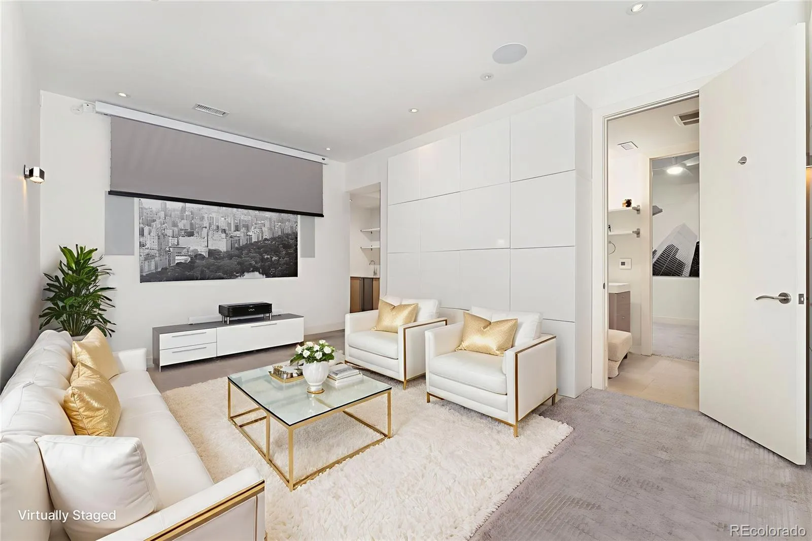 The fourth level is an entertainer’s dream, where a wet bar awaits, opening to a breathtaking rooftop patio with panoramic city and mountain views. This space is fully equipped for outdoor enjoyment, with hookups for a gas BBQ and a hot tub, creating the ultimate setting for gatherings under the Colorado sky.