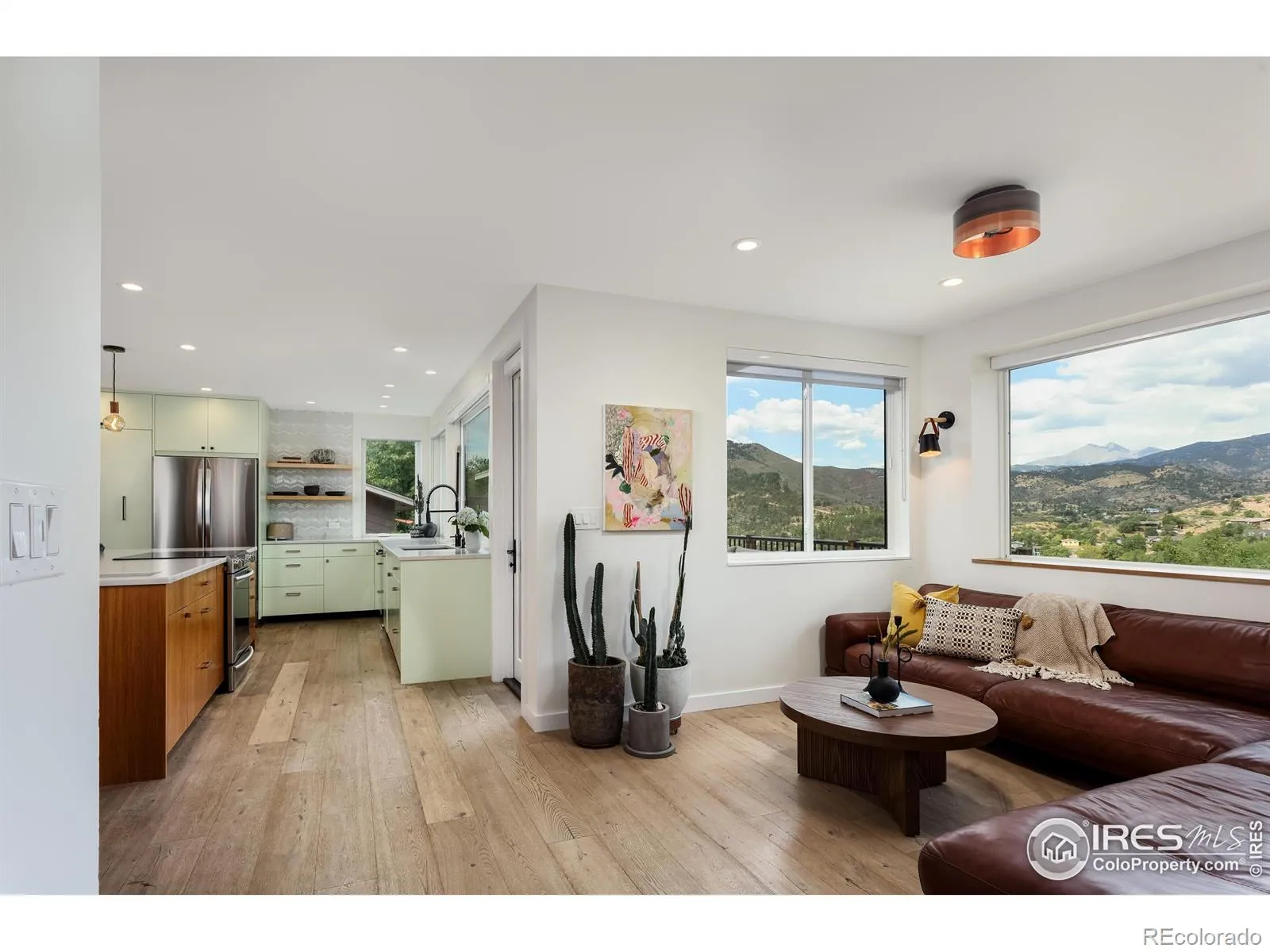 Poised above Lyons with what may be the region’s most commanding views, this modern four-bedroom, four-bath residence feels like stepping into a Monet – with Colorado as the canvas. Walls of glass transform Longs Peak and Steamboat Mountain into an ever-changing work of art. A pass-through window opens to the deck, where sunsets and mountain air elevate every meal. Lush, tiered gardens spill with seasonal color, leading to stone patios and a pergola that invite lingering conversations well into the evening. Inside, clean architectural lines and wide-plank oak floors create a harmony of warmth and design. Open-plan living spaces flow effortlessly yet retain an air of intimacy, while the bedrooms are scaled with comfort and livability in mind. The chef’s kitchen, anchored by an expansive custom island, opens gracefully into curated living and dining areas, making it both refined and effortless. Separate guest quarters, complete with kitchenette and private patio, provide visitors with independence wrapped in style. And when you desire connection, a brief golf cart ride carries you into the heart of Lyons for Moxie coffee, Marigold dining, or world-class music under the stars. In a county celebrated for extraordinary homes, this one stands as a true original offering elegance, livability, and unmatched views.