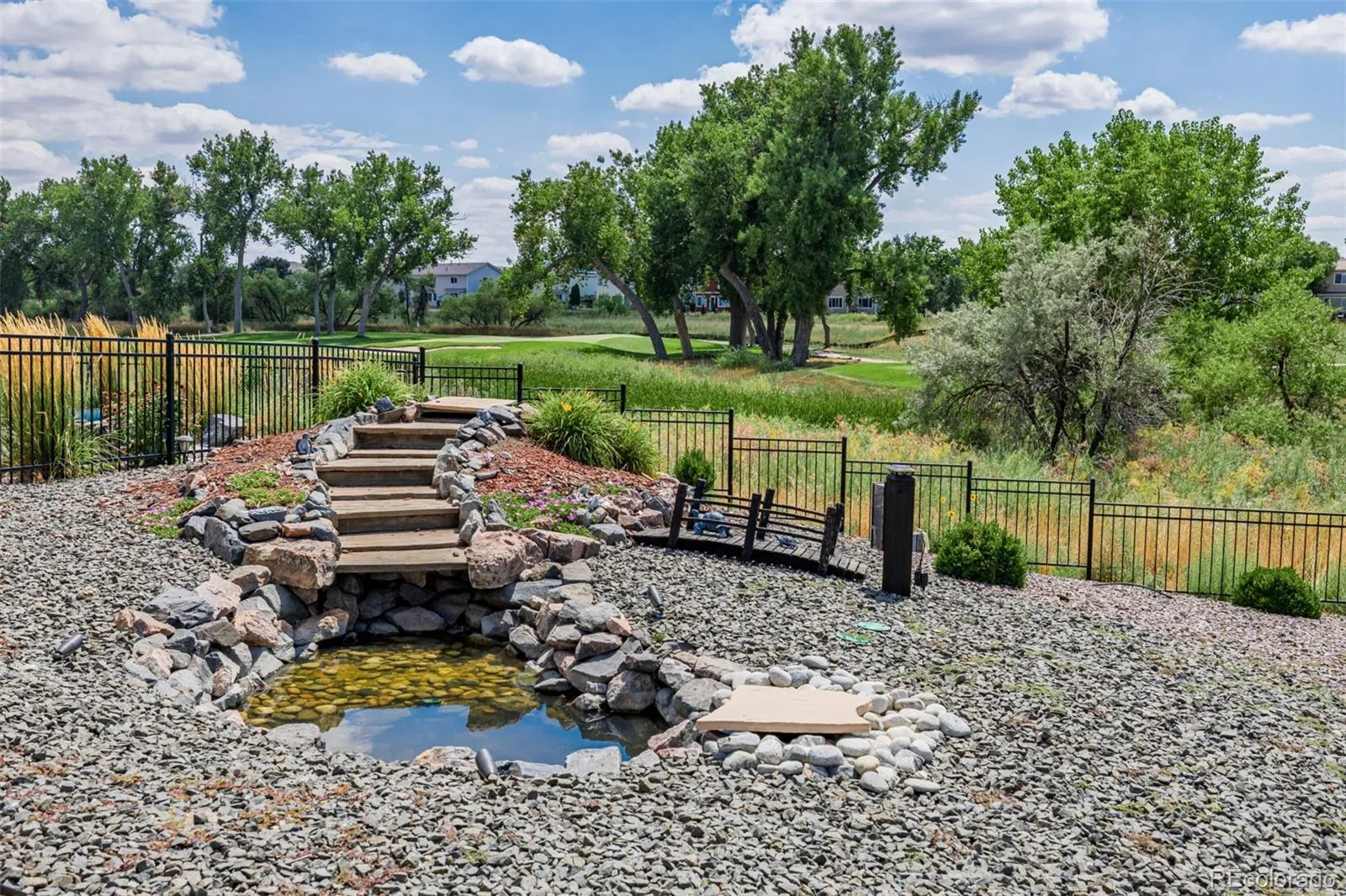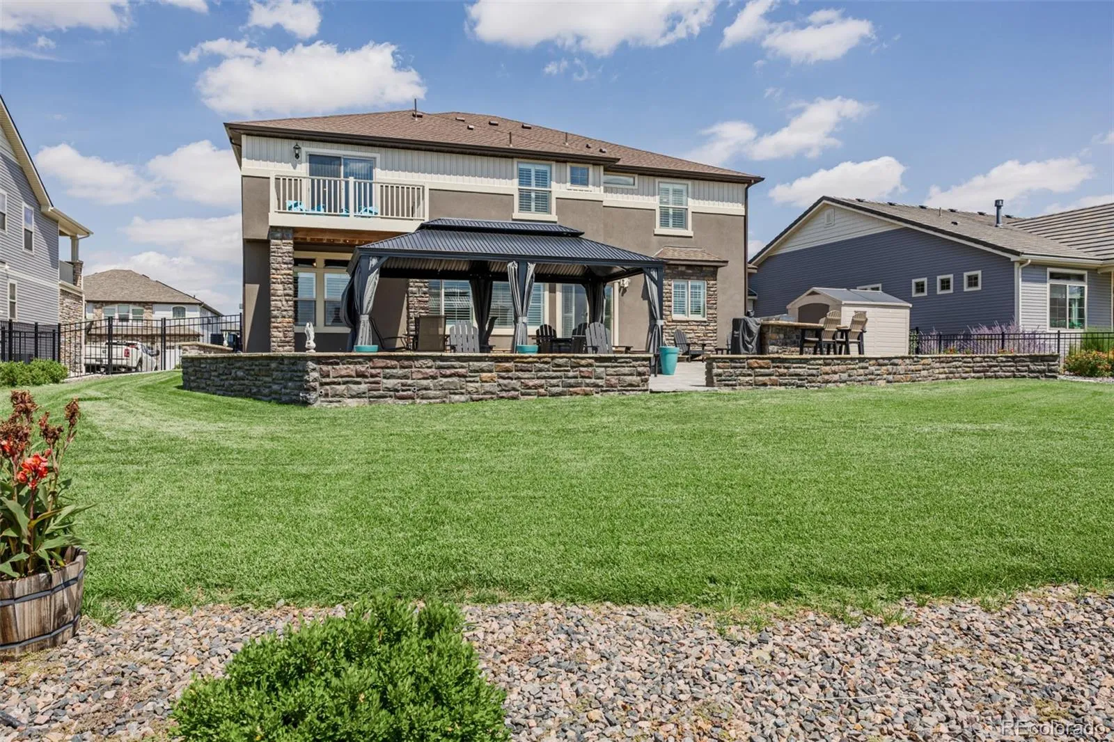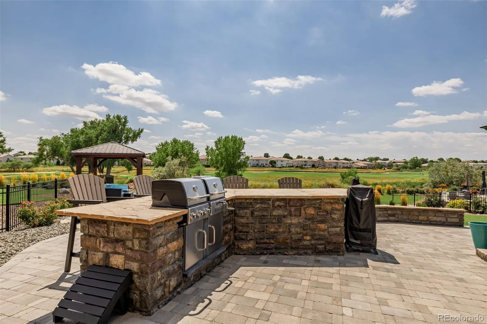 Set on a 14,734 sq ft lot (just under an acre), the backyard is a true retreat with a 1,500 sq ft patio, two gazebos (one on flagstone, one in the yard), a fire pit table, dual outdoor grills, a pond with a water feature, and professional landscaping with smart drainage.