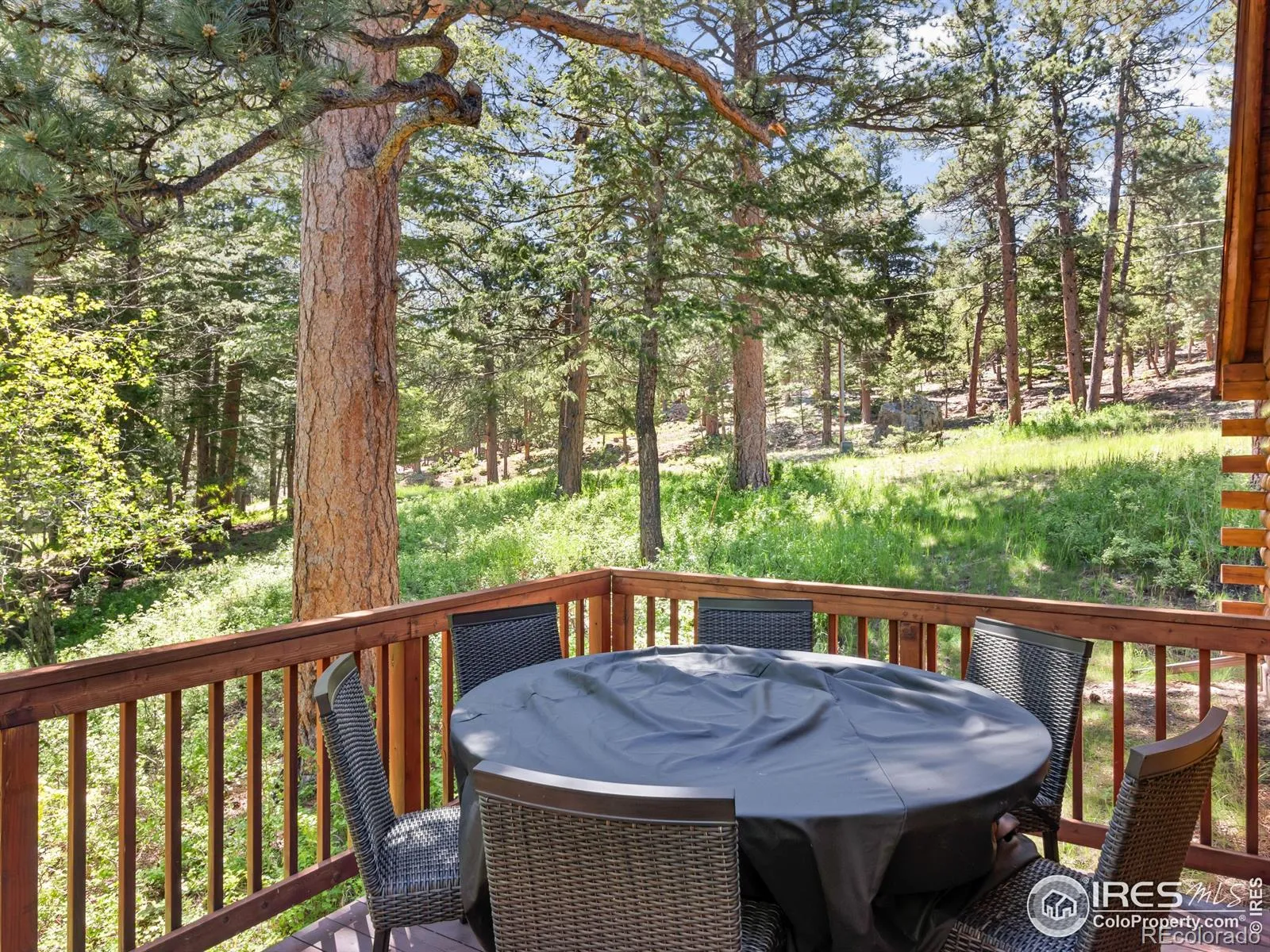Quintessential Log Cabin in the woods! Forested 1.19 acre lot with abundant Evergreens, Aspen and Wildlife. Open floor plan features a vaulted greatroom with warm woodstove, updated kitchen, 3 bedrooms , 1 bath, plus a versatile loft perfect for use as tv & game room. Updated throughout, with newer wood windows, knotty pine doors & trim, luxury vinyl flooring, laundry, interior paint, plumbing, refrigerator, well pressure tank, gutters & 200 amp electric service. Beautifully restored log exterior and inviting outdoor areas to enjoy the mountain views and shimmering aspen. Just minutes to Town, Mary’s Lake & Rocky Mountain National Park. Furnishings negotiable. Ideal year round living or a weekend getaway, this is the one you’ve been waiting for…