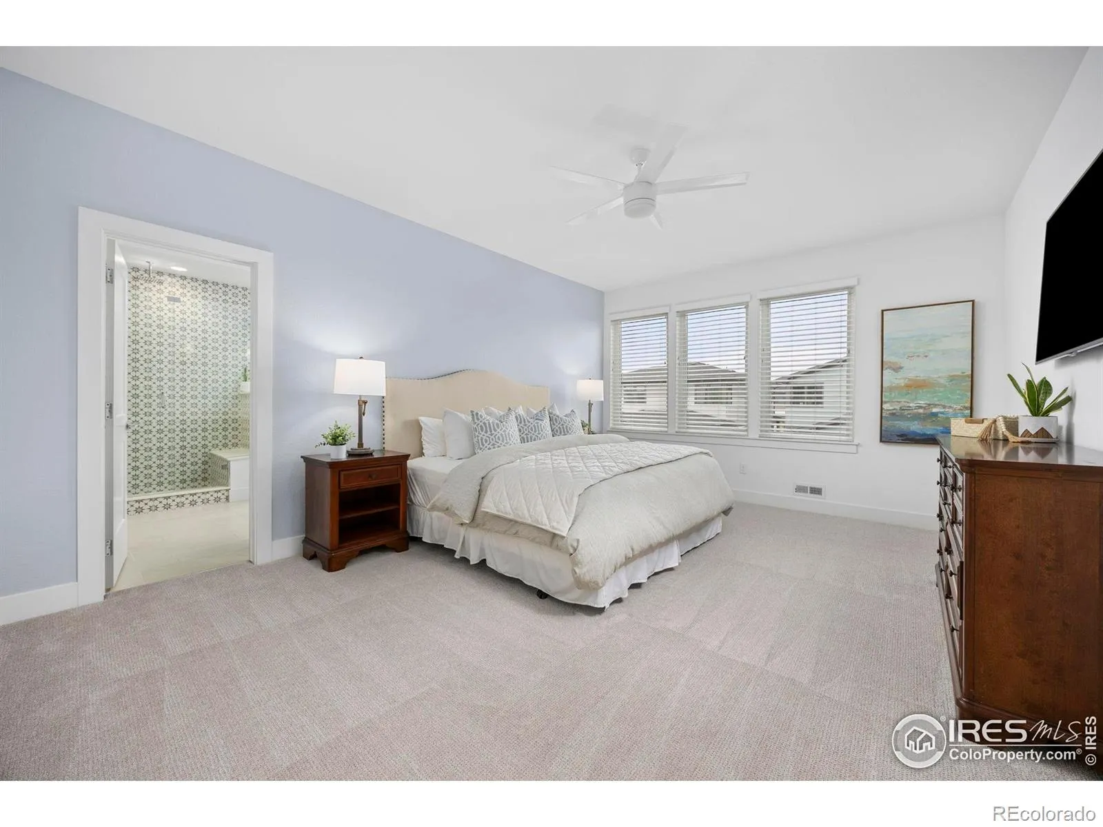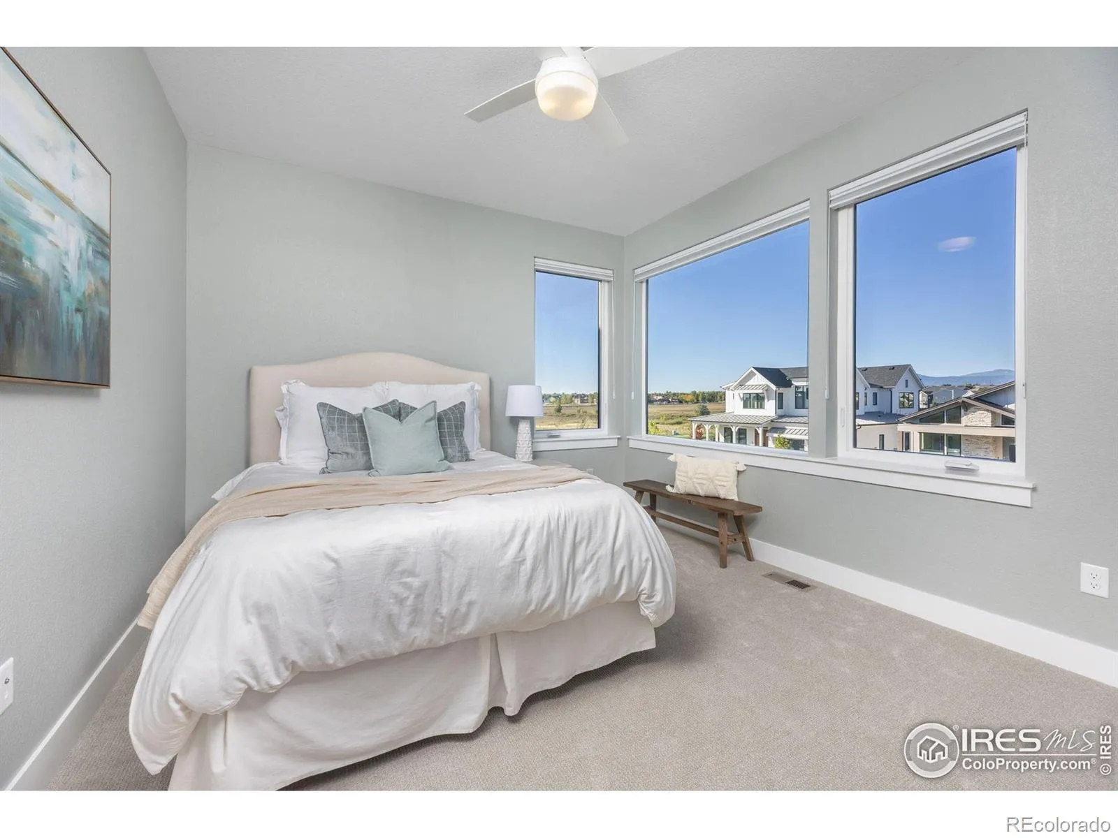 Step into effortless style in this beautifully upgraded home tucked within one of southwest Longmont’s most sought-after neighborhoods, West Grange, where scenic trails wind throughout the community and Silver Creek High School and Blue Mountain Elementary are just a short walk away. From the covered front porch, step into a sunny home office with south-facing windows, perfectly paired with a stylish powder bath nearby featuring designer wallpaper and fixtures. The main level welcomes you with gleaming wood plank floors and is filled with natural light, where soaring ceilings and expansive windows create a bright and open feel. The kitchen shines with white quartz counters, a designer backsplash, gas range, and upgraded navy and white cabinetry. The adjacent dining room, surrounded by windows, overlooks the spacious covered patio and reimagined backyard with an expanded, modern concrete patio and grassy play area. Pleated window coverings throughout the living space add both style and privacy while a gas fireplace serves as an inviting focal point in the living room. Upstairs, retreat to a serene primary suite with a spa-inspired five-piece bath complete with a freestanding soaking tub and glass-enclosed rain shower. Two additional bedrooms enjoy stunning mountain views and southern exposure, while a convenient laundry room rounds out the upper level. Brand-new carpet and custom window coverings, including blackout shades in the secondary bedrooms, bring comfort and refinement. The unfinished basement offers endless possibilities, ready to be transformed into a recreation room, guest suite, or fitness area. Don’t miss the mudroom and epoxy-finished 3-car tandem garage, both practical and polished.