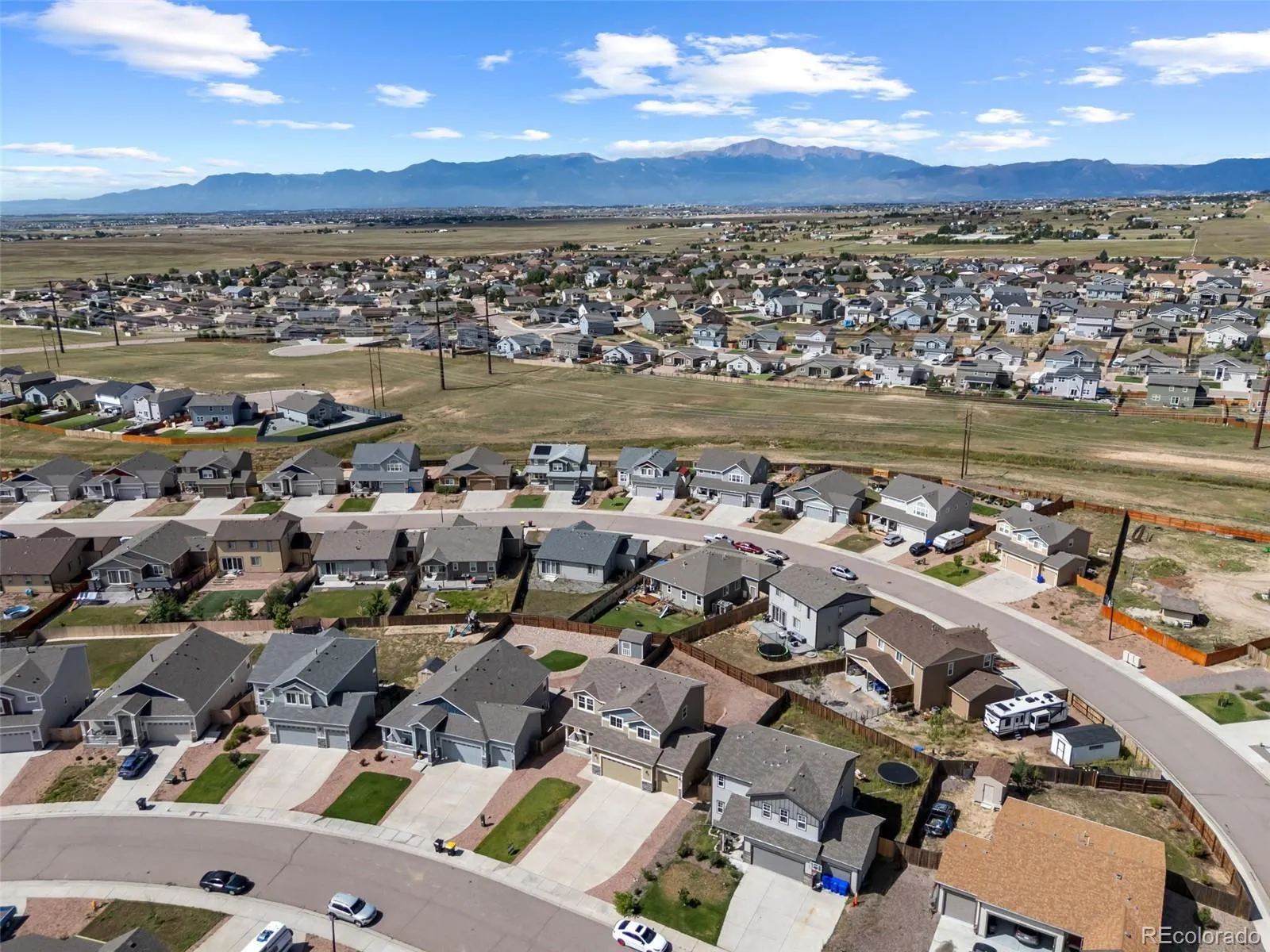 Assumable loan and no monthly HOA or metro fee! Situated on nearly a quarter-acre lot, it features mountain views, a finished walk-out basement, and an oversized 3-car garage with additional front parking for an RV, trailer, or boat. Enjoy relaxing on the front covered porch before stepping inside to an open-concept main level filled with natural light and views of Pikes Peak. A front room with French doors offers the perfect space for a home office or recreation area. The spacious kitchen includes 42” upper cabinets, granite countertops, a pantry, stainless steel appliances, and ample counter space, all while showcasing stunning mountain views. Step onto the deck to take in breathtaking sunsets while dining or unwinding. The dining area accommodates an 8+ person table, and the living room comfortably fits a large sectional and big-screen TV. Upstairs, a versatile loft provides room for a secondary seating area, playroom, or reading nook. The primary suite serves as a private retreat with a 5-piece bath featuring a deep soaking tub, tiled walk-in shower, double vanity, and walk-in closet. Three additional bedrooms and a full bath with double vanity complete the upper level. The fully finished walk-out basement offers a wet bar, wired for a home theatre and audio, office space, large bedroom, 3/4 bath with walk-in shower, and additional storage under the staircase. The fully fenced backyard includes a patio and fire pit, perfect for outdoor gatherings. Enjoy year round comfort with central A/C and upgraded Class IV Roof. All appliances included w/washer & dryer. Conveniently located near Peterson SFB, Schriever SFB, and the USAF Academy, with easy access to shopping, dining, schools, and outdoor recreation.
