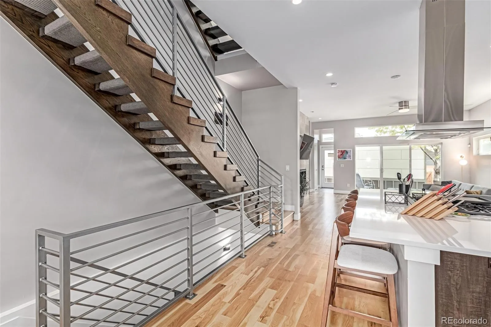 At the heart of the home, the gourmet kitchen is a true showstopper, featuring elegant quartz countertops, sleek flat-panel cabinetry, stainless steel appliances, a stylish subway tile backsplash, and a spacious island with a breakfast bar—perfect for casual dining and entertaining. The bright and airy living room boasts soaring ceilings, a striking contemporary concrete finish, rustic wood flooring, and a cozy gas fireplace, creating the perfect setting for both relaxing evenings and entertaining guests.