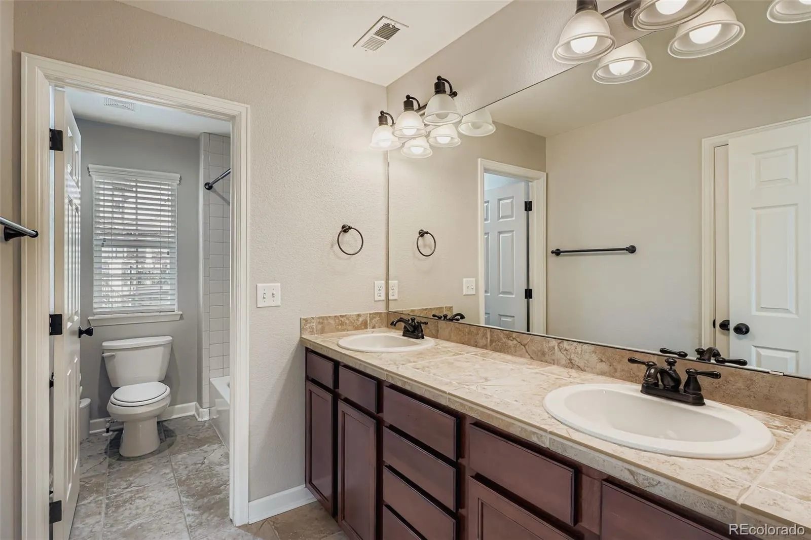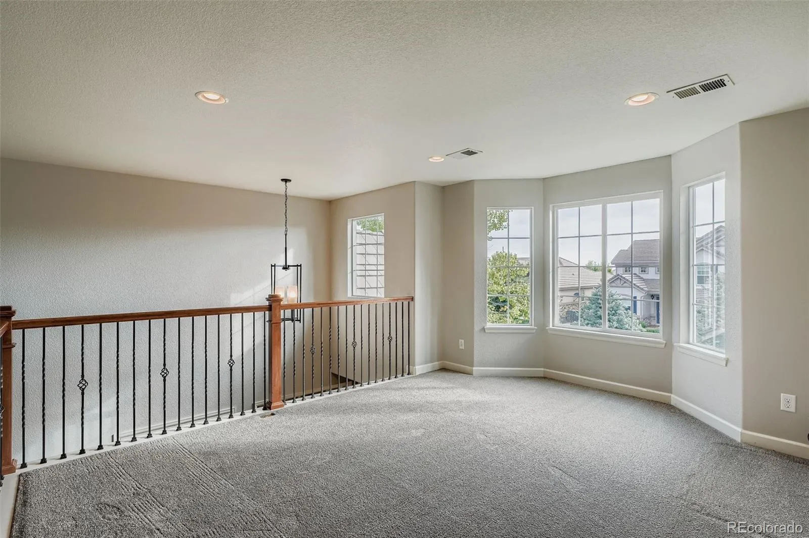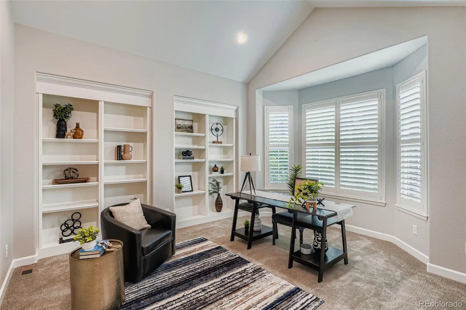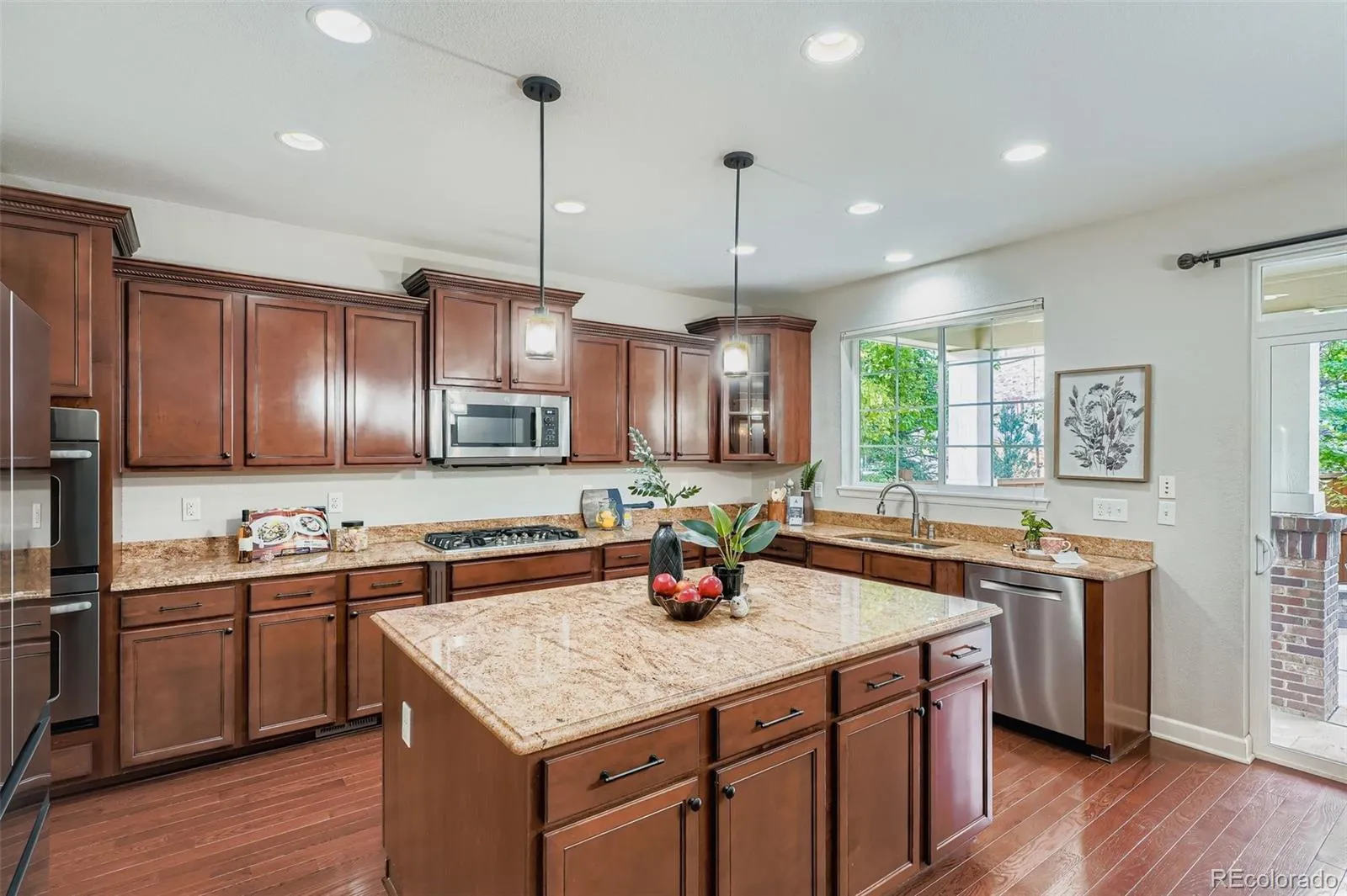 This beautifully maintained, model-like home in the desirable Richmond Estates Collection at Meridian Village shows true pride of ownership and exceptional curb appeal. Offering 4 bedrooms, 2.5 baths, plus a loft, and a full unfinished basement ready for your personal touch, this home blends style, comfort, and flexibility. The main floor flows beautifully with cherry wood floors, a private office with built-in shelving and French doors, a formal dining room with crown molding, and a convenient powder room. The spacious main-floor primary suite features a 5-piece bath with a soaking tub and a large walk-in closet. The living room boasts a 20’ ceiling and gas fireplace, opening seamlessly to a gourmet kitchen with a large granite island, stainless steel appliances, double ovens, gas cooktop, and abundant cabinet storage. A laundry room with utility sink, generous storage, and washer/dryer included adds convenience. Upstairs offers a loft with bay window and three secondary bedrooms. The professionally landscaped backyard includes a covered patio and extended hardscape wrapping to the side. Enjoy Meridian Village amenities, scenic trails, and a prime Parker location near parks, top-rated schools, shopping, light rail, and easy access to I-25.