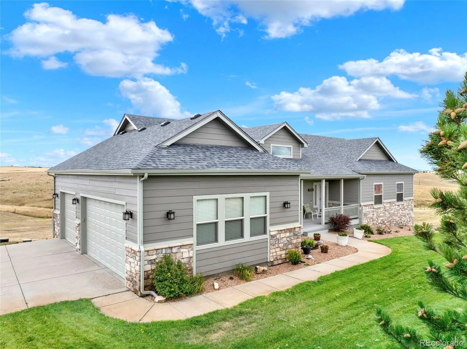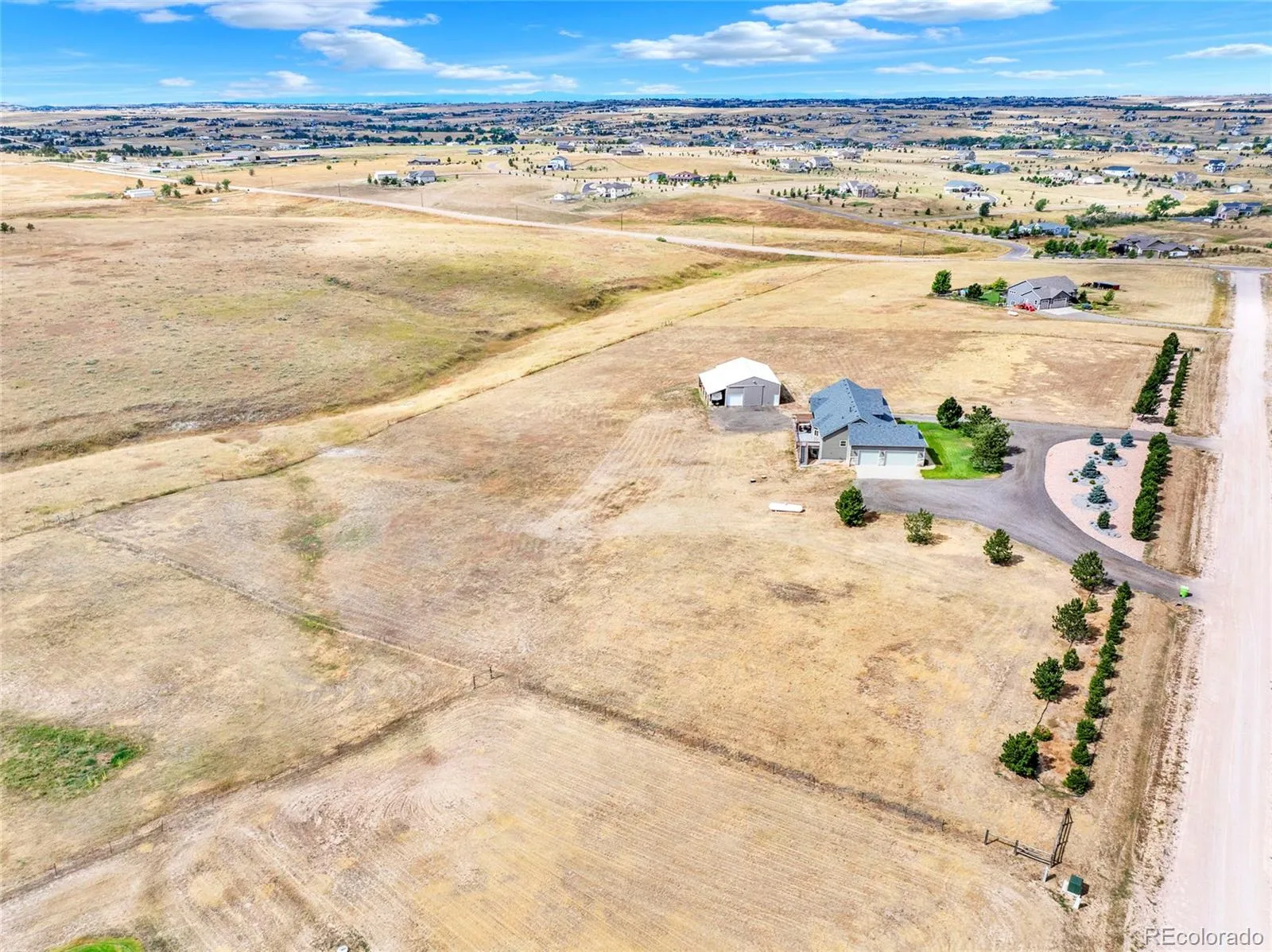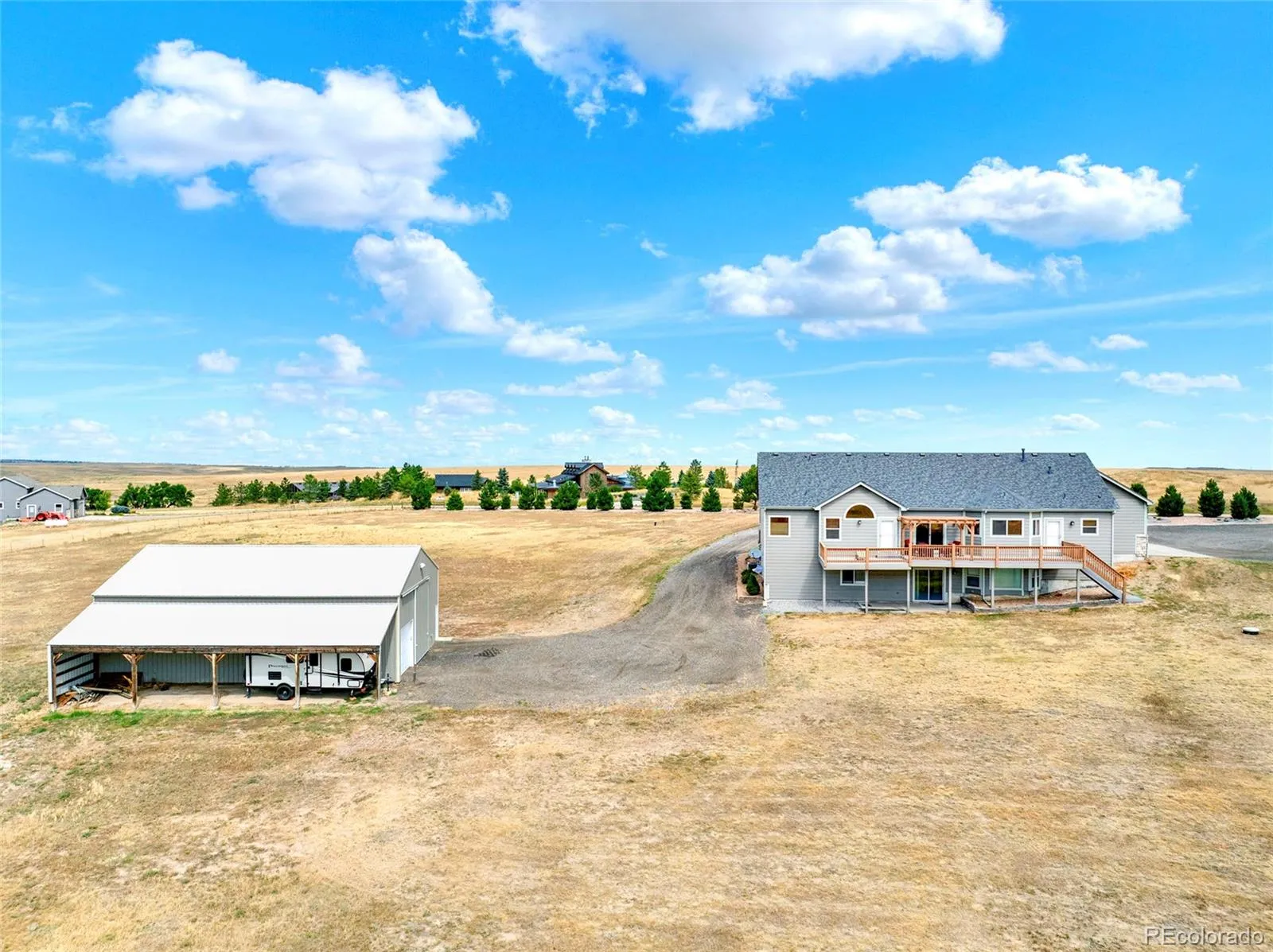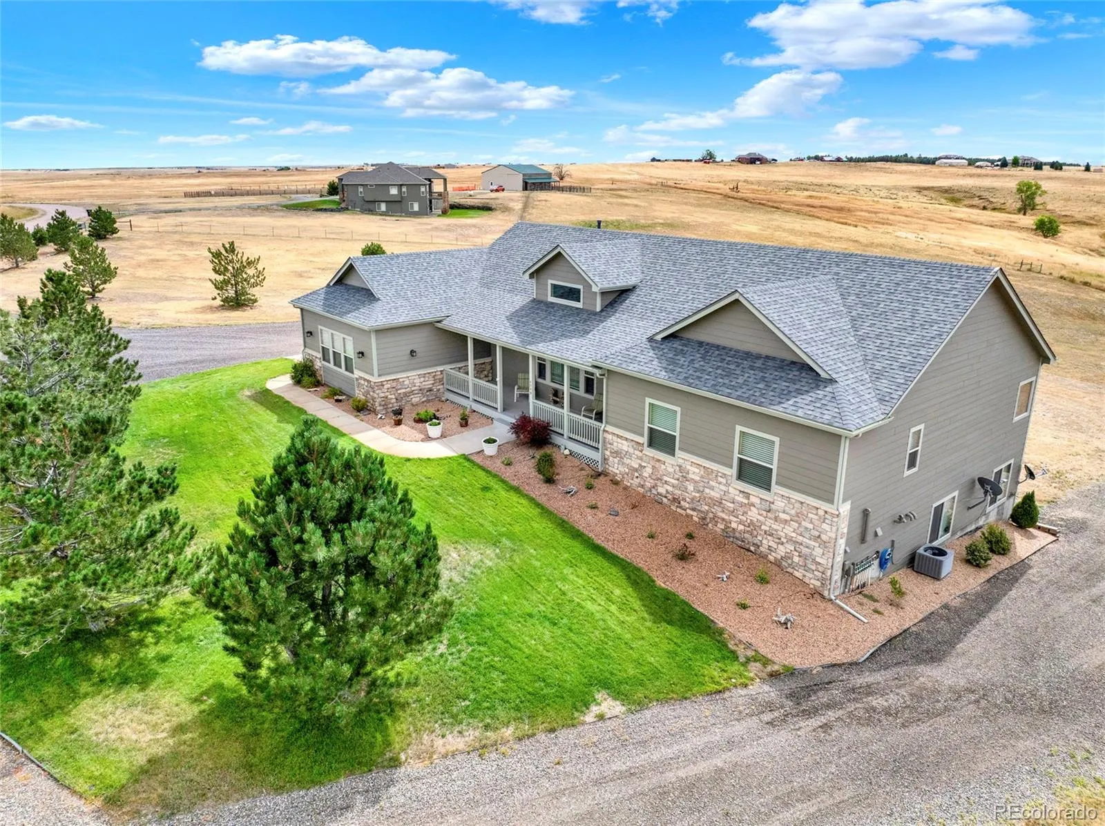 Plenty of room to roam—inside & out! This well-maintained 7-acre property is beautifully landscaped & showcases breathtaking mountain views. Enjoy the serenity of country living while staying close to the city—just 15 mins to Parker & 10 mins to Southlands Mall. The 4-bedroom, 4-bath home offers 4,526 sq. ft. of living space across two levels. On the main floor (2,279 sq. ft.), you’ll find vaulted ceilings, a cozy gas fireplace, hardwood floors throughout the kitchen, dining, & hallway, plus 3 spacious bedrooms. The primary suite opens directly to the back deck & features a luxurious 5-piece bath with dual sinks, soaking tub, & separate shower. The kitchen is complete with a large island, knotty alder cabinets, & all appliances included—refrigerator, range/oven, dishwasher, & microwave. Convenient main-level laundry makes everyday living simple. The walkout basement (2,247 sq. ft., 1,550 sq. ft. finished) offers endless versatility w/ its own private entrance. It includes a large family room, additional bedroom, full bath with sauna, & a dedicated office, which includes a desk, shelves, & cabinets, all of which will remain with the house. You’ll also find abundant storage & a large utility room housing the systems that keep the home running efficiently. Outside, an attached 3-car garage provides ample parking, while a 36’x48’ outbuilding adds even more functionality. The outbuilding includes a carport for RV parking, electricity, & a garage door opener. Both the home & outbuilding were updated w/ new Class 4 roofs & gutters just 1.5 years ago. The house was freshly painted at the same time. Additional features include a tankless water heater, water softener, radon mitigation system, 1,250-gallon septic tank, & a 1,000-gallon propane tank (owned outright & staying w/ property). The yard is irrigated w/ 9 watering zones for effortless upkeep—using free water! Best of all—no HOA restrictions. This property offers the freedom, space, & lifestyle you’ve been waiting for!