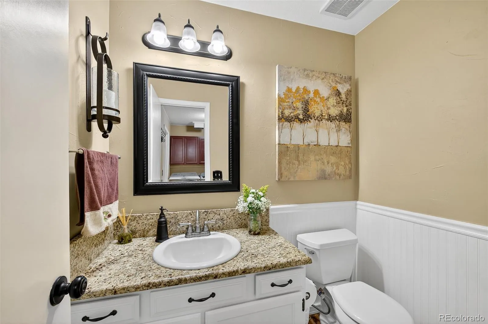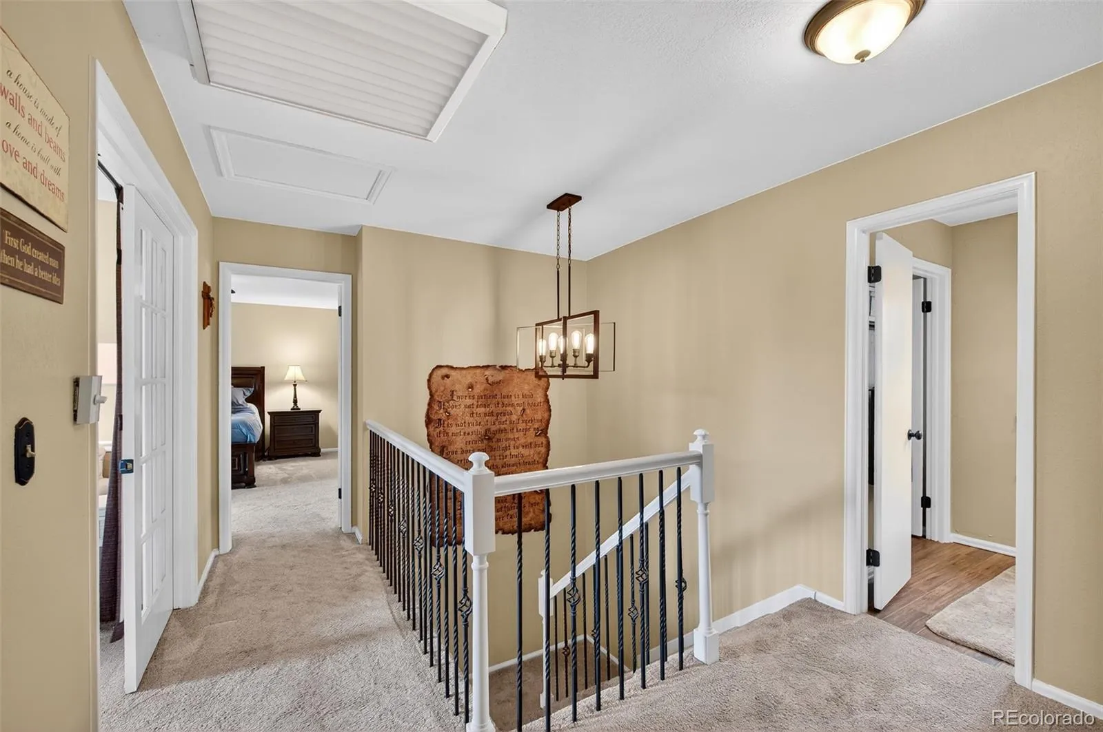 NEW CLASS 4 IMPACT RESISTANT ROOF JUST INSTALLED! Step into the elegant foyer, complete w/an Adagio wall water feature and beautiful rock accent wall, setting the tone for what awaits inside. The spacious living room boasts a beautiful bay window that fills the space w/natural light, highlighting AquaGuard laminate flooring that flows throughout the main level. Seamlessly connected, dining room offers crown molding, chair rail, and large window—perfect for gatherings and formal meals. The kitchen is both stylish and functional w/granite counters, stainless steel appliances, and cozy dining nook framed by bay window overlooking lush backyard. Just off kitchen, family room makes a statement w/dramatic rock wall and wood-burning fireplace, creating the perfect space to relax on winter evenings. The main level is completed w/laundry room and a half bath featuring updated granite counters and shiplap walls. Upstairs, wrought-iron spindles and freshly painted railing lead to the impressive primary suite. A bay window w/ sitting area creates a serene retreat, while a sliding barn door opens to the spa-like bathroom w/updated granite counters and cabinetry, and walk-in closet. The second full bath has been updated w/AquaGuard tile flooring, and granite counters. French doors reveal versatile bedroom ideal for office/guest room, complemented by two add/l bedrooms. The finished basement expands your living space w/bsmt suite w/one bedroom w/bonus room attached and ¾ bath. Outdoors, enjoy your own private oasis—a tranquil covered patio, mature and updated landscaping, and fully fenced yard. Additional highlights include updated Champion double-pane windows main and upper level, 3 Day Blinds main and upper level, cement patio, decorative cement front walkway and driveway, updated sprinkler system, 8×15 Teds Shed W/NEW CLASS 4 IMPACT RESISTANT ROOF, newer refrigerator and dishwasher. This thoughtfully updated home combines style, comfort, and function, ready for you to move in!