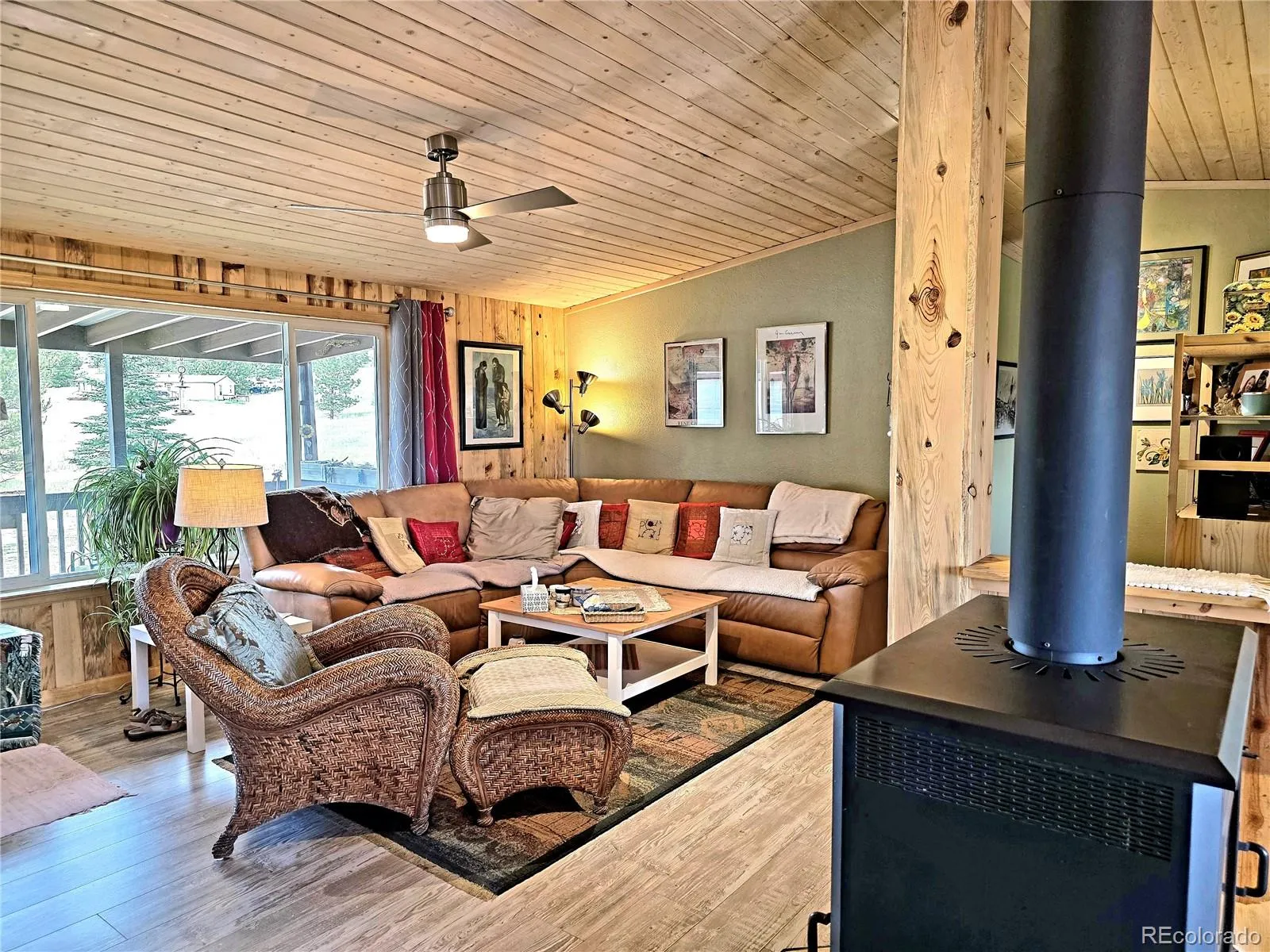 You’ll love calling this fabulous property home! Remodeled mountain gem on 2+ acre corner lot, has all new windows & doors. In CME w/3 car garage, this very homey abode w/ Natural Gas is a must see! Upon entering you’ll notice warm tongue & groove pine wood ceilings & walls, the double sided free standing woodburning fireplace, perfectly situated between the LR & DR, for all around enjoyment. The DR boasts new French doors for access to the level back yard and new stone patio. All will enjoy the large, spacious kitchen with eat in nook, plentiful cabinetry & storage pantry. The laundry room has storage too, with updated and cozy T&G wood, + exterior door to RV parking area. 2nd bed is spacious with wonderful natural lighting your plants will love, features 2 storage closets; 1 walk-in, 1 large w/shelving for all storage needs. Walk down the beautiful newly tongue and grooved hallway back to the main living areas, towards the primary suite on the opposite end of the home. The primary offers a wonderful, spacious walk in closet, a large attached bath through French doors with a soaking tub, dual sinks, free standing shower, plentiful storage and a recessed linen closet. Last but not least, walk out to your private deck to the backyard with large overhead pine tree for shade, equipped with it’s very own sweetly singing birds. The homes spacious back yard is fenced, has a storage shed, a new stone patio and matching stone stairs. You’ll also enjoy the covered front porch for evening sunsets or your morning coffee, with it’s West facing mountain and meadow views all around. The detached 3 car garage is spacious, has a new picture window for plenty of natural light to enjoy your views while working, an overhead heater, as well as a ramp from the home to the garage for accessible access. Home is wired for a generator! Whether you’re looking for a vacation home or everyday mountain living, pride of ownership shows in this lovingly updated, inviting home to call your own!