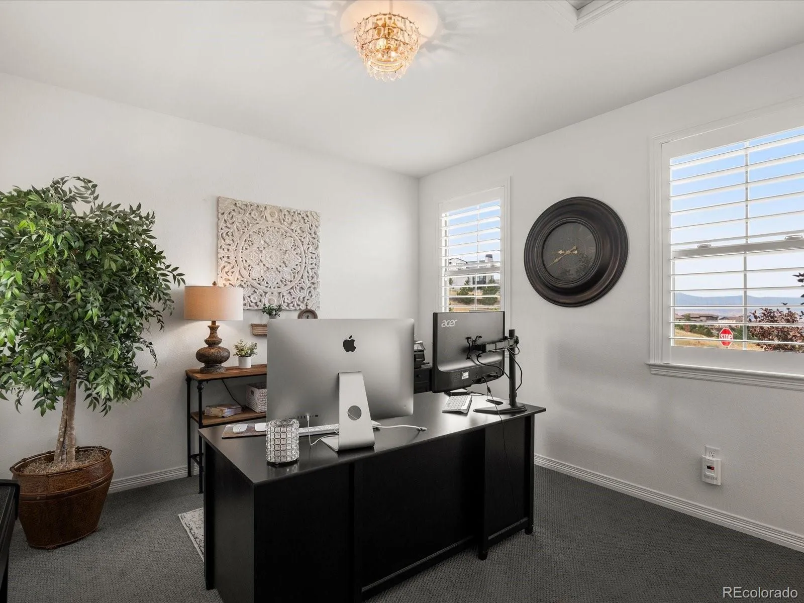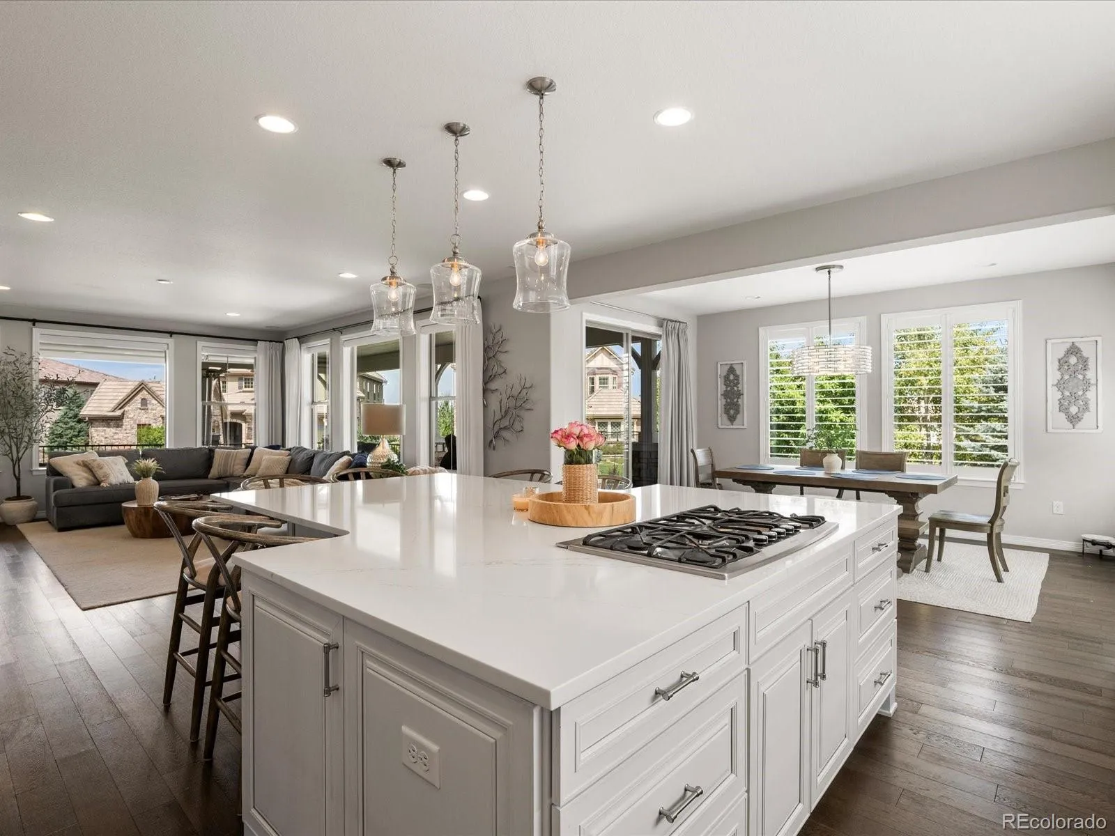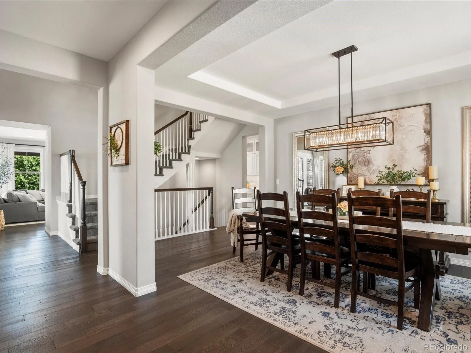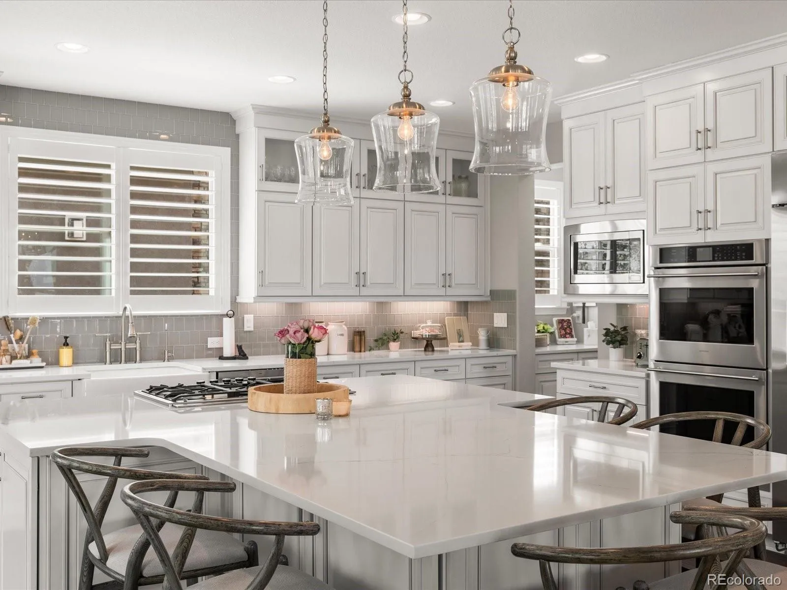 Welcome to this stunning 6-bedroom, 6-bathroom home in the highly sought-after Backcountry neighborhood of Highlands Ranch, where breathtaking sunsets and mountain views can be enjoyed from the expansive wraparound back patio. The professionally landscaped yard is perfect for entertaining, offering space to play, lounge by the gas fire pit, or dine under the Colorado sky. Inside, the main floor showcases a massive chef’s kitchen with butler’s space, two pantries, a huge island with new quartz countertops and farmhouse sink, a spacious living room wrapped in windows with remote-controlled treatments and a cozy fireplace, a formal dining room, a private office, a bedroom with en-suite bath, plus a half bath and laundry room. Upstairs features four additional bedrooms and three full bathrooms, including a luxurious primary suite with fireplace and spa-like 5-piece en-suite. The finished basement boasts a large rec room with surround sound for movie nights, a guest bedroom with full bath, and over 1,190 sq ft of unfinished space ready for your vision. With three garage spaces, designer finishes, and resort-style community amenities, this Backcountry beauty is the perfect blend of luxury and comfort.