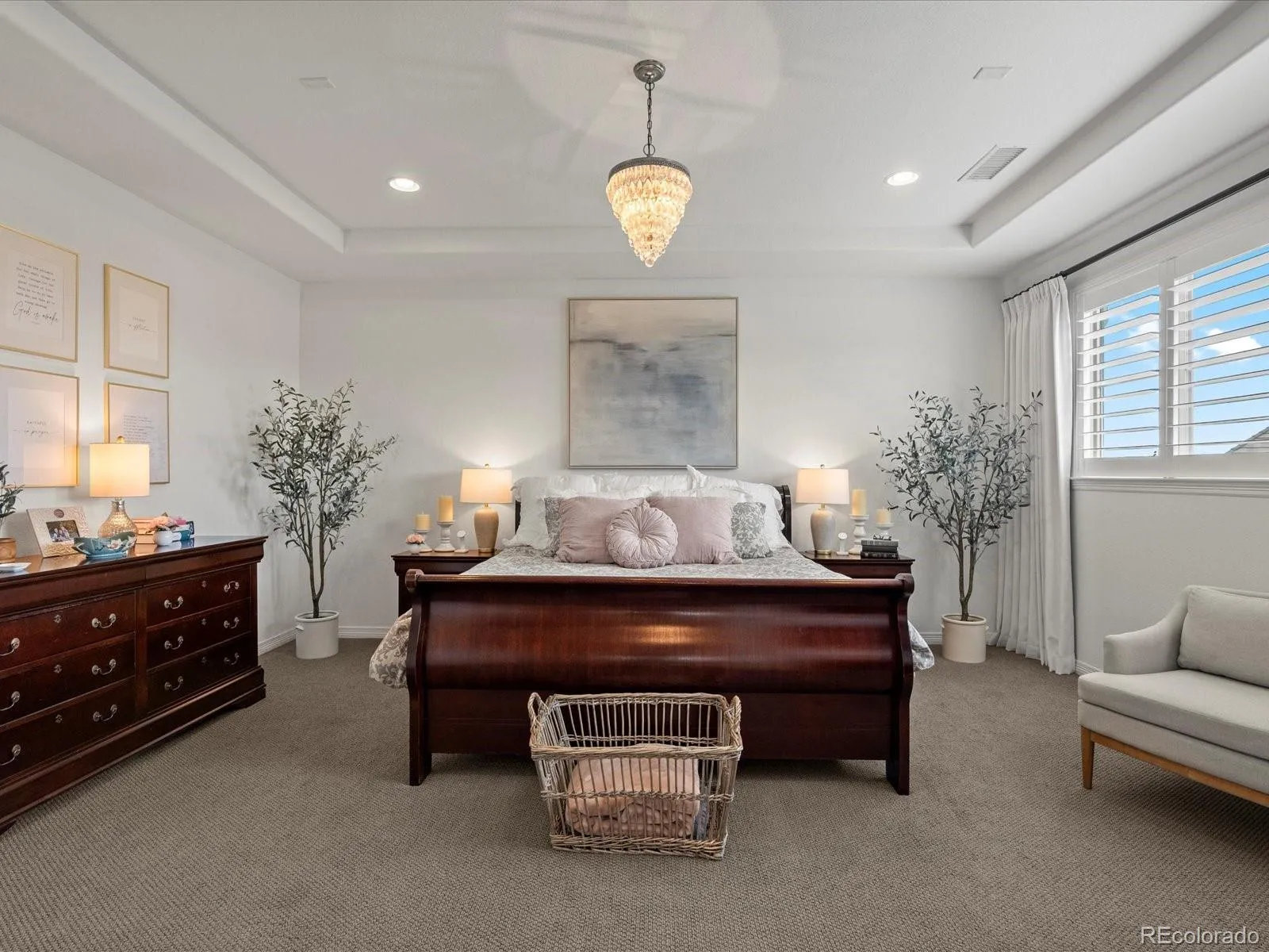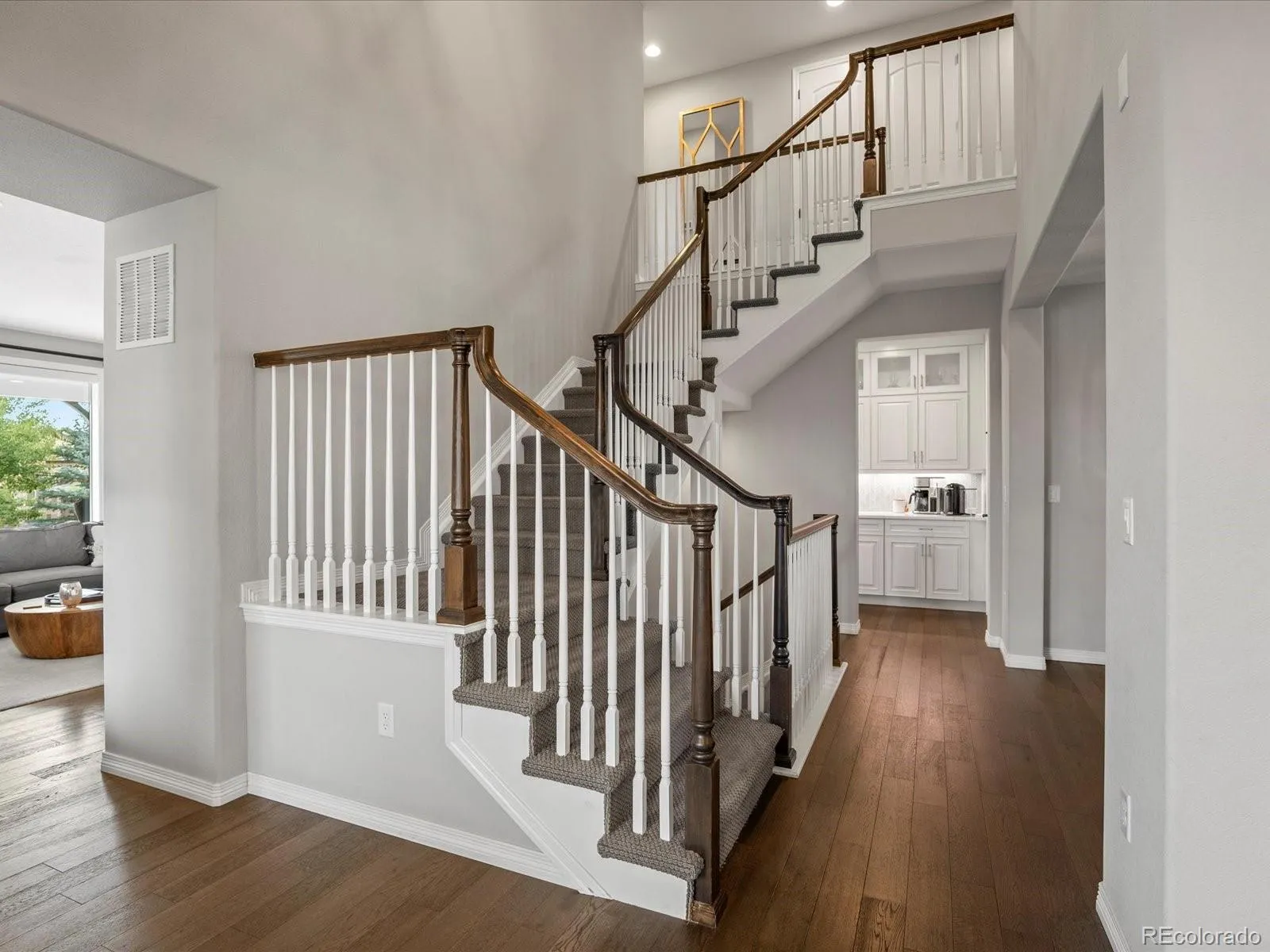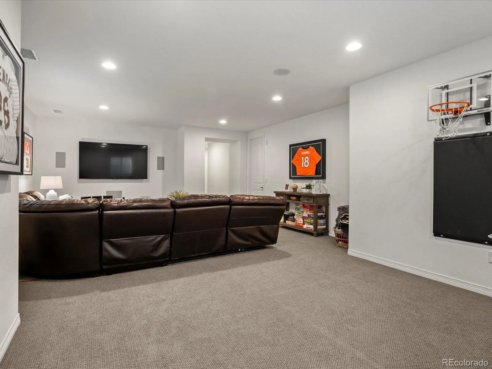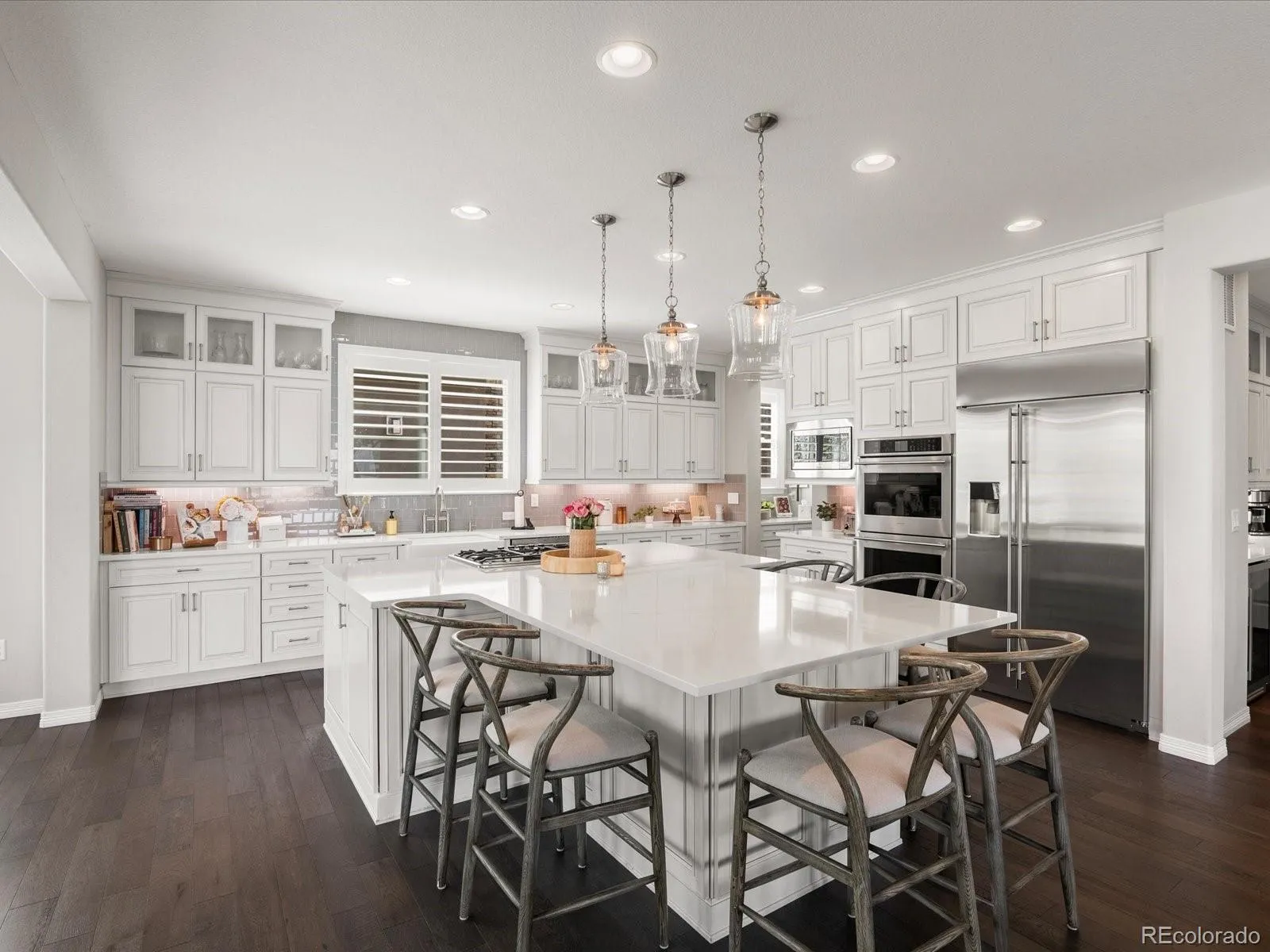 Welcome to this stunning 6-bedroom, 6-bathroom home in the highly sought-after Backcountry neighborhood of Highlands Ranch, where breathtaking sunsets and mountain views can be enjoyed from the expansive wraparound back patio. The professionally landscaped yard is perfect for entertaining, offering space to play, lounge by the gas fire pit, or dine under the Colorado sky. Inside, the main floor showcases a massive chef’s kitchen with butler’s space, two pantries, a huge island with new quartz countertops and farmhouse sink, a spacious living room wrapped in windows with remote-controlled treatments and a cozy fireplace, a formal dining room, a private office, a bedroom with en-suite bath, plus a half bath and laundry room. Upstairs features four additional bedrooms and three full bathrooms, including a luxurious primary suite with fireplace and spa-like 5-piece en-suite. The finished basement boasts a large rec room with surround sound for movie nights, a guest bedroom with full bath, and over 1,190 sq ft of unfinished space ready for your vision. With three garage spaces, designer finishes, and resort-style community amenities, this Backcountry beauty is the perfect blend of luxury and comfort.