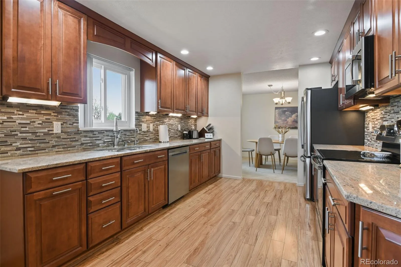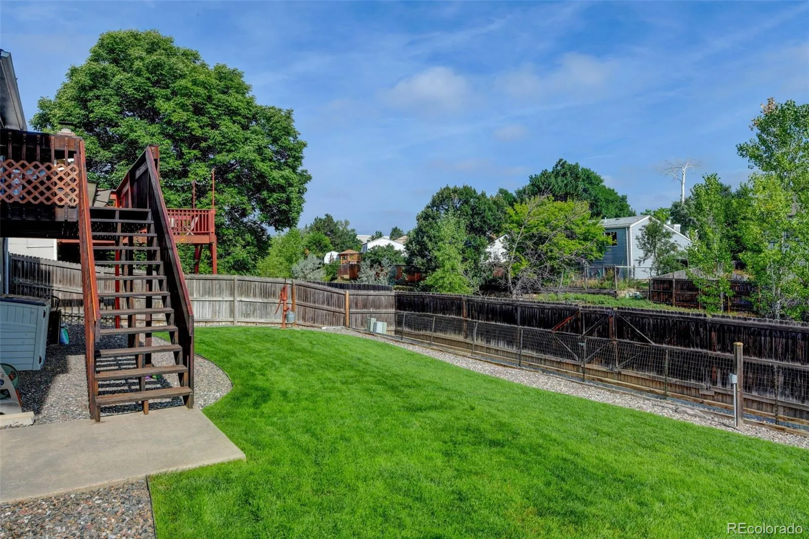 Beautifully updated 2-story home with a walkout basement backing to an open space / walking path! This is a wonderful home, with a desirable floor plan having four bedrooms upstairs! The main floor is spacious, with a living room, formal dining room, a wonderfully remodeled kitchen with newer cabinets, slab granite counters, under cabinet lighting stainless appliances, and it is open to the main floor family room with a fireplace! The walkout basement is fully finished, offering a spacious family room with a gas fireplace, and two additional spaces ideal for a home gym, a home office, or additional bedrooms if needed! Walking out to the back deck from the main level one sees how private the back yard is, with only the neighbors on each side as the back view is open space! The back yard is in impeccable condition and there’s room for a garden at the back fence. Updates to the house include Updated vinyl windows from Simonton that have a lifetime transferrable warranty, a 6-yr old roof with impact resistant shingles, solar panels that are leased, but the lease has been prepaid so no cost to the buyer! In addition, the central air-conditioning is 2 years old! Sheridan Green is a great neighborhood just a short walk from dining, entertainment, and shopping! Every detail in this house has been meticulously addressed in this amazing home!