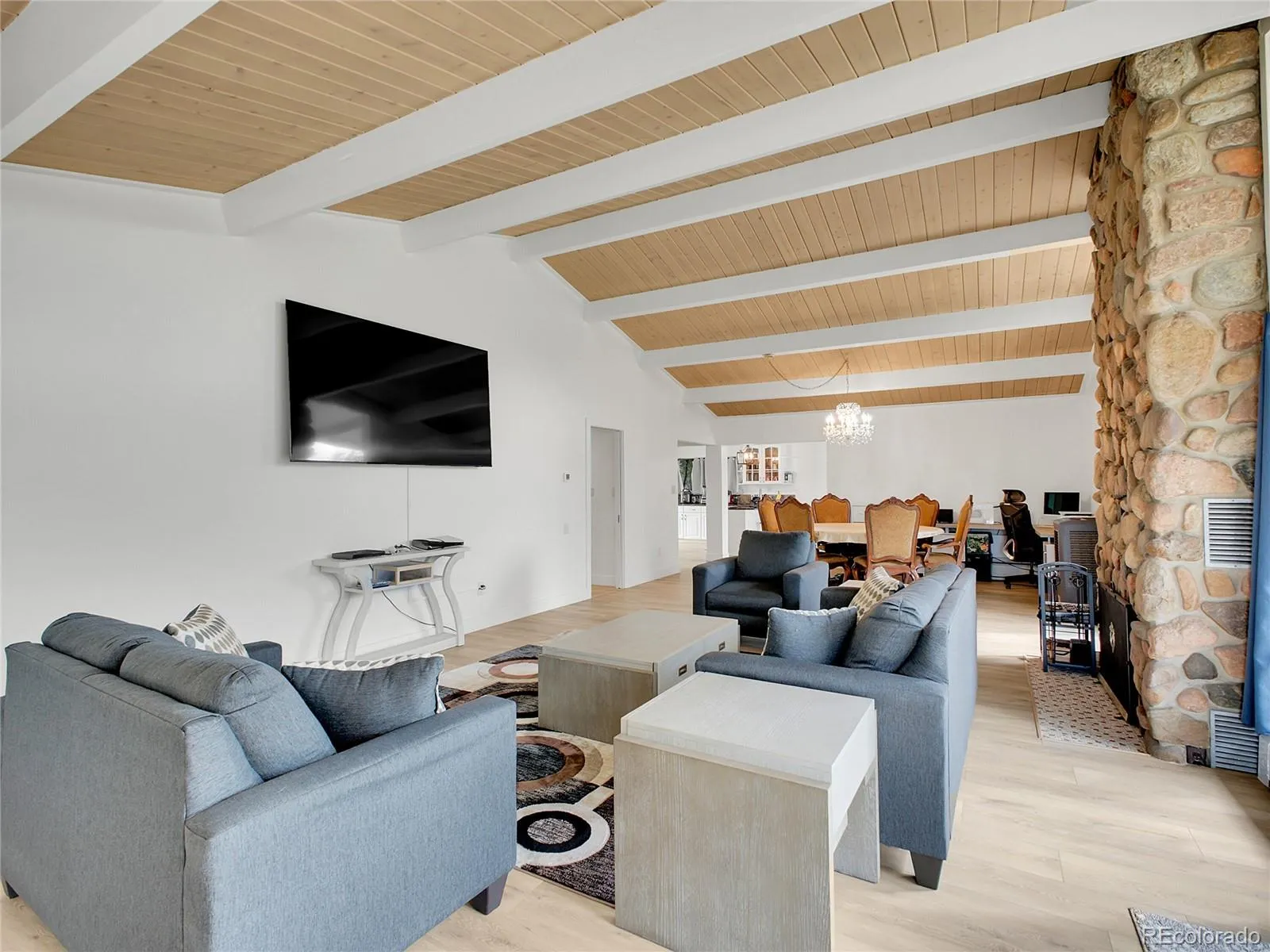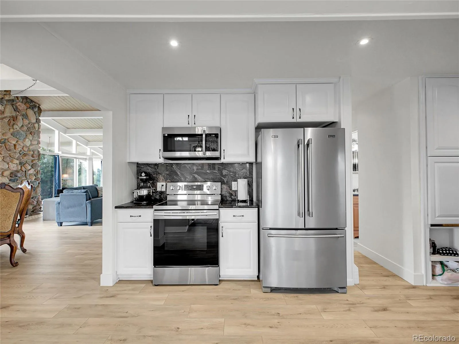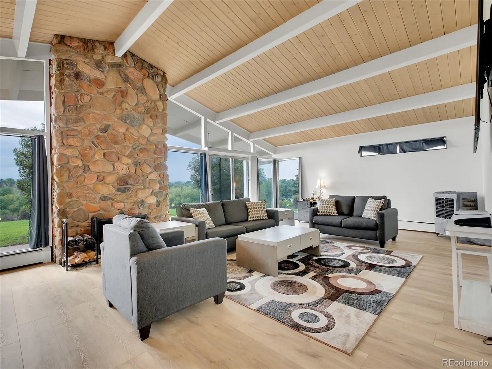 Inside, you’ll find a Colorado rock fireplace anchoring the great room and a second fireplace warming the family room. The home’s open floor plan and abundant windows bring natural light inside and frame the surrounding beauty. The primary suite is tucked away for privacy, complete with an ensuite bath and its own private balcony—perfect for morning coffee. Recessed lighting adds a modern touch throughout.