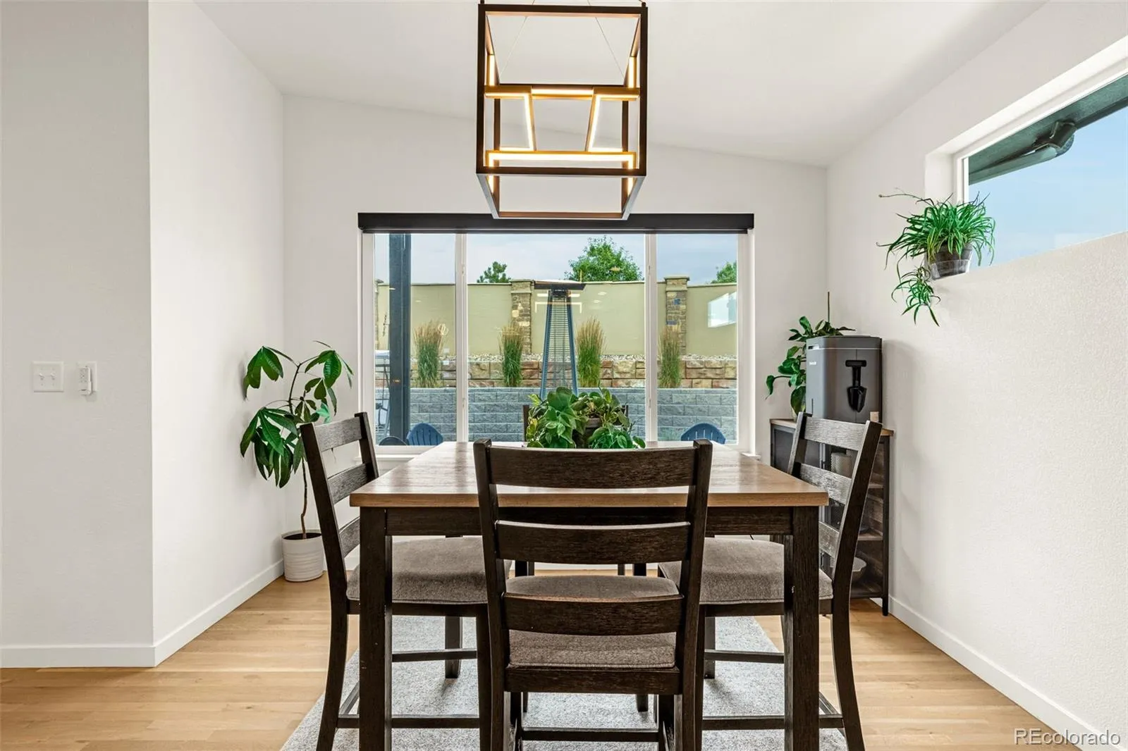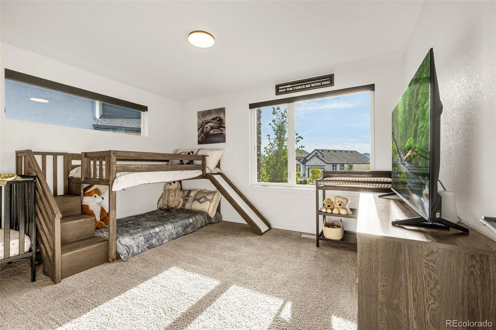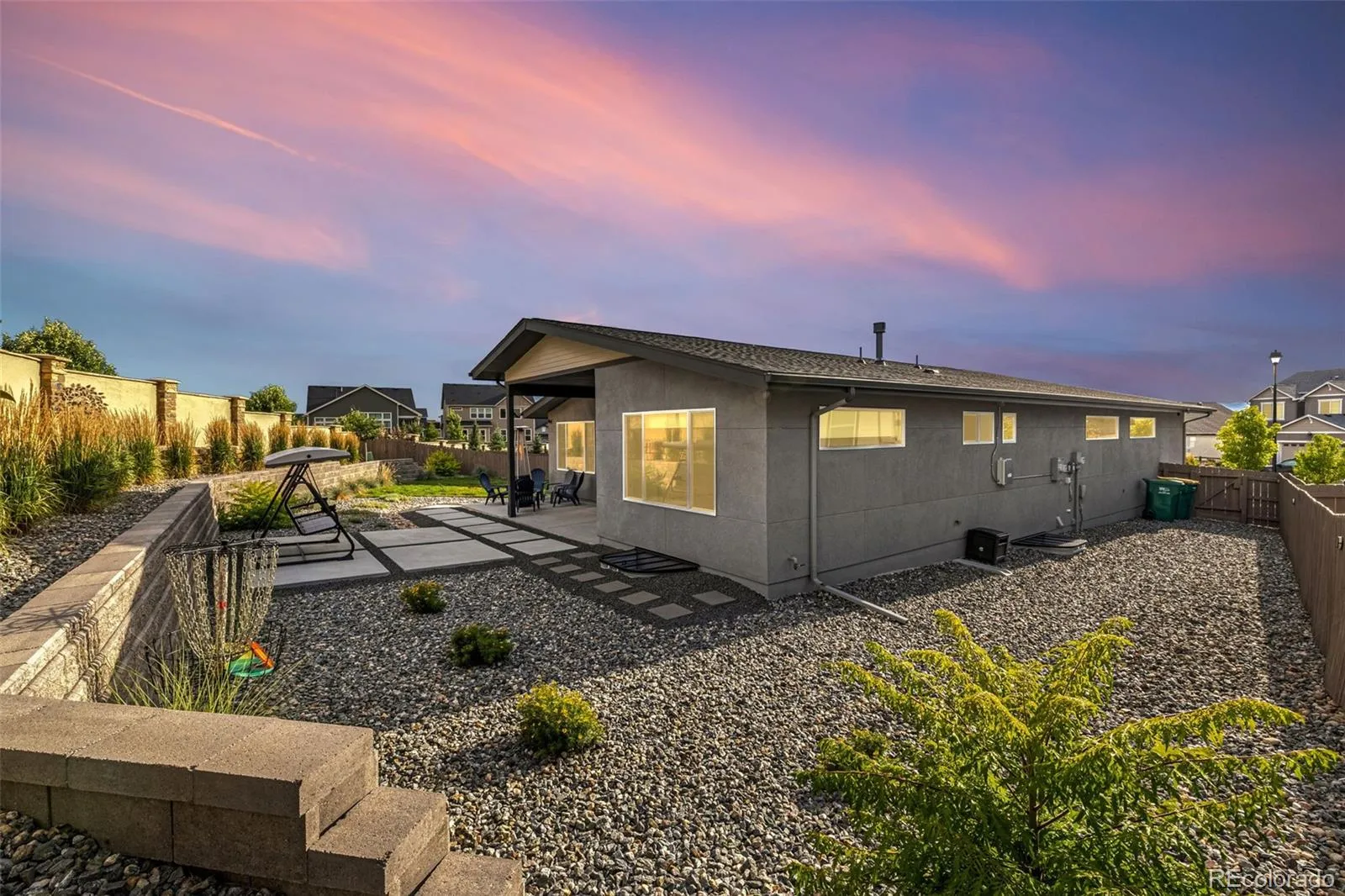 Experience modern elegance with a touch of mid-century style in this stunning Toll Brothers ranch home on a rare oversized lot in Cordera. Flooded with natural light from expansive windows, this home’s open layout creates an airy atmosphere you’ll love coming home to. Nestled at the end of a quiet cul-de-sac with breathtaking mountain views, it offers exceptional privacy with full fencing allowed—a rarity in Cordera. Enjoy neighborhood amenities including trails, an event center, fitness facility, pool, and proximity to top-rated schools and a hospital. Inside, discover a bright open-concept living area with gorgeous white oak hardwood floors. The chef’s kitchen features quartz countertops, stainless steel appliances, a gas cooktop, warm wood cabinetry, an oversized island, and a massive pantry. The living room impresses with a sleek in-wall fireplace, dramatic 8-blade ceiling fan, and large windows framing serene backyard views. Custom electric blinds on the expansive glass doors add style and convenience. The layout includes two spacious main-level suites on opposite wings, each with a private bath. The primary suite wows with vaulted ceilings, a spa-inspired en-suite, and an oversized walk-in closet. The finished basement offers two additional bedrooms, a large family room, and unfinished space already plumbed for a wet bar. Outside, the backyard is an entertainer’s dream with low-maintenance landscaping, a large covered patio, and expansive sliding glass doors for seamless indoor-outdoor living. The fully fenced yard provides privacy and peace of mind. Additional highlights include an oversized garage with built-in storage and workshop (2024), new kitchen and bath backsplashes (2022), landscaping upgrades (2021), and solar panels for sustainable energy and savings.