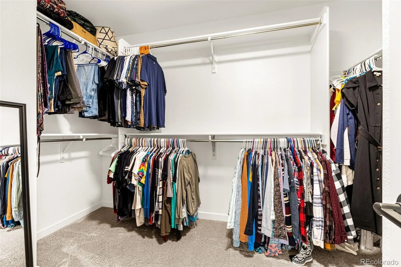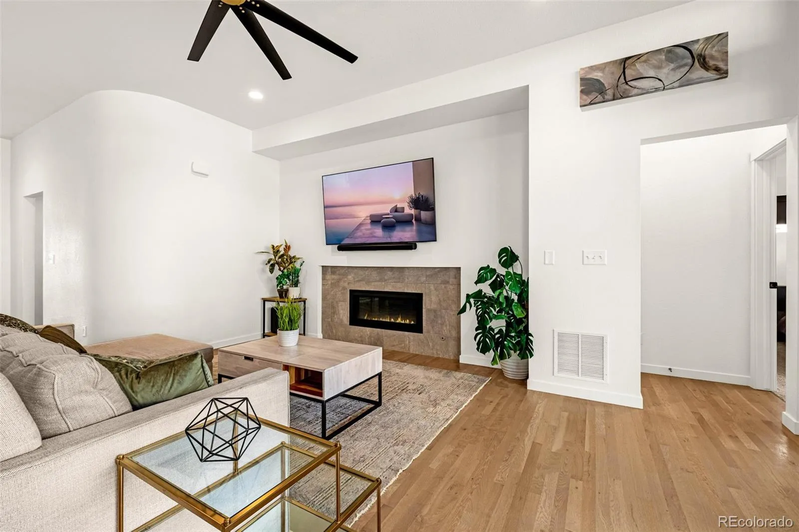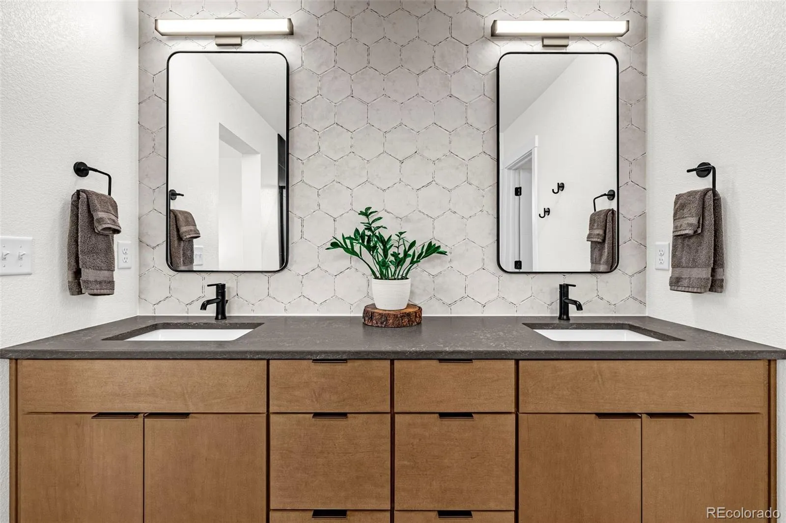 Experience modern elegance with a touch of mid-century style in this stunning Toll Brothers ranch home on a rare oversized lot in Cordera. Flooded with natural light from expansive windows, this home’s open layout creates an airy atmosphere you’ll love coming home to. Nestled at the end of a quiet cul-de-sac with breathtaking mountain views, it offers exceptional privacy with full fencing allowed—a rarity in Cordera. Enjoy neighborhood amenities including trails, an event center, fitness facility, pool, and proximity to top-rated schools and a hospital. Inside, discover a bright open-concept living area with gorgeous white oak hardwood floors. The chef’s kitchen features quartz countertops, stainless steel appliances, a gas cooktop, warm wood cabinetry, an oversized island, and a massive pantry. The living room impresses with a sleek in-wall fireplace, dramatic 8-blade ceiling fan, and large windows framing serene backyard views. Custom electric blinds on the expansive glass doors add style and convenience. The layout includes two spacious main-level suites on opposite wings, each with a private bath. The primary suite wows with vaulted ceilings, a spa-inspired en-suite, and an oversized walk-in closet. The finished basement offers two additional bedrooms, a large family room, and unfinished space already plumbed for a wet bar. Outside, the backyard is an entertainer’s dream with low-maintenance landscaping, a large covered patio, and expansive sliding glass doors for seamless indoor-outdoor living. The fully fenced yard provides privacy and peace of mind. Additional highlights include an oversized garage with built-in storage and workshop (2024), new kitchen and bath backsplashes (2022), landscaping upgrades (2021), and solar panels for sustainable energy and savings.