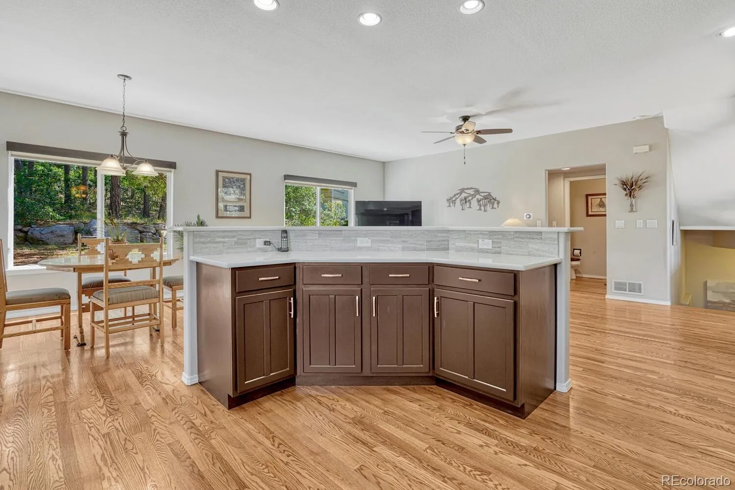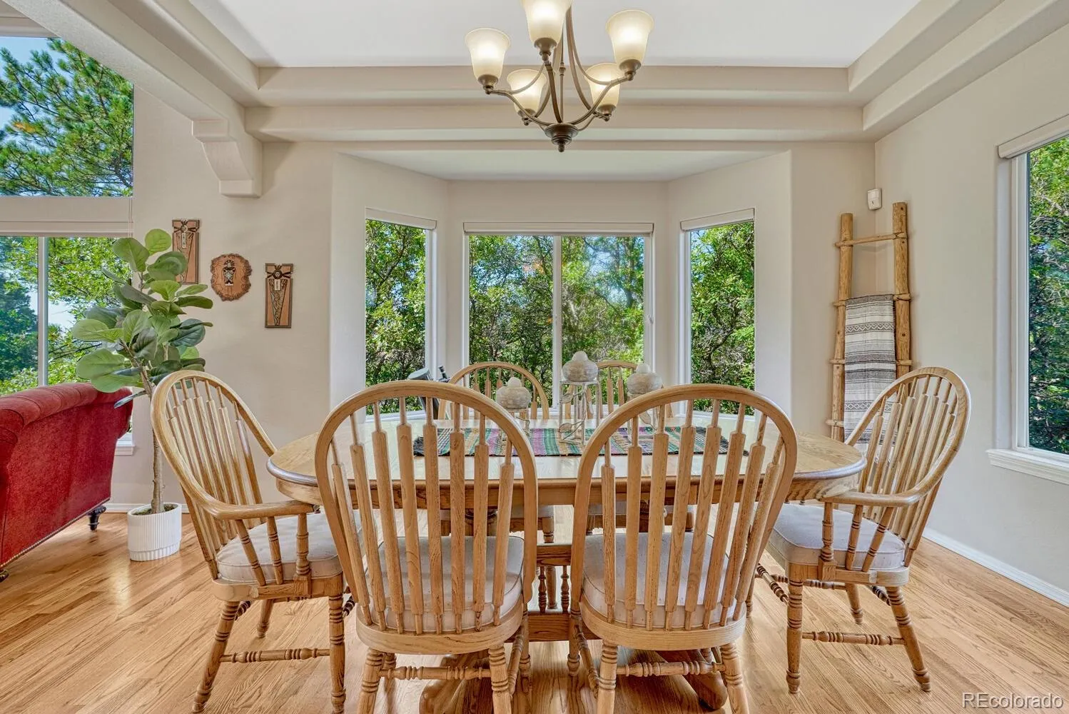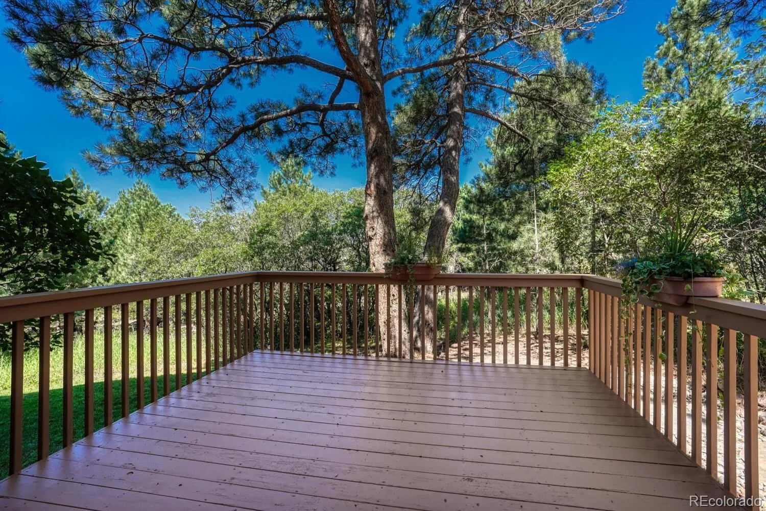 Warm and Welcoming Home with Serene Setting and Mountain Views. Tucked away in a quiet cul-de-sac, this beautiful home offers breathtaking, unobstructed views of Pikes Peak and a rare sense of peace and privacy. Surrounded by mature trees and frequent wildlife sightings, the unique lot provides a perfect balance of shade and natural light throughout the home. Enjoy a professionally landscaped yard featuring a tranquil rock stream and pond—ideal for relaxing or entertaining. Located just outside of Woodmoor with no HOA, the property offers flexibility in a peaceful setting while still being just minutes away from town conveniences. Inside, the oversized primary suite is a true retreat with vaulted ceilings, plant shelves, a cozy gas fireplace, and stunning mountain views. The remodeled ensuite bath boasts heated tile floors, a jetted soaking tub, custom frameless shower, and granite countertops. Upstairs, two additional bedrooms also feature vaulted ceilings and charming plant shelves, while a versatile loft space offers flexibility for a home gym, office, or playroom. The main level welcomes you with beautiful wood floors, a remodeled powder room, and a stunning kitchen designed for both beauty and function. The formal dining room with elegant trayed ceilings is perfect for intimate dinners or entertaining guests.