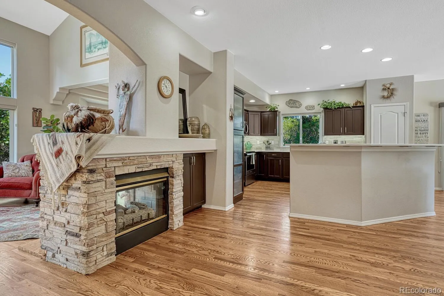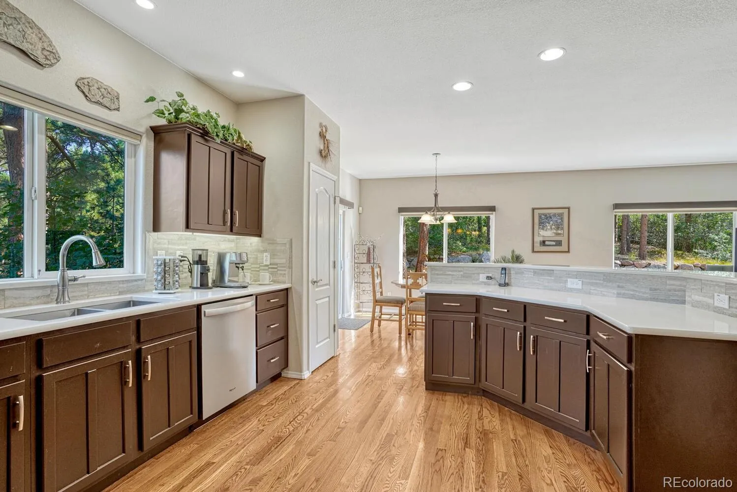 Warm and Welcoming Home with Serene Setting and Mountain Views. Tucked away in a quiet cul-de-sac, this beautiful home offers breathtaking, unobstructed views of Pikes Peak and a rare sense of peace and privacy. Surrounded by mature trees and frequent wildlife sightings, the unique lot provides a perfect balance of shade and natural light throughout the home. Enjoy a professionally landscaped yard featuring a tranquil rock stream and pond—ideal for relaxing or entertaining. Located just outside of Woodmoor with no HOA, the property offers flexibility in a peaceful setting while still being just minutes away from town conveniences. Inside, the oversized primary suite is a true retreat with vaulted ceilings, plant shelves, a cozy gas fireplace, and stunning mountain views. The remodeled ensuite bath boasts heated tile floors, a jetted soaking tub, custom frameless shower, and granite countertops. Upstairs, two additional bedrooms also feature vaulted ceilings and charming plant shelves, while a versatile loft space offers flexibility for a home gym, office, or playroom. The main level welcomes you with beautiful wood floors, a remodeled powder room, and a stunning kitchen designed for both beauty and function. The formal dining room with elegant trayed ceilings is perfect for intimate dinners or entertaining guests.
