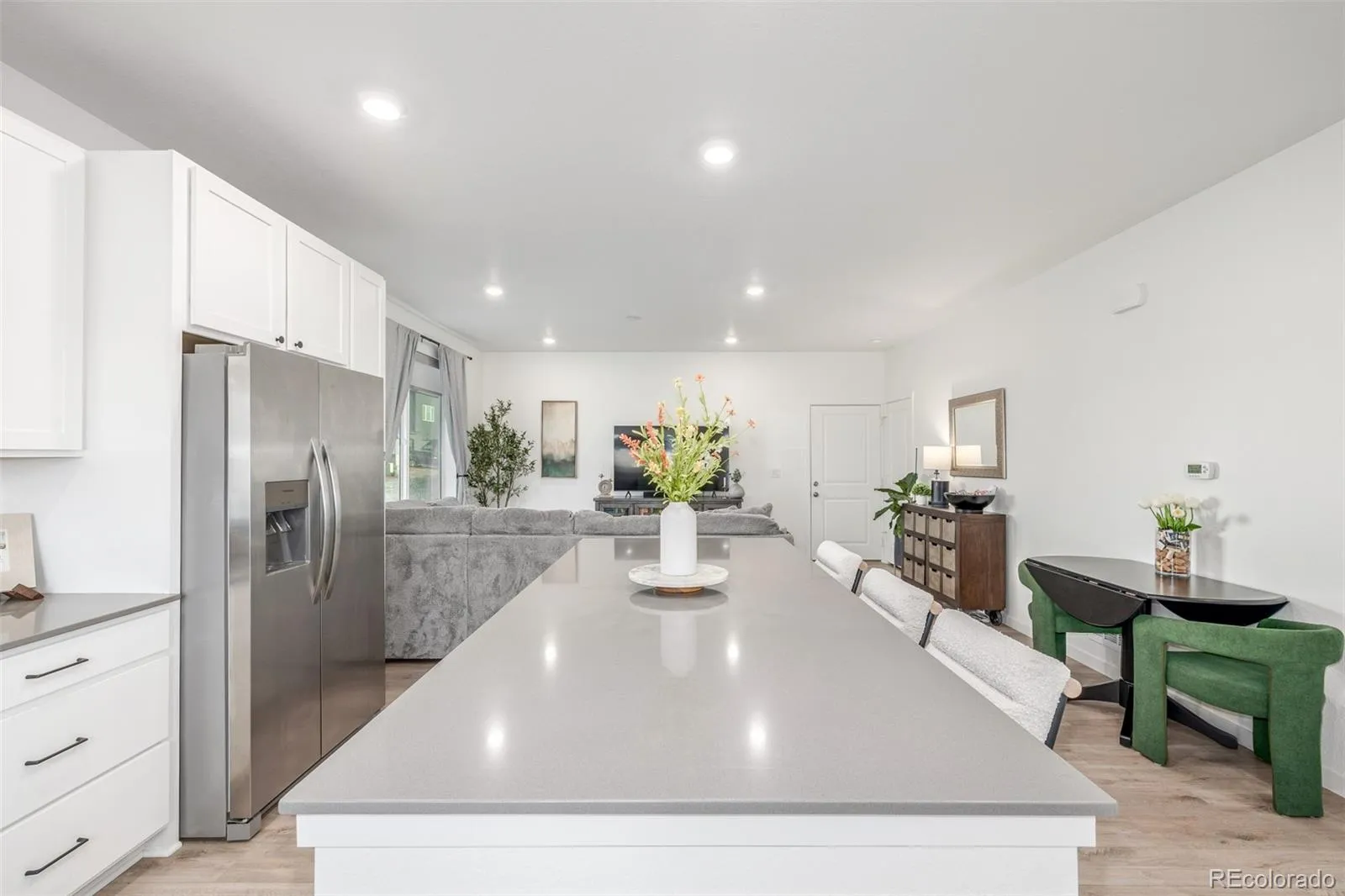 The bright, open-concept floor plan features elegant wood-look flooring, recessed lighting, and a crisp, modern palette throughout. The gourmet kitchen is a chef’s delight—boasting shaker cabinetry, stainless steel appliances, ample counter space, and a large island with breakfast bar seating. Upstairs, the serene primary suite offers plush carpet, dual sinks, and a private ensuite bath.