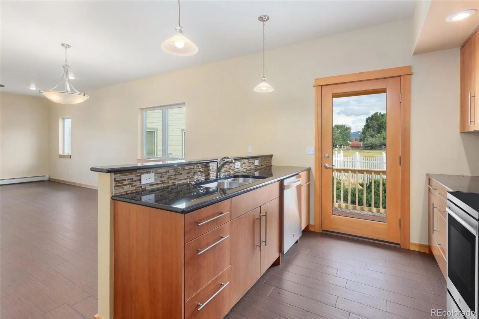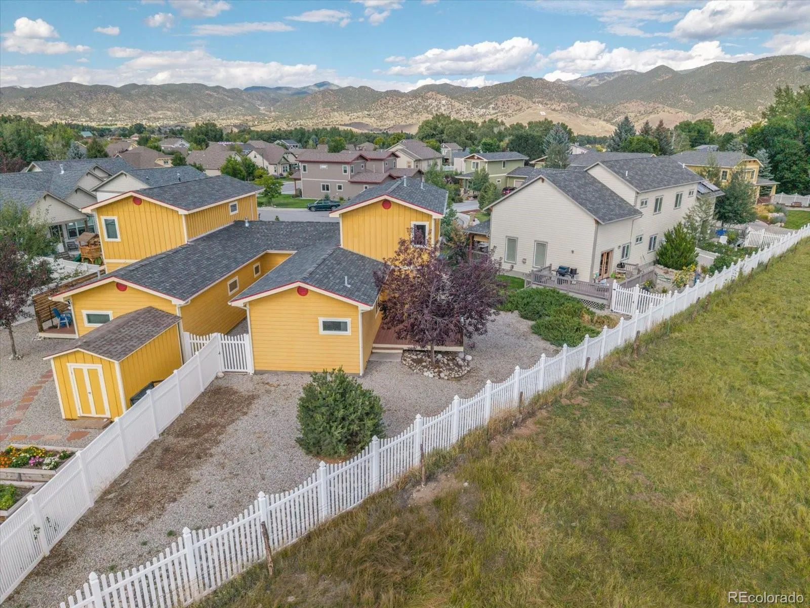 The open-concept main floor features a beautifully appointed kitchen with quartz countertops, a glass tile backsplash, a generous pantry, and dining area. A patio door from the kitchen leads to a private back deck, perfect for relaxing or entertaining, with breathtaking views of the Sangre de Cristo Mountains to the south. The main level also boasts a mudroom off the garage, ideal for keeping things organized and clean.