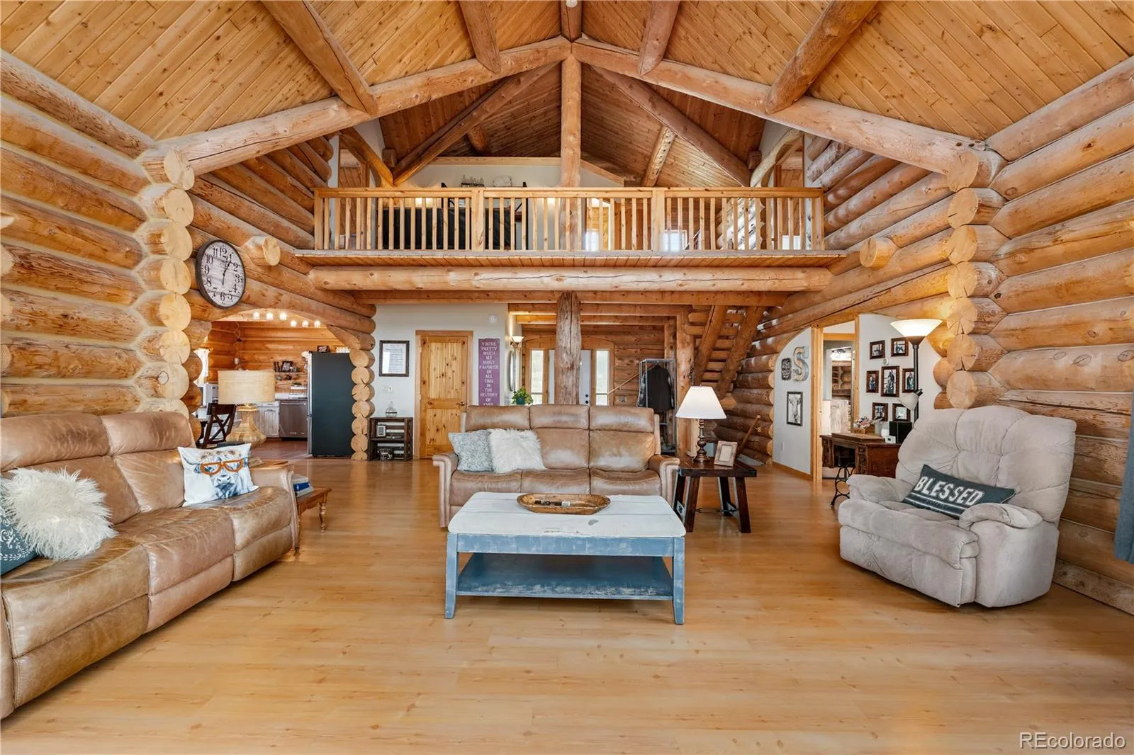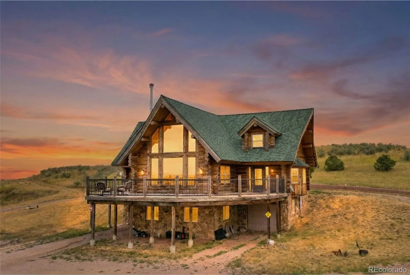 Escape to the wide open spaces of Elbert County with this one-of-a-kind log home retreat on over 35 fully fenced acres in Foxtail Farms. Tucked at the end of a quiet cul-de-sac, this three-bedroom, three-bathroom mountain contemporary offers scenic privacy, panoramic views, and the ultimate in rural living. The soaring great room showcases tongue-and-groove ceilings, hand-hewn logs, and a wall of windows that bathe the home in natural light. The open-concept main level features a spacious primary suite, wood-burning stove, and wraparound deck that invites morning coffee or sunset gatherings. Upstairs, you’ll find two additional bedrooms, a full bath, and a cozy loft overlooking the great room. The unfinished walkout basement provides ample room to expand or customize. This property is ready for your homesteading or ranching dreams, complete with deeded water rights, a private well, and four versatile outbuildings—including two loafing sheds, a stable, and large 2000 square-foot steel barn. Zoned residential with no HOA, the property is ideal for livestock, horses, goats, and more. Whether you’re seeking a peaceful getaway, a hobby farm, or a forever home, this rare opportunity delivers the best of Colorado country living—without compromising comfort or charm.