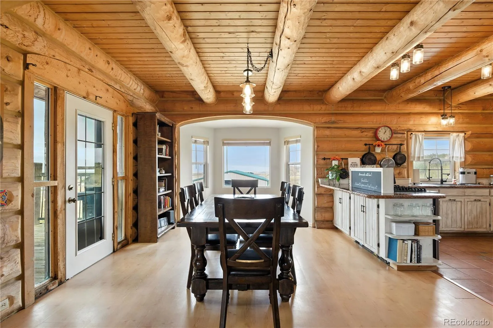 Escape to the wide open spaces of Elbert County with this one-of-a-kind log home retreat on over 35 fully fenced acres in Foxtail Farms. Tucked at the end of a quiet cul-de-sac, this three-bedroom, three-bathroom mountain contemporary offers scenic privacy, panoramic views, and the ultimate in rural living. The soaring great room showcases tongue-and-groove ceilings, hand-hewn logs, and a wall of windows that bathe the home in natural light. The open-concept main level features a spacious primary suite, wood-burning stove, and wraparound deck that invites morning coffee or sunset gatherings. Upstairs, you’ll find two additional bedrooms, a full bath, and a cozy loft overlooking the great room. The unfinished walkout basement provides ample room to expand or customize. This property is ready for your homesteading or ranching dreams, complete with deeded water rights, a private well, and four versatile outbuildings—including two loafing sheds, a stable, and large 2000 square-foot steel barn. Zoned residential with no HOA, the property is ideal for livestock, horses, goats, and more. Whether you’re seeking a peaceful getaway, a hobby farm, or a forever home, this rare opportunity delivers the best of Colorado country living—without compromising comfort or charm.