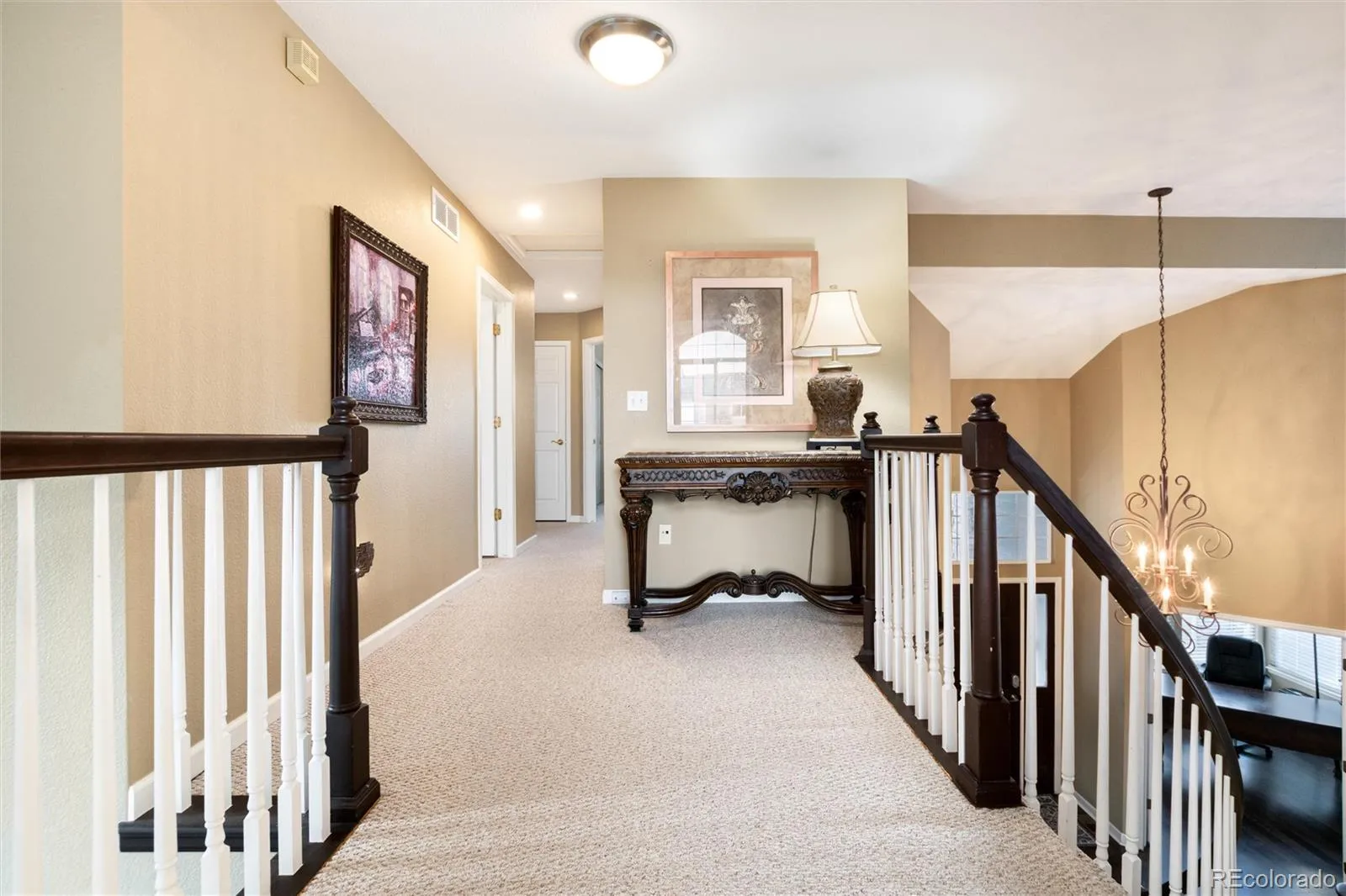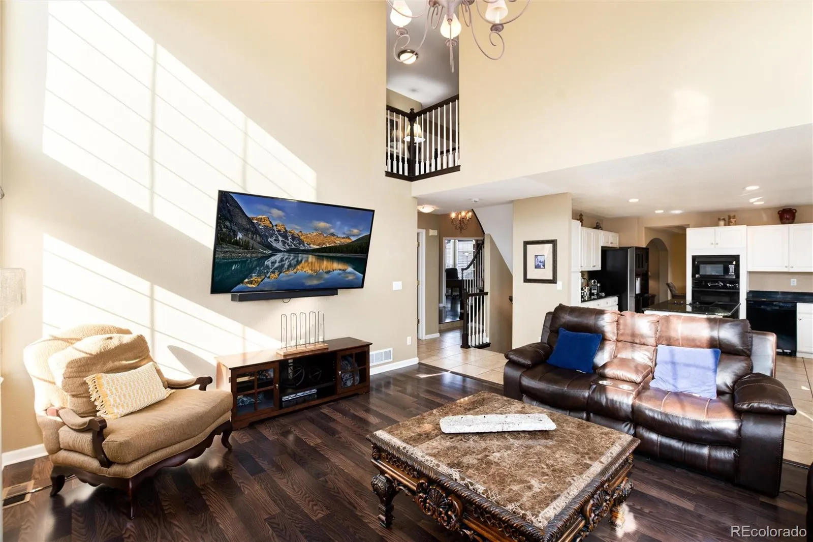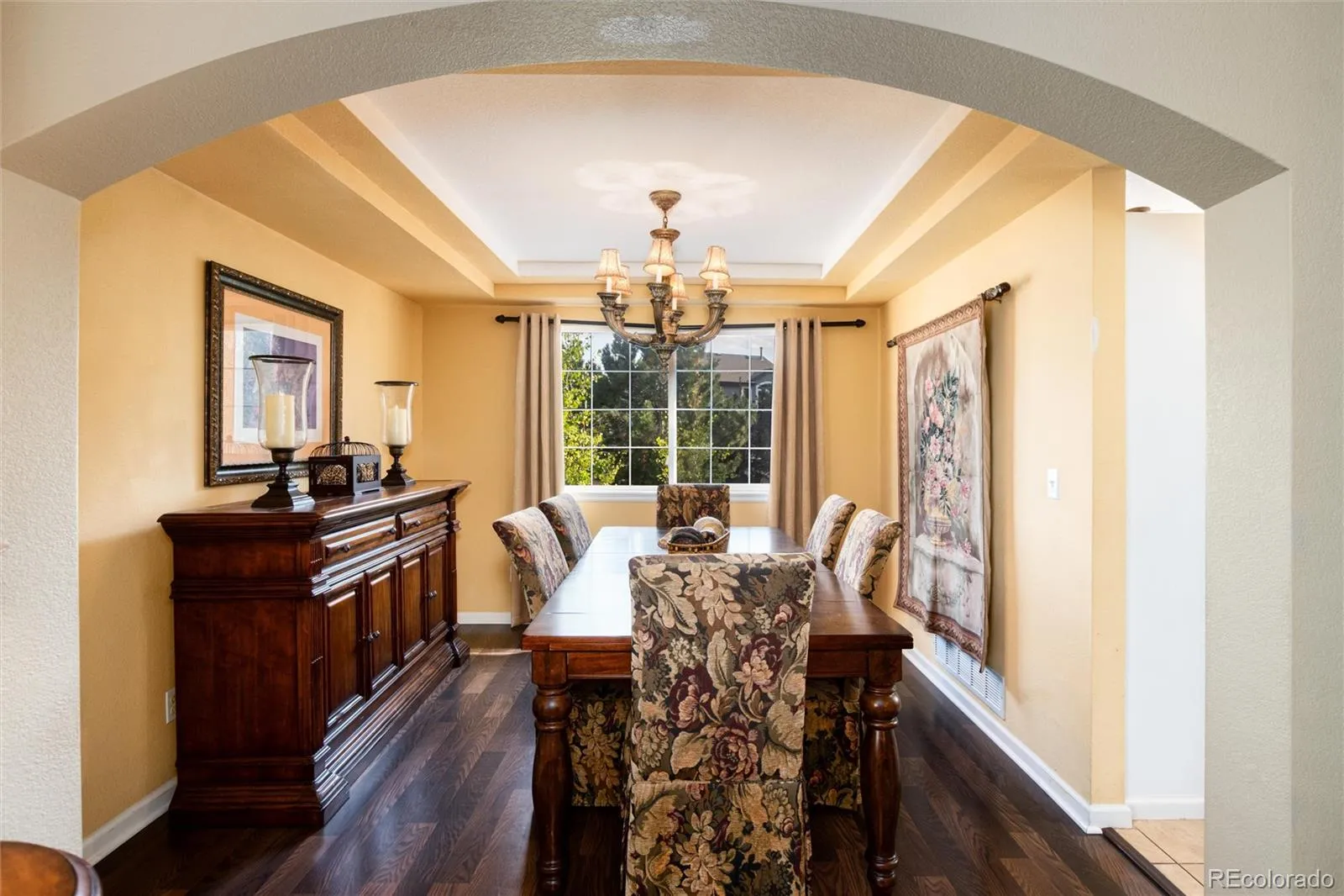Come see why this home stands out! Convenient & quiet cul-de-sac living with a flat, generous backyard and mountain views, ideal for outdoor living and entertaining. Recent new roof, water heater new 2022.This home lives large with a finished basement including a home theater, chic wet bar, and versatile game room/5th bedroom ideal for teen retreat, guest suite, or home gym. Rich wide-plank hardwoods on the main level set a sophisticated tone. Enter to a striking first impression of the private home office and a sweeping curved staircase. The living room is filled with natural light from the soaring two story windows, while the dining room offers inviting views of the lush, private backyard. The granite kitchen showcases a large island, clear, direct sightlines of the backyard, and effortless, open connection to the oversized breakfast nook & family room with vaulted ceiling and statement fireplace framed by two story windows to wrap you in views of the tree lined backyard. Step seamlessly out to the tiered deck & patio for multiple dining + relaxing zones. Love to entertain? This sprawling, fenced yard sets the stage for gatherings, grilling, play, pets and daily sunsets/star gazing (trampoline included!). Large main level laundry mud room has a sink for easy pet baths + washer/dryer included. Upstairs, the southwest-facing primary suite is a true retreat to relax and unwind. Both the primary and full hallway bathrooms have been updated with double undermount sinks and new countertops. Three additional bedrooms + loft complete the upper level. Downstairs, the finished basement is built for fun-home theatre (tv included), wet bar with built in wine frig, and a game room that is also a 5th bedroom guest or teen suite (has closet and egress) or home gym. Only blocks away, Eagle Ridge Elementary is a John Irwin School of Excellence. Min. to golf/tennis, Cook Creek pool/water slide, trails, Park Meadows Mall, Sky Ridge Hospital. 30 min to DIA or C-470 to the mountains!