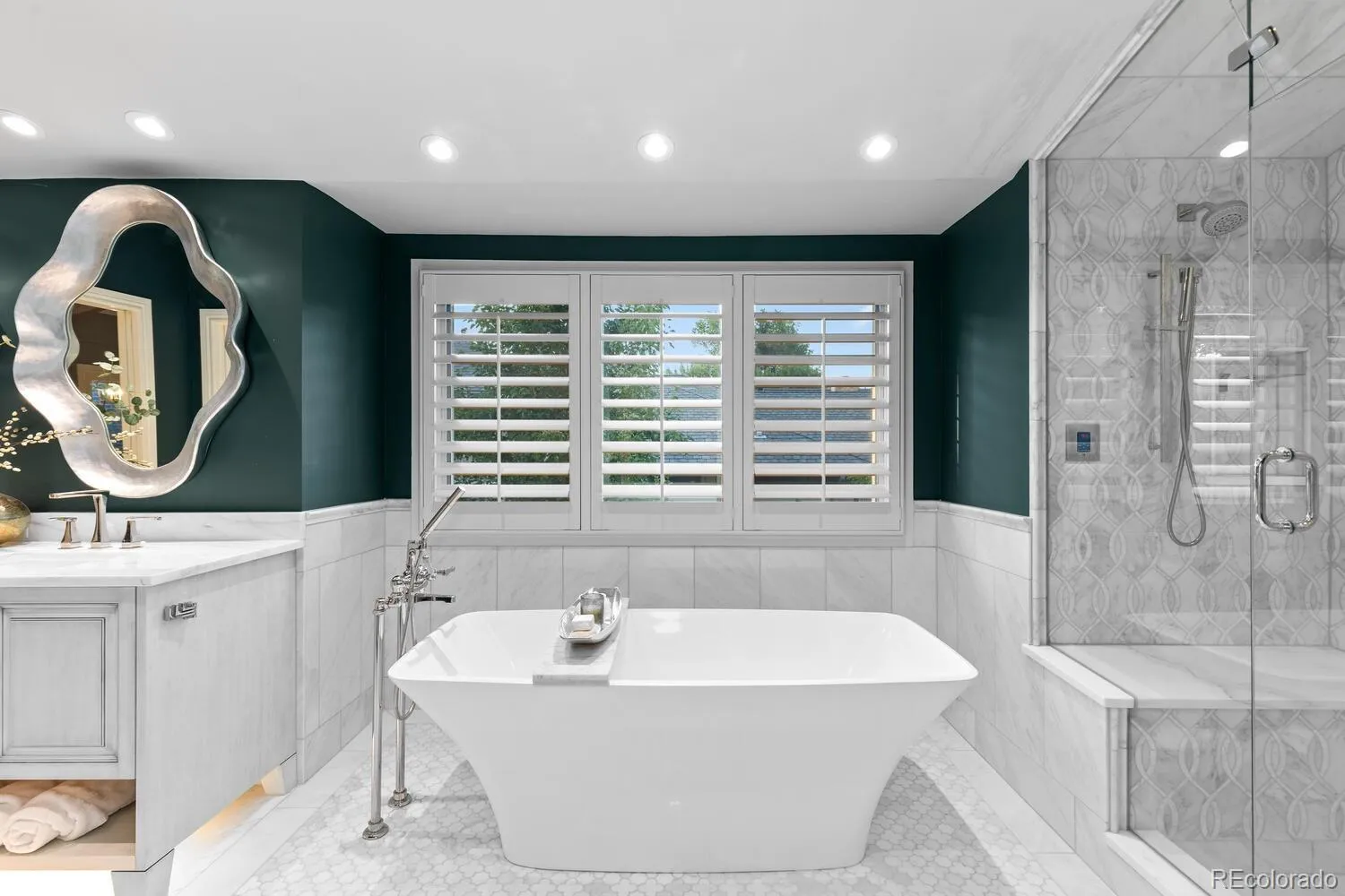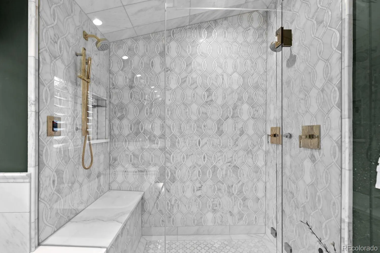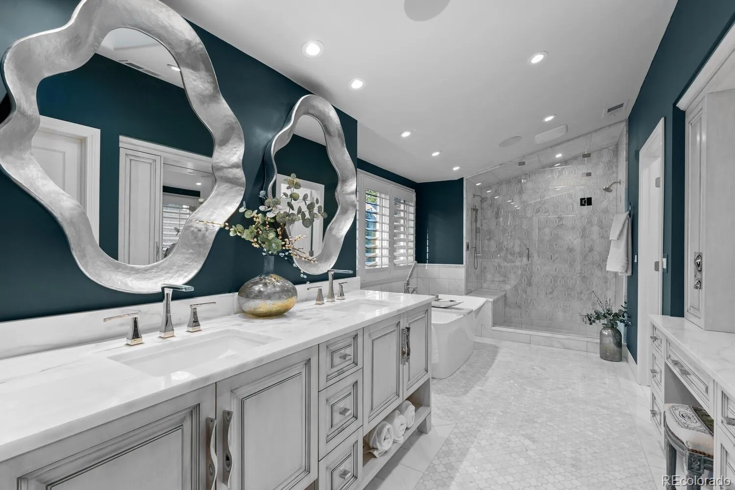 From the private front patio, you’ll enter this magnificently remodeled 4 bedroom / 5 bathroom home. On the main floor, you will find a stately office / study, a large sitting room (or formal dining room) and 1/2 bath at the front of the home. The custom kitchen (2015) is well appointed with Wolf, Bosche and Sub Zero appliances, marble and copper countertops, wine refrigerator and walk-in pantry. The kitchen is open to the large living / dining space to accommodate today’s living and entertaining and provides access to the private, serene courtyard. You will notice the plantation shutters, gas fireplace in the family room and large mud room with access to the coveted 3 car garage.