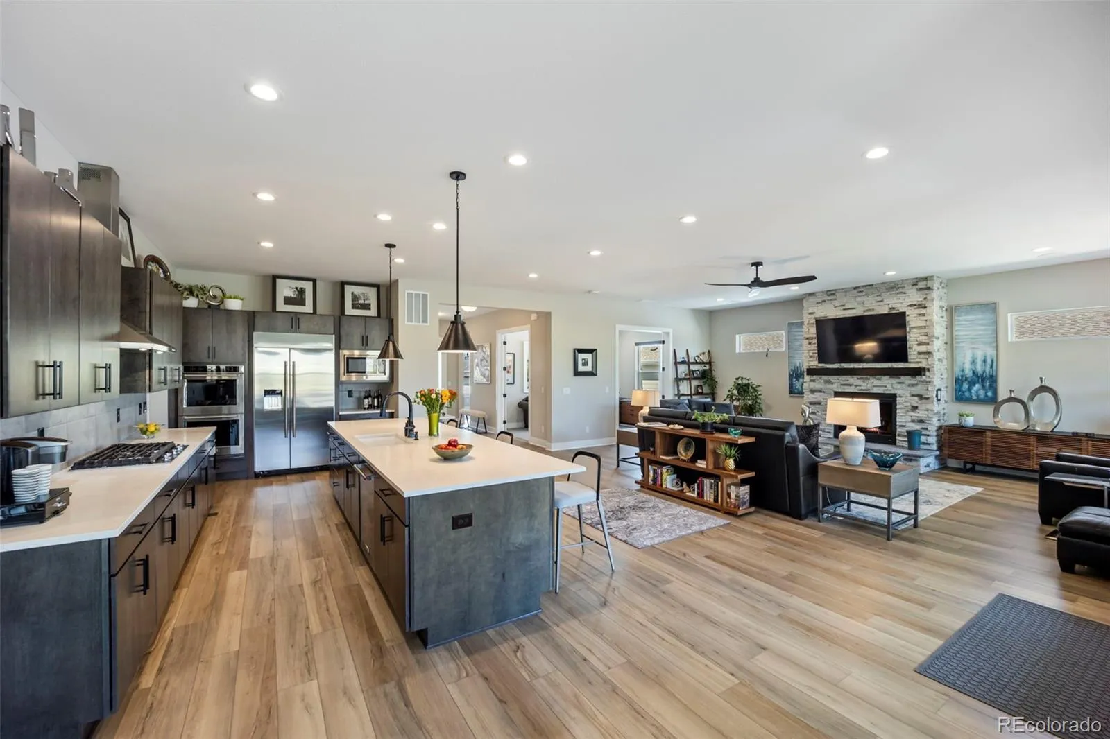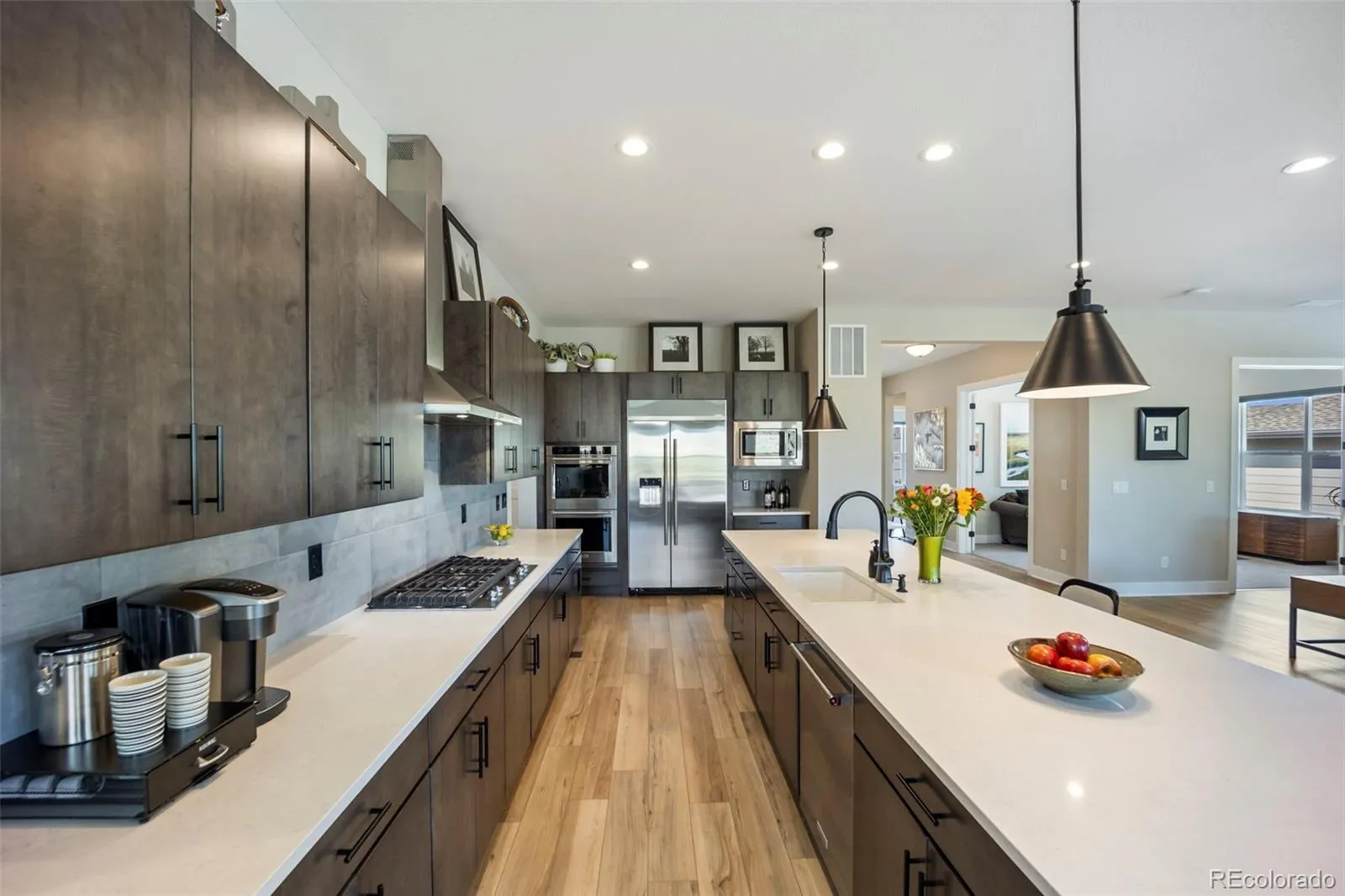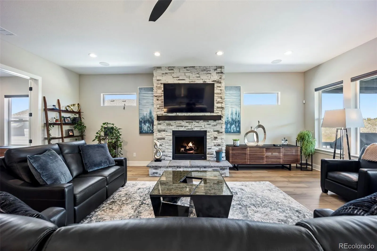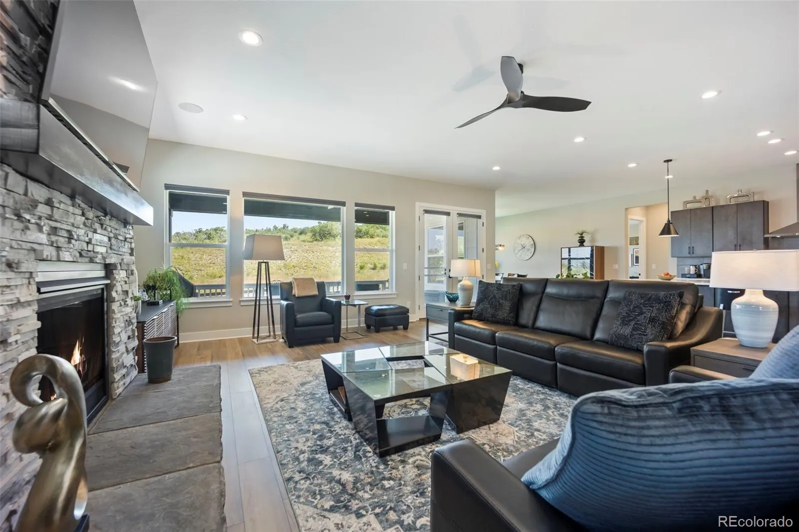 This extraordinary ranch plan in the coveted “Regency” at Montaine 55+ community offers over 4,700 sq ft (2,720 finished), with thoughtful expansions and luxury upgrades throughout. Perfectly situated on a rare lot with open space (rear and side) this nearly new home has unmatched privacy, and elegant design. The open-concept great room has been expanded by over 200 sq ft, creating a gathering space anchored by a floor-to-ceiling stacked stone fireplace. The gourmet kitchen showcases quartz counters, extended island, all upgraded “Yorktowne” cabinetry, KitchenAid double ovens, five-burner cooktop, and built-in Jenn-Air fridge. The great room/dining area opens to a covered patio through French doors, where a motorized sun/wind screen and stained concrete patio provide year-round enjoyment. The primary suite was enlarged, featuring a spa-inspired bathroom w/ upgraded shower enclosure, separate toilet room w/ bidet seat, his/her walk-in closets with custom shelving and drawers. Additional BR has walk-in closet and bath attached. French doors enclose the dedicated office, w/ wired high-speed data. 8-foot solid core doors, additional lighting and electrical upgrades throughout, custom cabinets and shelving in closets, pantry, laundry and garage, plus remote- control window shades on all windows. The insulated and painted garage includes polyaspartic floor coating, while the basement—also finished with polyaspartic flooring—offers a rough-in for an additional bath and ample room for two more BR’s, a rec area, or fitness space. Outdoors, the home is fully landscaped w/ pet-rated artificial turf, fenced backyard, and stained concrete entry. Peace of mind comes with storm doors and alarm system. Residents of Regency enjoy resort amenities, including a clubhouse, pool, fitness center, tennis/pickleball courts, and miles of scenic trails. Just minutes from downtown Castle Rock’s shops, dining, and golf, this home perfectly balances luxury, lifestyle, and location.