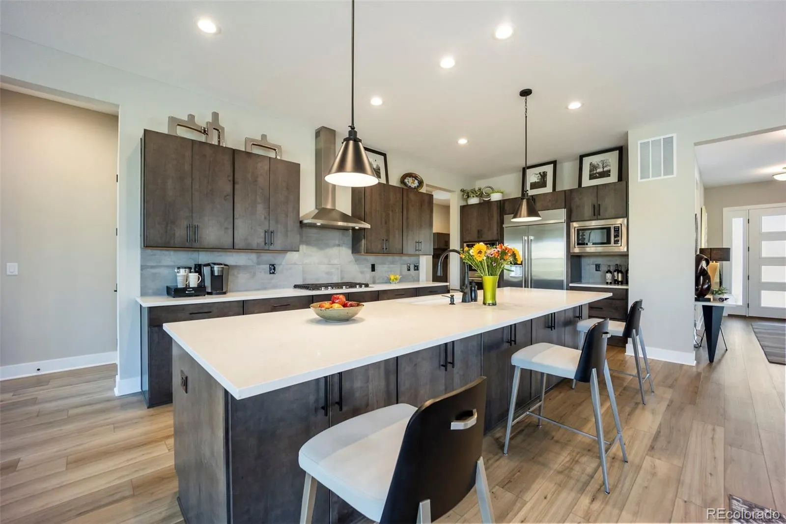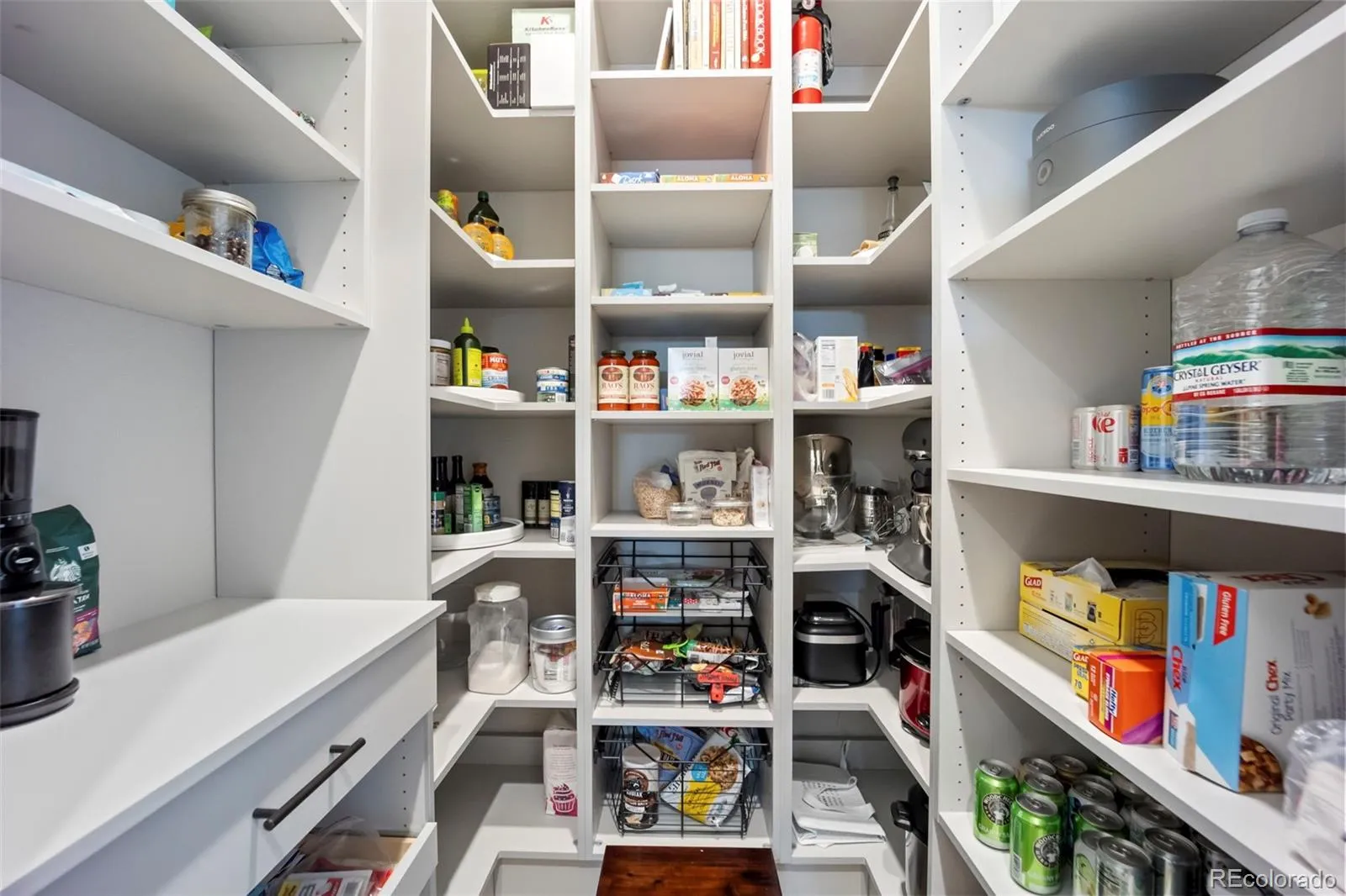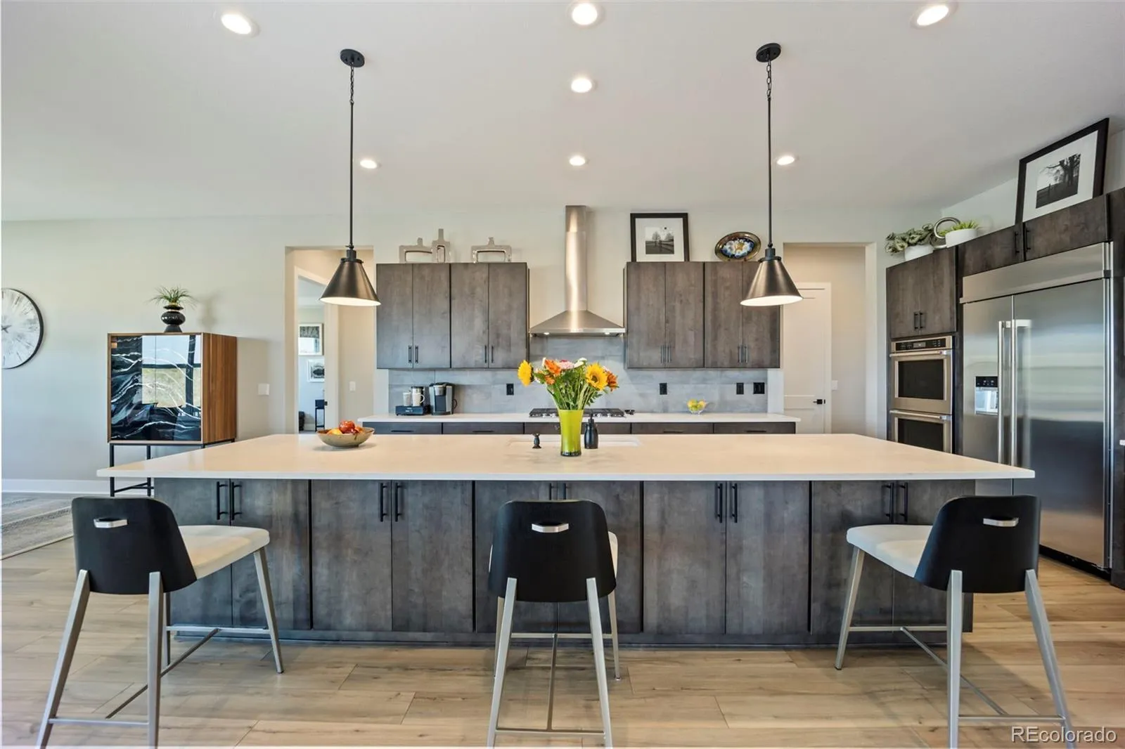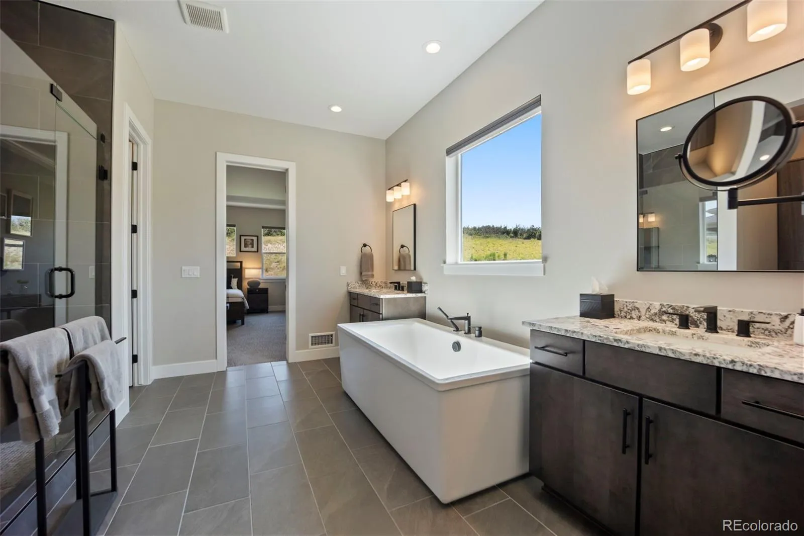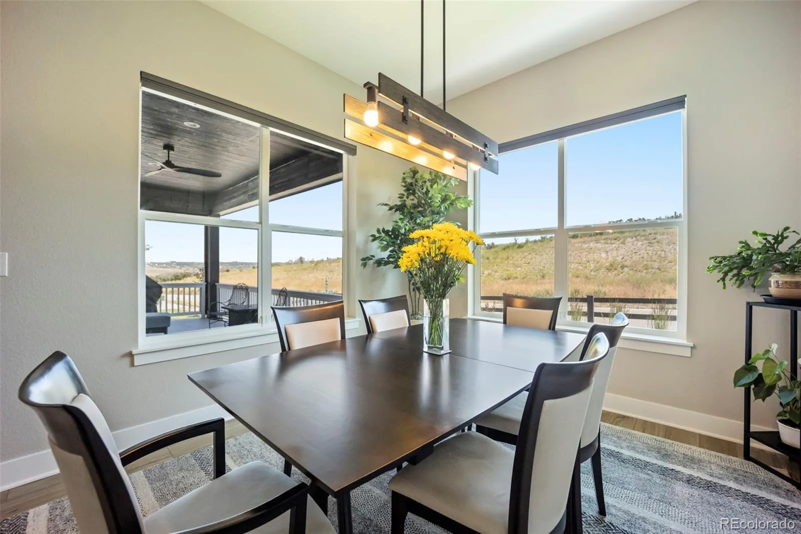 This extraordinary ranch plan in the coveted “Regency” at Montaine 55+ community offers over 4,700 sq ft (2,720 finished), with thoughtful expansions and luxury upgrades throughout. Perfectly situated on a rare lot with open space (rear and side) this nearly new home has unmatched privacy, and elegant design. The open-concept great room has been expanded by over 200 sq ft, creating a gathering space anchored by a floor-to-ceiling stacked stone fireplace. The gourmet kitchen showcases quartz counters, extended island, all upgraded “Yorktowne” cabinetry, KitchenAid double ovens, five-burner cooktop, and built-in Jenn-Air fridge. The great room/dining area opens to a covered patio through French doors, where a motorized sun/wind screen and stained concrete patio provide year-round enjoyment. The primary suite was enlarged, featuring a spa-inspired bathroom w/ upgraded shower enclosure, separate toilet room w/ bidet seat, his/her walk-in closets with custom shelving and drawers. Additional BR has walk-in closet and bath attached. French doors enclose the dedicated office, w/ wired high-speed data. 8-foot solid core doors, additional lighting and electrical upgrades throughout, custom cabinets and shelving in closets, pantry, laundry and garage, plus remote- control window shades on all windows. The insulated and painted garage includes polyaspartic floor coating, while the basement—also finished with polyaspartic flooring—offers a rough-in for an additional bath and ample room for two more BR’s, a rec area, or fitness space. Outdoors, the home is fully landscaped w/ pet-rated artificial turf, fenced backyard, and stained concrete entry. Peace of mind comes with storm doors and alarm system. Residents of Regency enjoy resort amenities, including a clubhouse, pool, fitness center, tennis/pickleball courts, and miles of scenic trails. Just minutes from downtown Castle Rock’s shops, dining, and golf, this home perfectly balances luxury, lifestyle, and location.