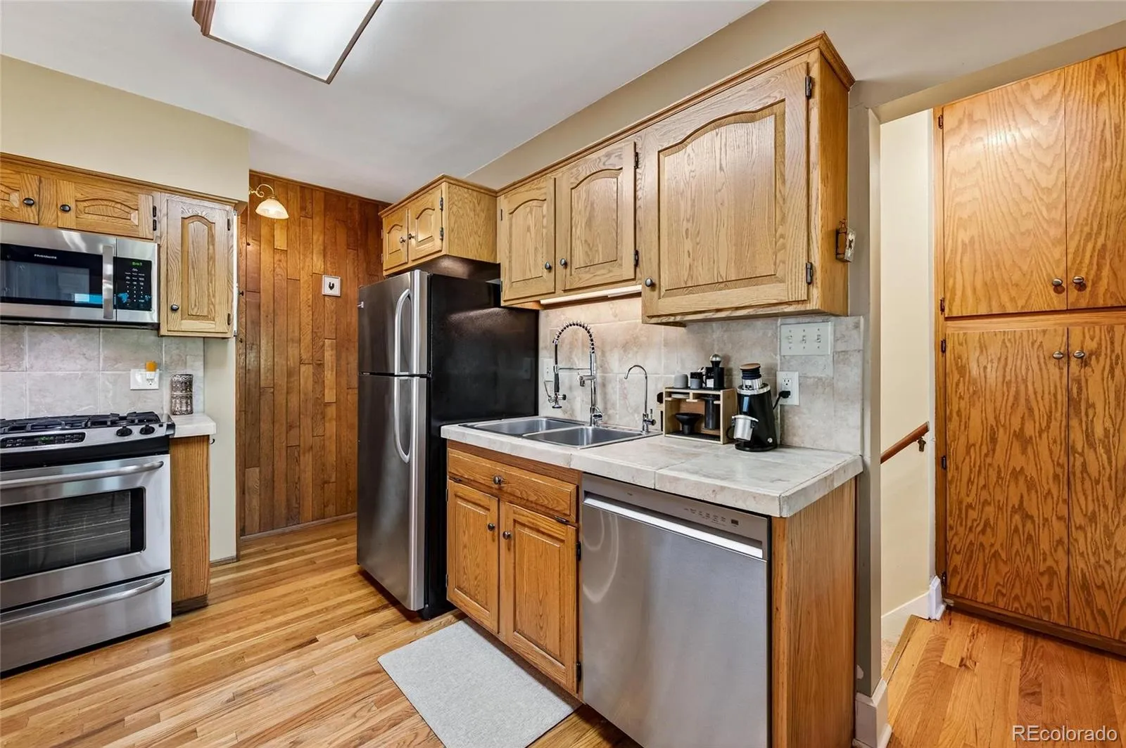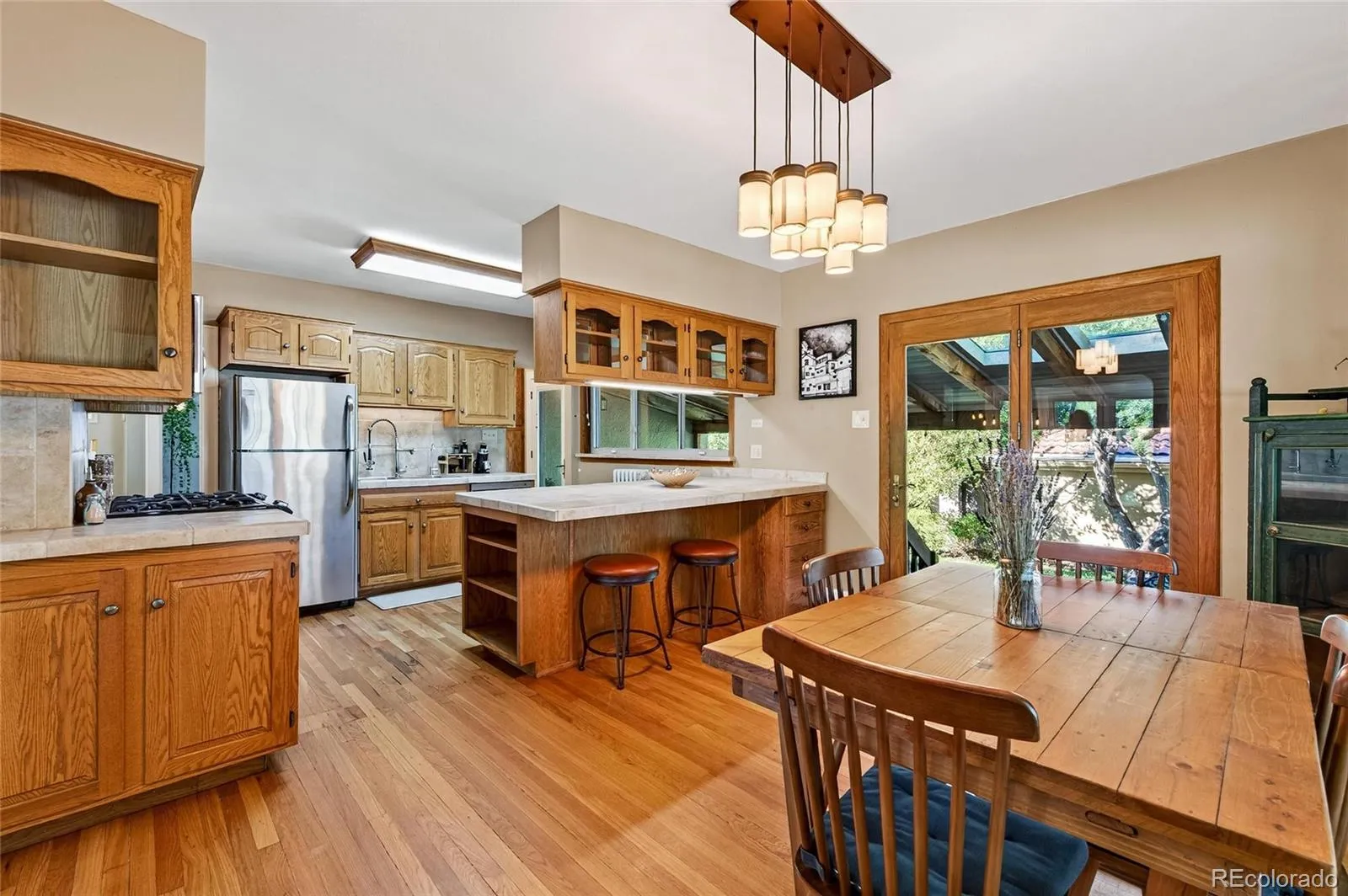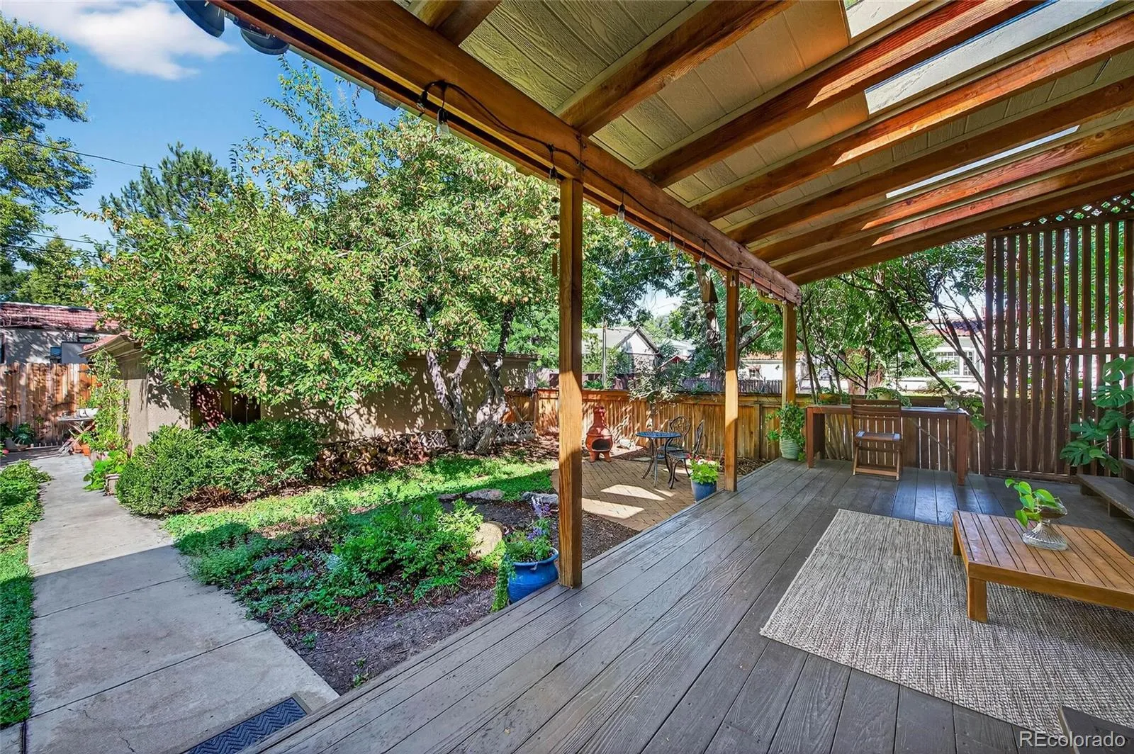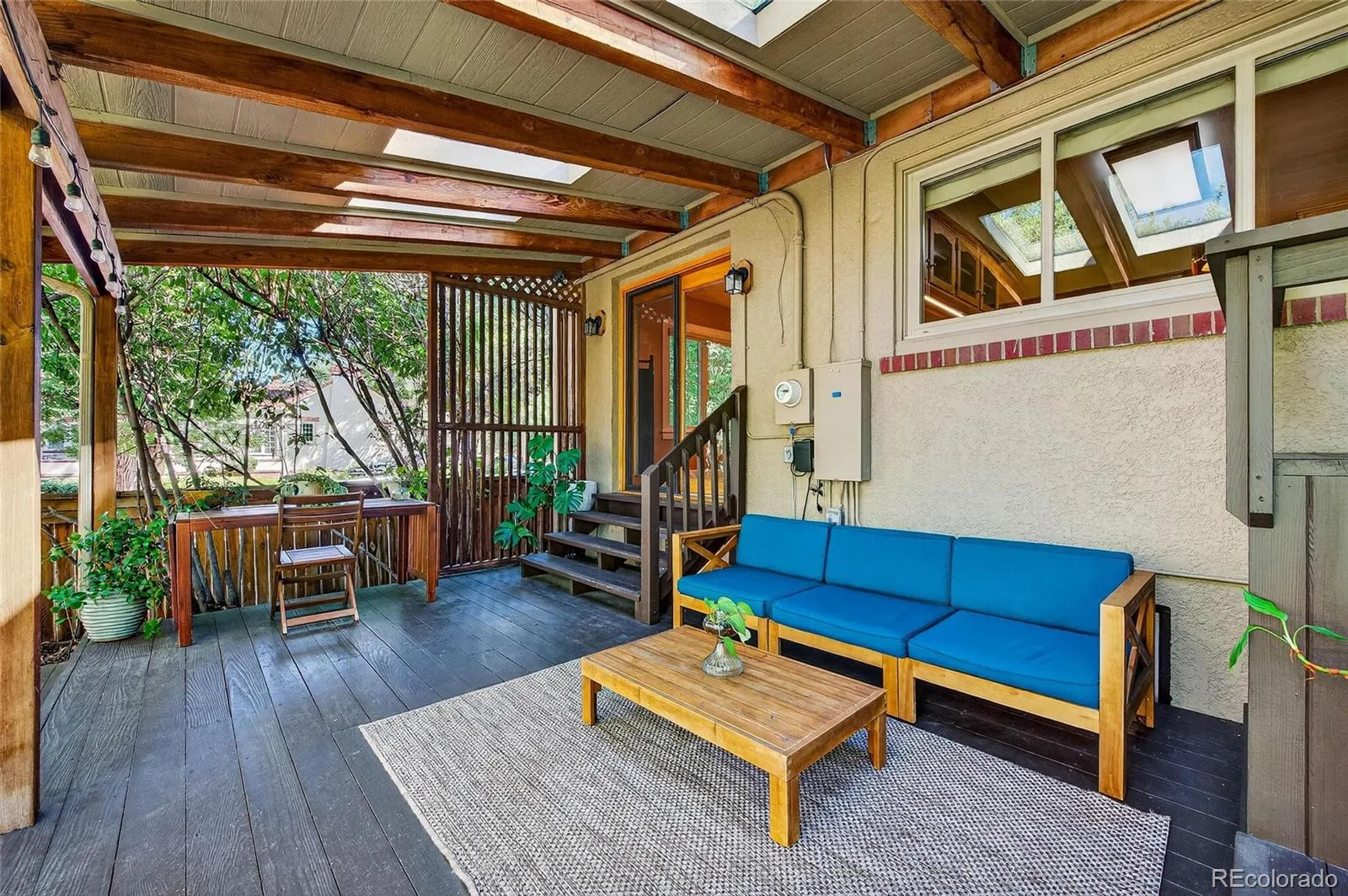 The home blends timeless unique elegance with modern comfort, featuring original arched doorways, beautiful decorative original Batchelder tile fireplace, and an original solid entry door. Gleaming oak hardwood flooring and original custom built-ins enhance the open-concept layout, ideal for entertaining. The spacious open kitchen includes stainless steel appliances, a gas stove, and an expansive 8′ x 4′ kitchen island flowing into the dining area. Double French doors lead to a private 24′ x 13′ covered back deck with skylights and a tranquil backyard—an outdoor living space/oasis perfect for hosting dinners, practicing yoga or enjoying a glass of wine. Savor morning coffee on the 10′ x 10′ front patio, adorned with Italian tiles and metal railings, while neighbors wave hello during their morning stroll.