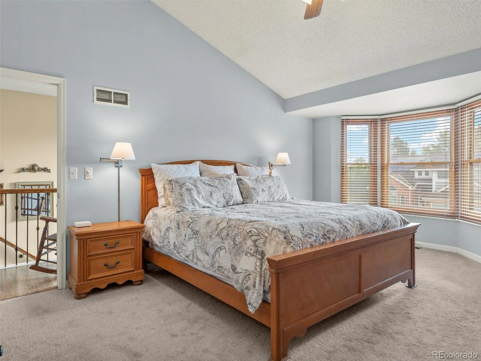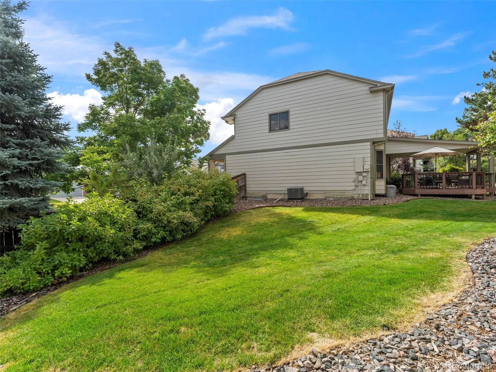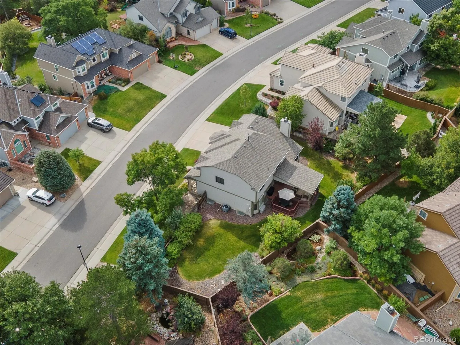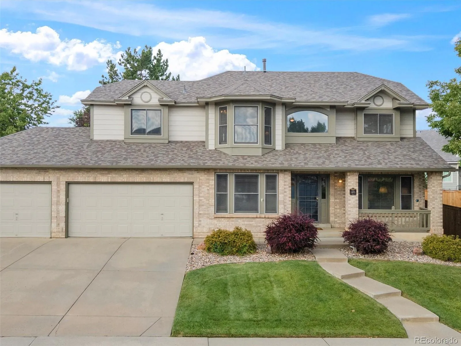 Updated kitchen with granite countertops and an expanded island, white cabinets and appliances, including a double oven. Vaulted Family room with gas log fireplace, recessed lighting, custom shelving and brick surround. Living room comes with crown molding and custom blinds and opposite is the main floor study with book shelving, French doors and ceiling fan. Large formal dining room with a bay window and Upstairs there is a luxurious vaulted primary bedroom and bath with expanded shower, radiant heated flooring and walk in closet along with a coffee bar. Large secondary bedrooms, all with ceiling fans and custom blinds. Walk out to the backyard and notice the big side yards that comes with a fabulous patio, brick pavers and a custom trex deck that is covered and has privacy sun shades. Three car garage gives you plenty of space and a basement that you can finish with your personal taste. All TV’s are included in this wonderful home and one you would be proud to own. Huge Price reduction in one of the best subdivisions in Highlands Ranch. Make it yours.