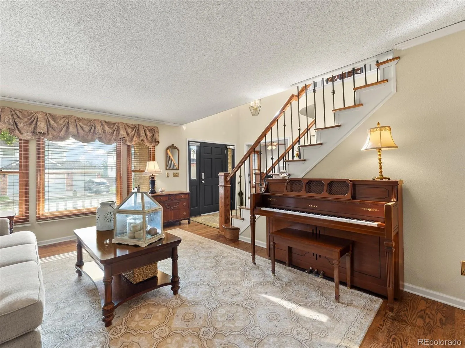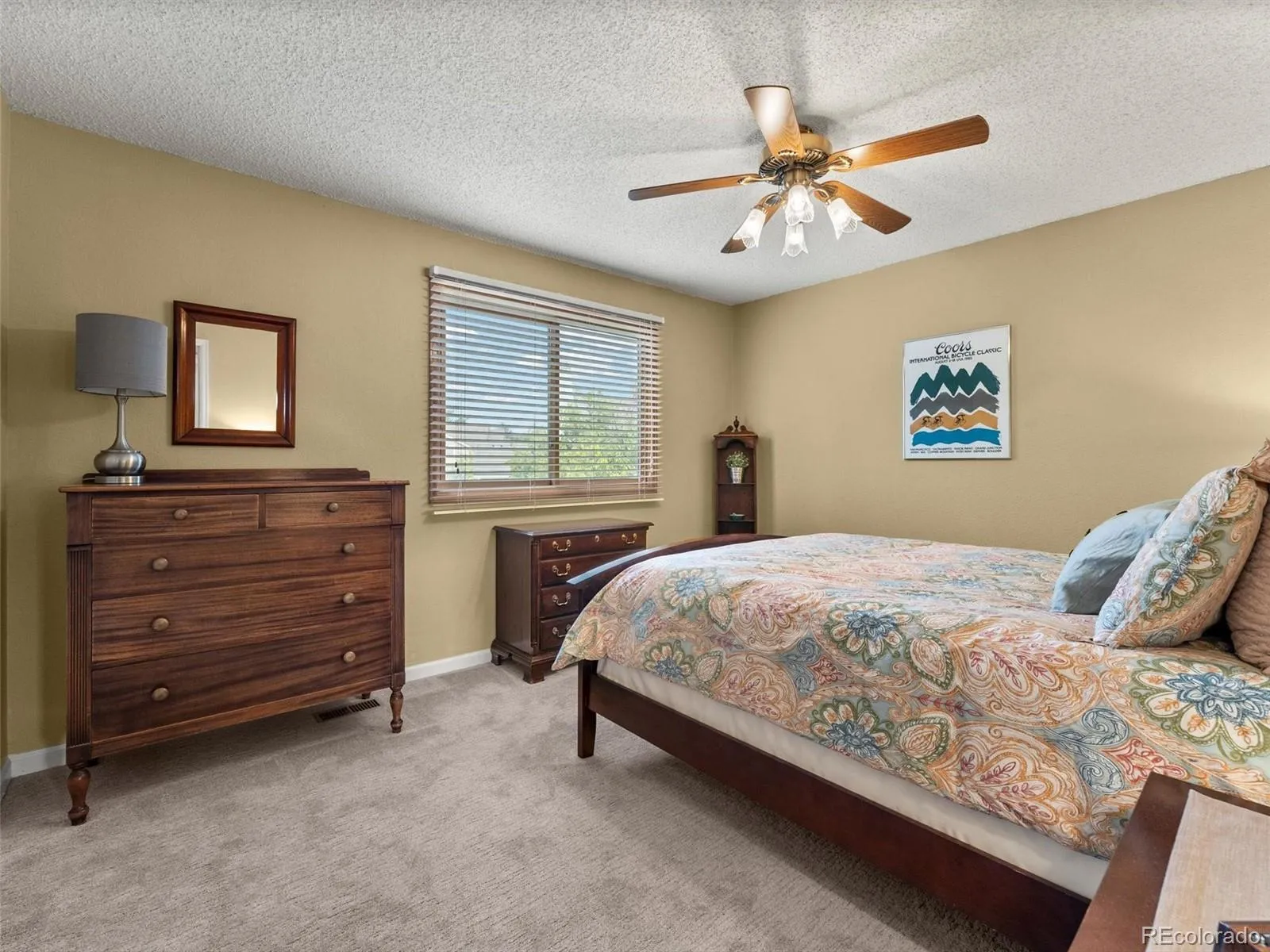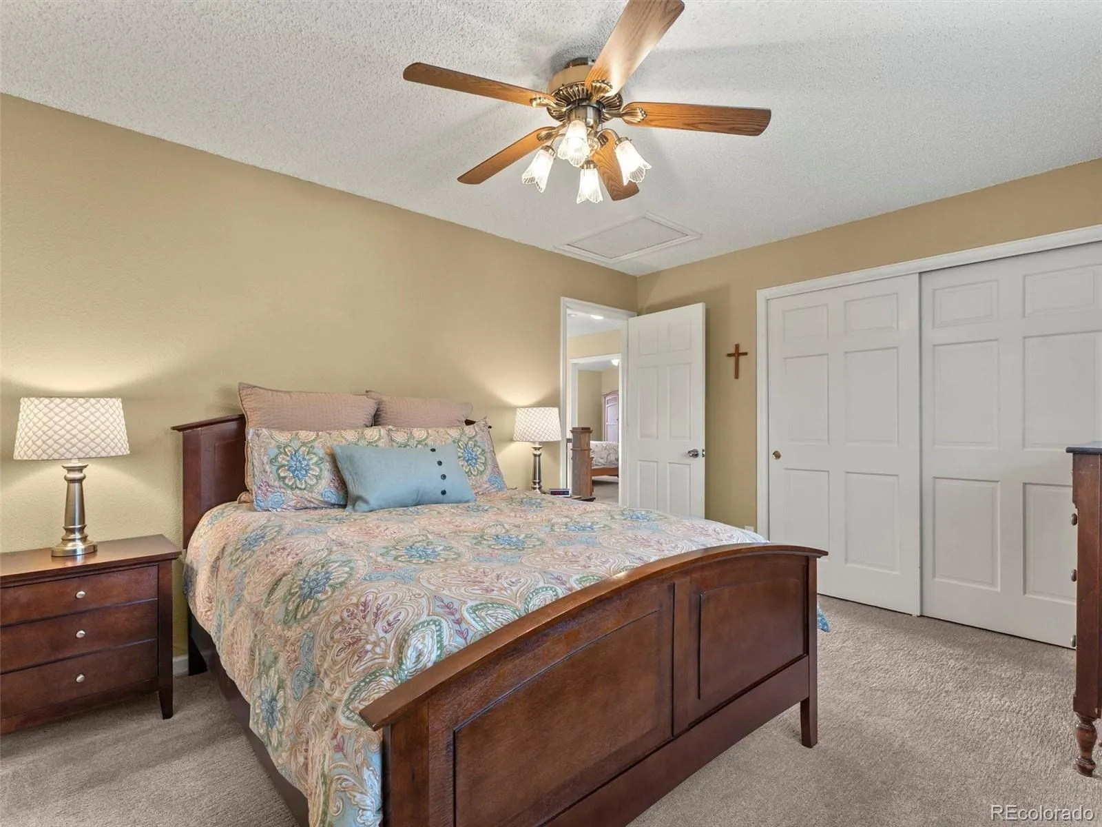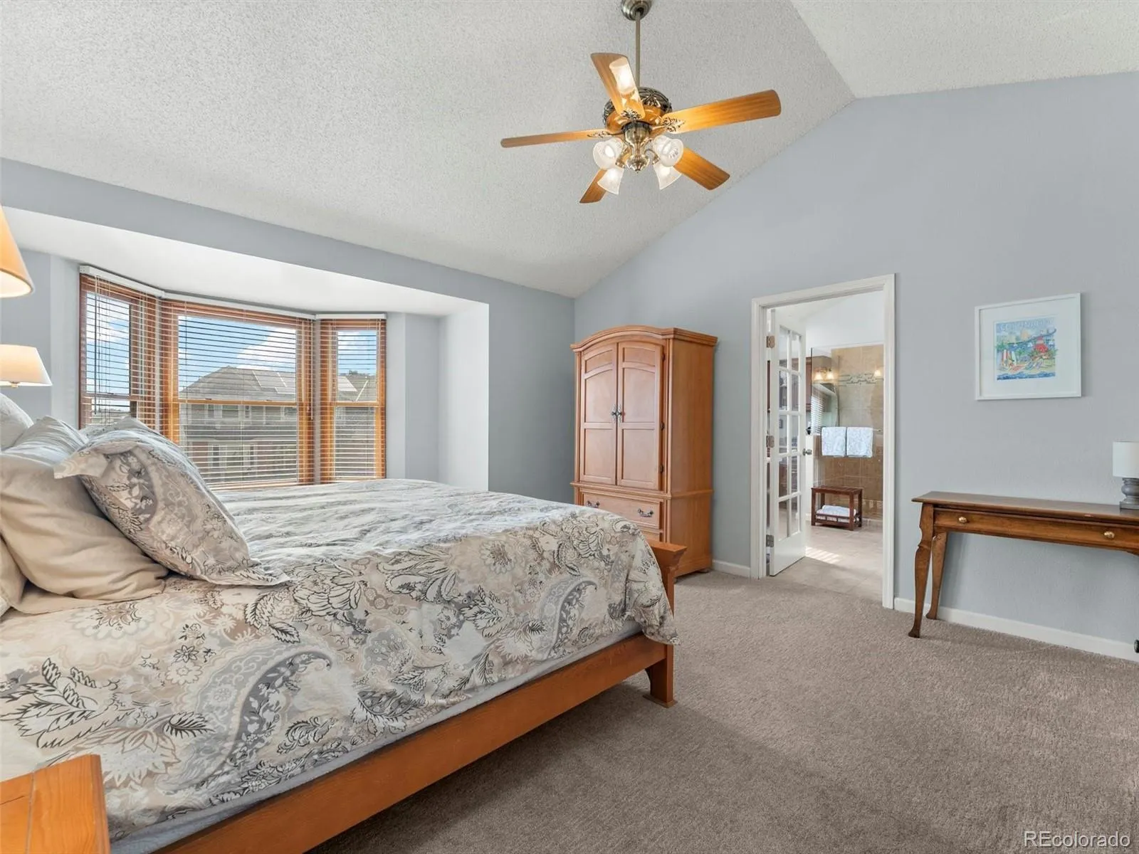 Updated kitchen with granite countertops and an expanded island, white cabinets and appliances, including a double oven. Vaulted Family room with gas log fireplace, recessed lighting, custom shelving and brick surround. Living room comes with crown molding and custom blinds and opposite is the main floor study with book shelving, French doors and ceiling fan. Large formal dining room with a bay window and Upstairs there is a luxurious vaulted primary bedroom and bath with expanded shower, radiant heated flooring and walk in closet along with a coffee bar. Large secondary bedrooms, all with ceiling fans and custom blinds. Walk out to the backyard and notice the big side yards that comes with a fabulous patio, brick pavers and a custom trex deck that is covered and has privacy sun shades. Three car garage gives you plenty of space and a basement that you can finish with your personal taste. All TV’s are included in this wonderful home and one you would be proud to own. Huge Price reduction in one of the best subdivisions in Highlands Ranch. Make it yours.