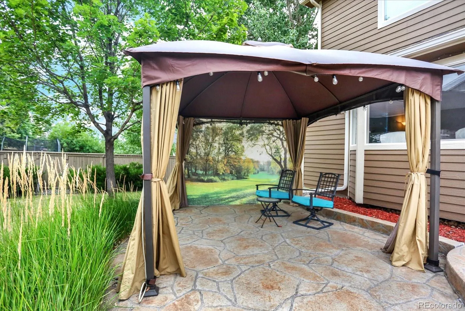 • String lighting across the patio and fencing for evening ambiance