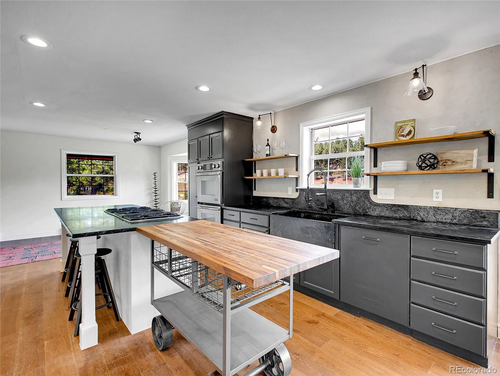 Step inside to a warm and welcoming main level featuring fresh paint, rich wood flooring, and an eat-in kitchen complete with stainless steel appliances, a 6-burner gas cook top, double oven, farmhouse sink, soapstone countertops with counter seating, and a spacious walk-in pantry. The walk through pantry with wine fridge connects directly to the oversized heated 3-car garage—perfect for quick grocery drop-off and ample storage. A second garage entry leads into a walk-in laundry/mudroom with built-in cabinetry and a utility sink, thoughtfully designed to meet the demands of mountain living.
