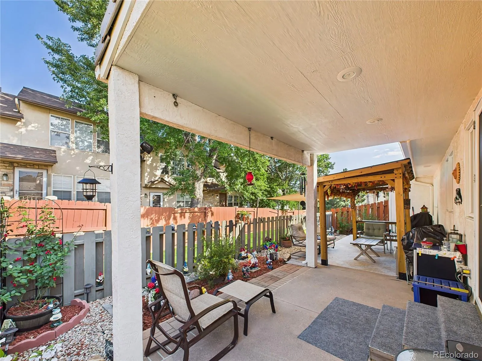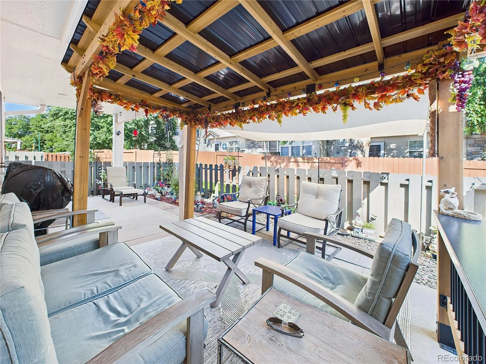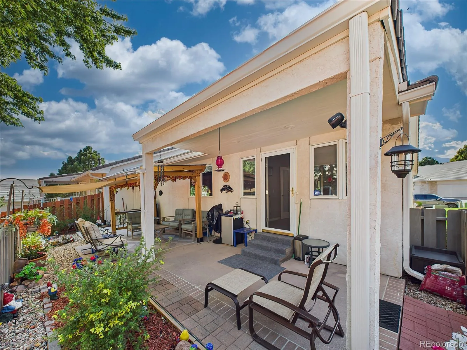 Located in the sought-after Highland Oaks at Cheyenne Mountain Ranch, this meticulously maintained ranch-style home blends comfort, convenience, and thoughtful updates. The stone-accented exterior is framed by mature landscaping, a welcoming front patio, and a spacious driveway. Inside, the open-concept layout is filled with natural light and updated with luxury vinyl plank flooring and fresh neutral finishes. The kitchen shines with stainless steel appliances—including a new range (installed August 2024) and upgraded ice maker (July 2024)—plus ample cabinetry and a charming bay window breakfast nook. Fresh carpet was installed throughout in October 2024, complementing the bright bedrooms and flexible sunroom/office space. The extended back patio offers expanded outdoor living with custom hardscaping, a newly erected pergola (late 2024), and a retractable awning added in August 2025 for shade and comfort. Additional upgrades include: Built-in shelving and two wall-mounted cabinets in the garage, New privacy fence (February 2025), Garage door spring replacement, Full air duct cleaning (November 2024). This home offers low-maintenance living in a quiet, private community with nearby Quail Lake access, scenic trails, and close proximity to shopping, dining, and Fort Carson.