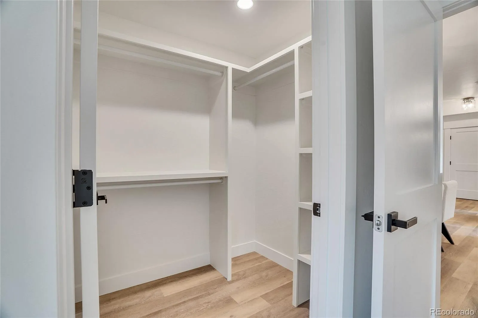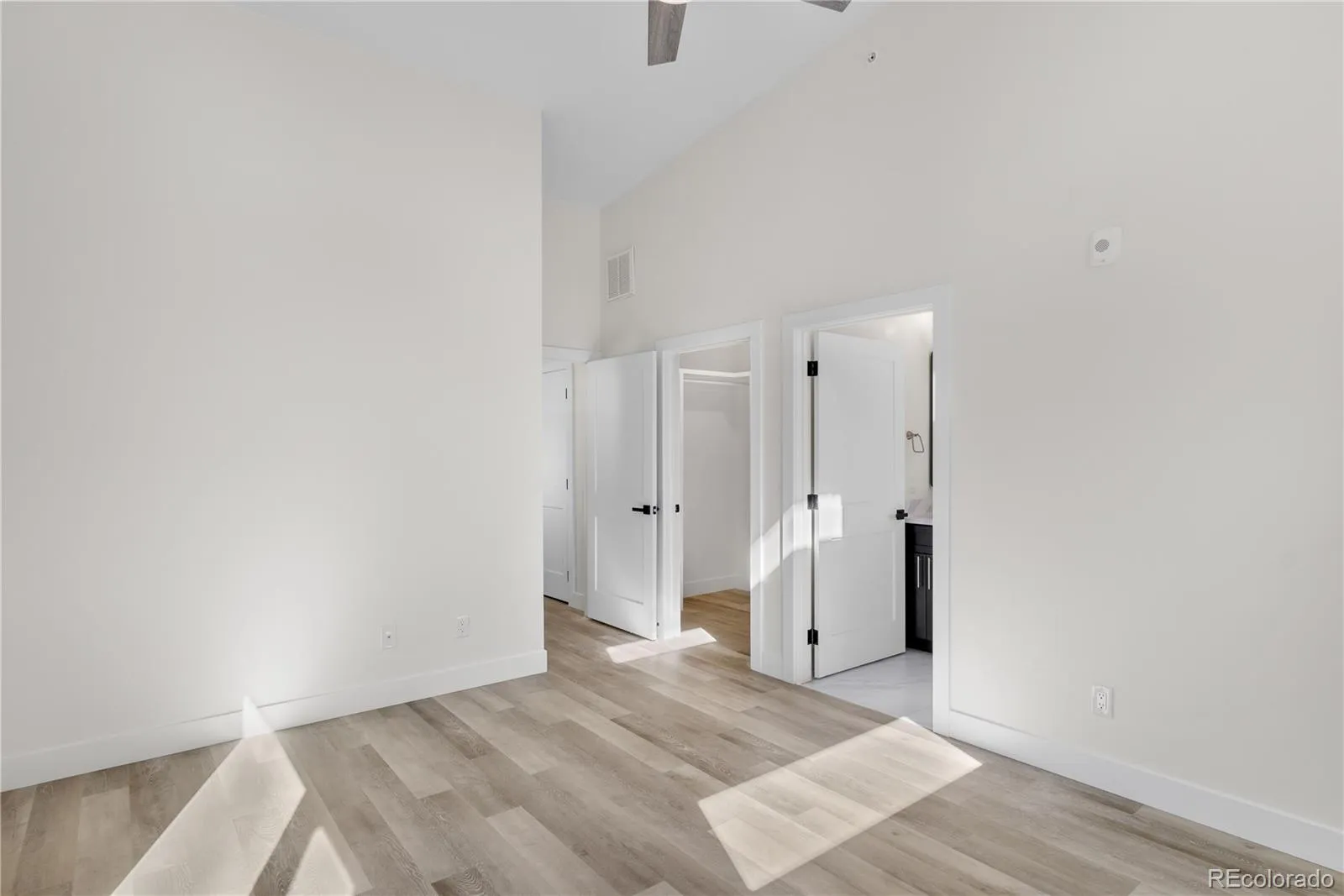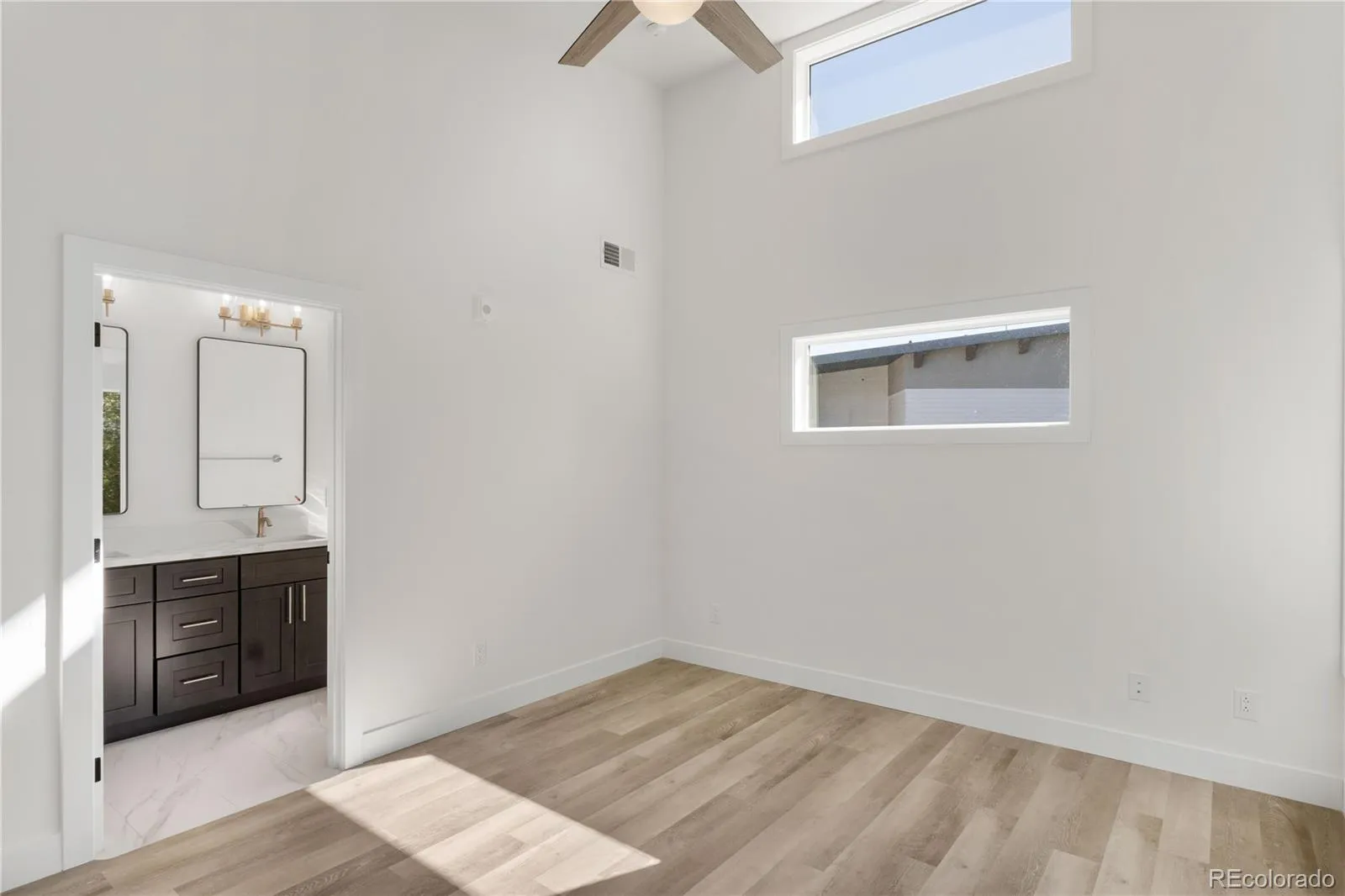 The primary suite is your personal haven, with a walk-in closet complete with custom built-ins. The spa-inspired bath includes a curb-less shower, dual sinks, designer Moen and Delta fixtures, and a remote-controlled ceiling fan for year-round comfort.