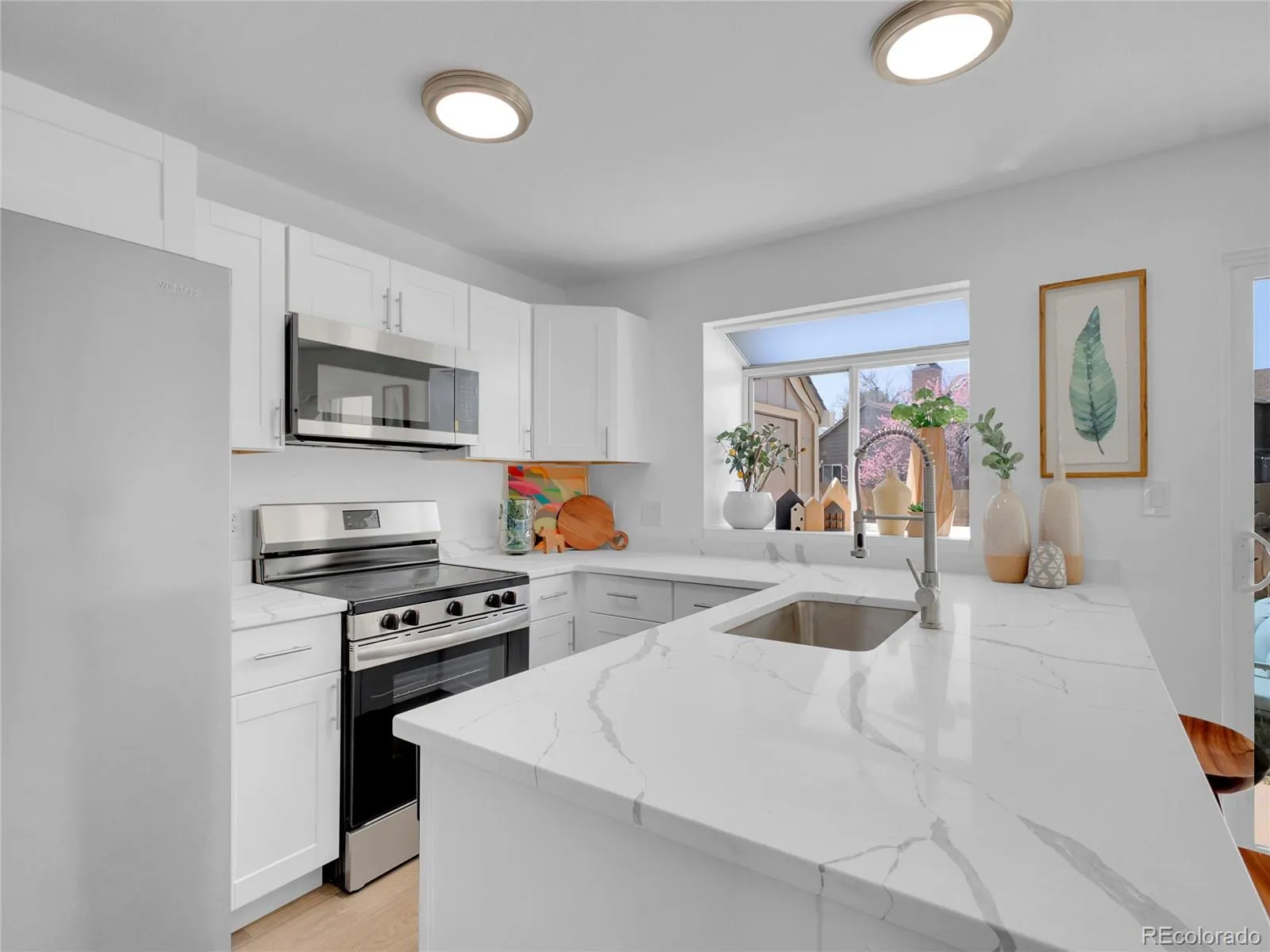 Completely renovated, all new townhome in Dakota Station! Double primary suits with large bedrooms upstairs. Super low HOA dues compared to the same unit just accross Chatfield Ave, and many other similar communities in the area (and includes water). New flooring, new kitchen appliances, new washer and dryer, new water heater. A whole new kitchen with modern, white cabinets, quartz counters, and appliances. Upstairs you will find 2 large, primary bedrooms with ensuite bathrooms. Both bedrooms have vaulted ceiling and tons of light. Private patio and storage in the rear which overlooks a green space and community pool area. Minutes to Chatfield Reservoir, numerous parks, scenic trails, coffee shops, and restaurants just a stone’s throw away, this location is a true gem. Less than a 5-minute drive to C470, providing easy access to the mountains, downtown Littleton and DTC. Durable luxury vinyl flooring is on main floor and upstairs in the bedrooms. Kitchen features quartz countertops, stainless steel appliances and a built-in breakfast nook for additional seating and storage. Bathrooms feature new vanities, new tile and gorgeous, frameless glass enclosures.