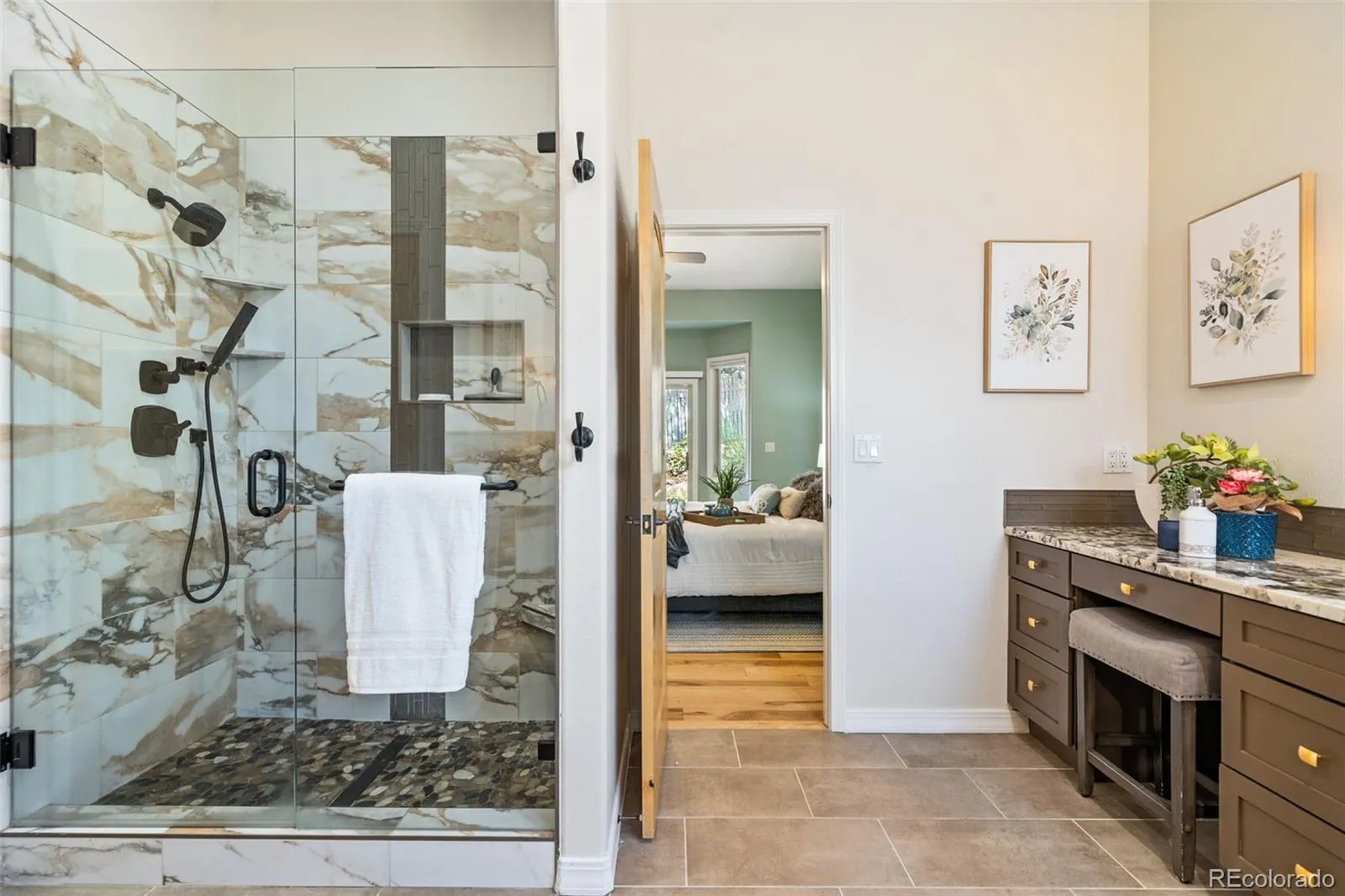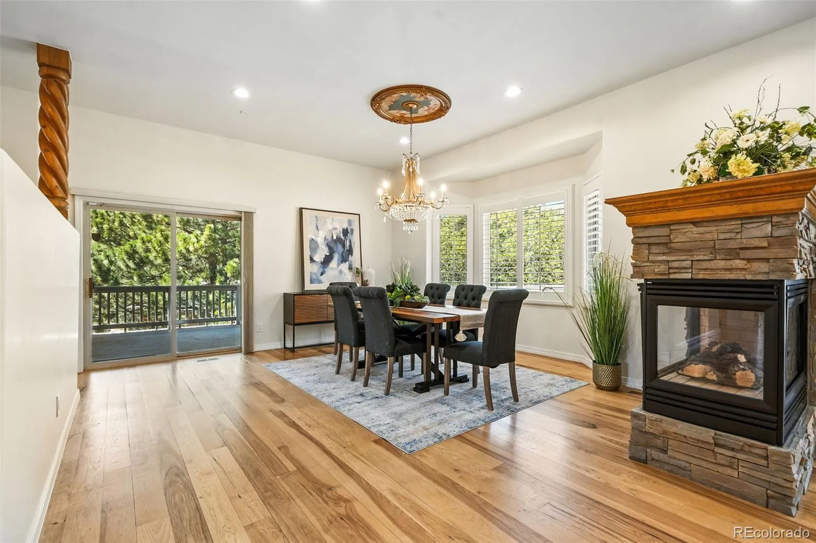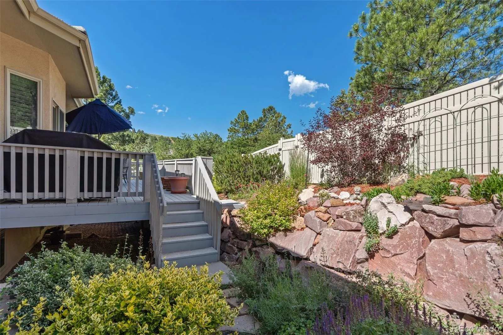Stunning ranch-style home on a private cul-de-sac in Peregrine, features true main level living and is designed to capture the essence of Colorado living. From the moment you enter, soaring beamed ceilings, alder doors and rich hickory floors set an elegant tone in the open-concept great room complete with a wall of windows framing the foothill views. At the heart of the home is a beautifully remodeled kitchen featuring striking Patagonia granite, a sprawling center island, six-burner gas cooktop with downdraft and abundant cabinets. The adjoining dining room, anchored by a dual-sided fireplace, creates an inviting setting for gatherings. The luxurious primary suite is a retreat of its own, with a private walkout to the backyard, a cozy gas fireplace, and a spa-inspired bath featuring a jetted tub, oversized walk-in shower, and walk-in closet. A secondary bedroom with adjoining bath offers the perfect guest suite or private office. The main-level laundry is conveniently located. The walkout lower level was made for entertaining, with a sprawling family room, gas fireplace, wet bar, and seamless access to the patio. Two additional bedrooms, and two full bathrooms provide comfort and privacy. The versatile flex room is ideal for a gym, dance studio, or hobby space. Generous storage completes the level. Step outside to experience the tranquility of this truly special location. Relax on the expansive deck overlooking a cascading water feature with the backdrop of towering ponderosa pines and scrub oak. Located minutes to award winning District 20 schools, shopping and dining with easy access to I-25. This home embodies the perfect balance of luxury, functionality, and natural beauty—truly the ideal Colorado lifestyle.