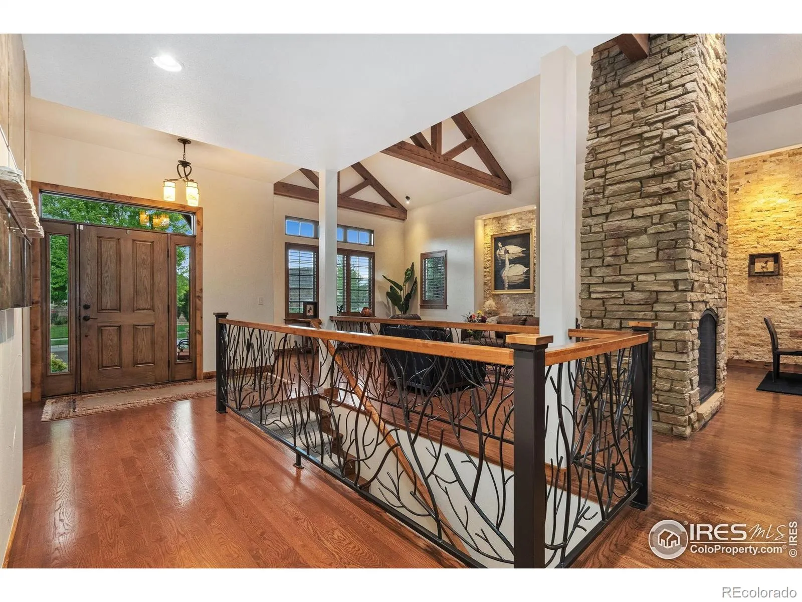 This beautifully crafted 4-bedroom home blends timeless architecture with high-end finishes. A covered front porch is ideal to enjoy mountain views. The floor-to-ceiling dual-sided stone fireplace separates the living rm from the spacious kitchen + dining areas. The gourmet kitchen features Thermador appliances, including a 5-burner range, convection oven, microwave, and refrigerator, with a tall eating bar ideal for casual dining +easy access to covered deck w auto shade. The primary suite offers spa-like amenities w/ dual glass vessel sinks, backlit mirrors, and walk-in closet. Additional main-level office / TV room adds flexibility, while laundry area has custom cabinetry, sink, +closet. Beautiful steel rod railing leads to walkout lower level w/ 3 bedrooms, full bath, family room w/wet bar, a workout area, + extra storage. One bedroom includes a built-in Murphy bed. The side-entry heated two-car garage offers bonus space currently used as a rec/sports area, with potential for a third bay or studio… 265 sq ft. Lot backs to private open space, but close to trails and Boedecker Lake. New carpet + paint and some lighting in lower level, new Lennox furnace installed 2024, new smoke alarms, radon mitigation complete, Pre-inspected and 5 year Roof Cert in place
