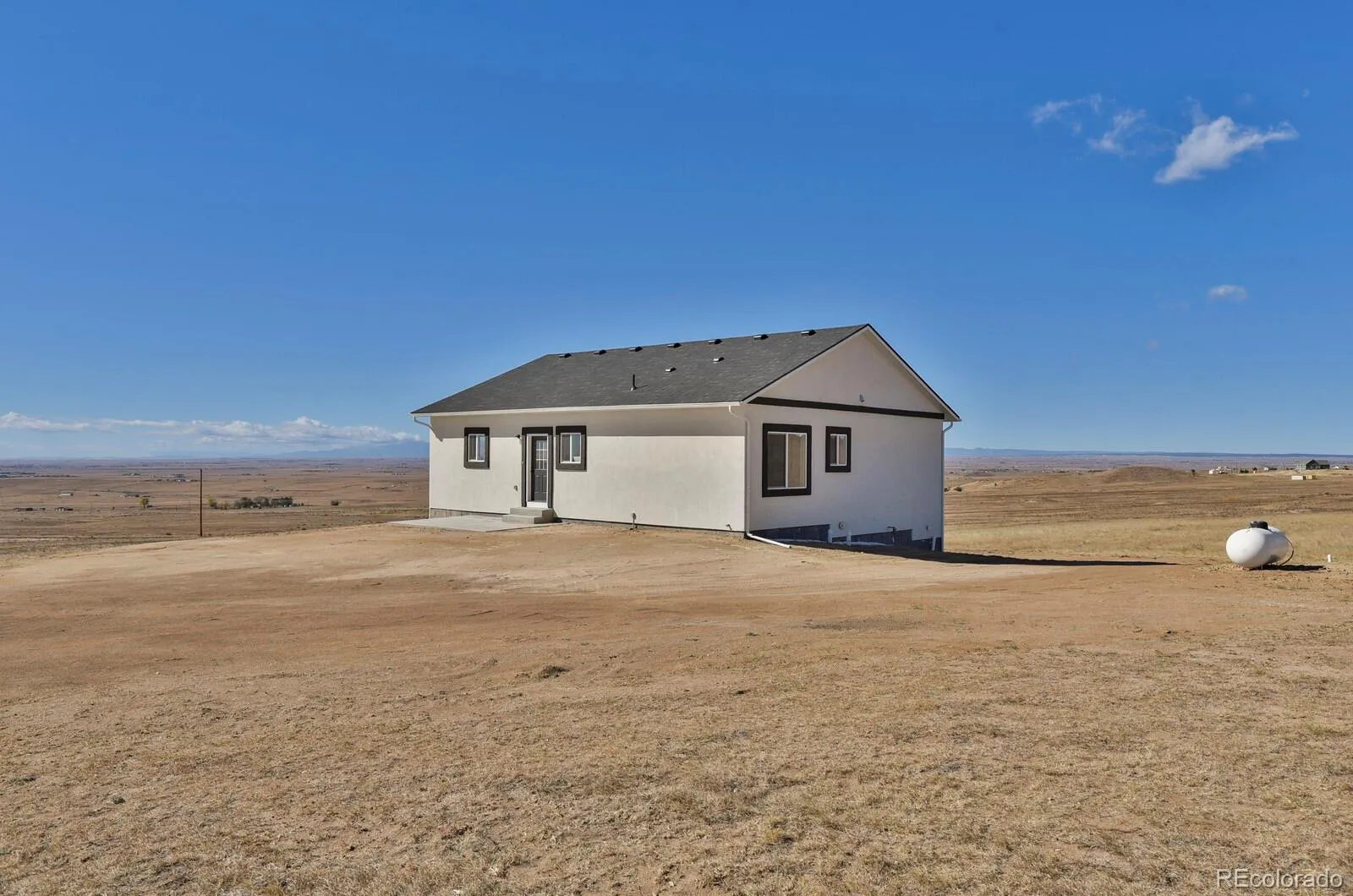 Here’s your chance to own 39 acres in Calhan with some of the best views around. From this property you can see the charming windmills in the distance and enjoy wide-open Colorado skies with sunrises and sunsets that will stop you in your tracks. On clear days, Pikes Peak is front and center; completely unobstructed. The home is a ranch-style layout with 3 bedrooms and 2 bathrooms. It feels bright and open thanks to the large windows and open floor plan. The kitchen flows right into the living room, making it a great space for entertaining or everyday living. Flooring includes luxury vinyl throughout the main areas, tile in the bathrooms, and soft carpet in the bedrooms. The primary suite is tucked away on one end of the house for extra privacy, while the other two bedrooms sit on the opposite side. Downstairs, the walkout basement is unfinished but already pre-stubbed for a bathroom. The builder is even providing plans so you can finish it out when the time is right. The home is also prepped for A/C and radon mitigation. And you’ll appreciate the peace of mind that comes with a Class 4 impact-resistant shingle roof. The land is zoned A-35, which gives you many options, such as an accessory dwelling, outbuildings, livestock, and more. If you’ve been thinking about adding a second residence or a mother-in-law suite, this zoning makes it possible to do so down the road. Water rights are included as well, with 1.25 annual acre-feet in both the Denver and Arapahoe aquifers being transferred at closing. A recent survey is already completed and ready to go. This property gives you space, views, and flexibility—all in one package. Don’t miss your chance to tour this incredible home today!