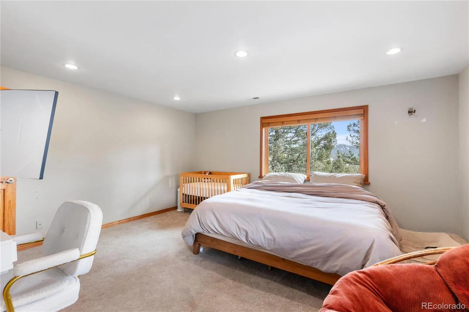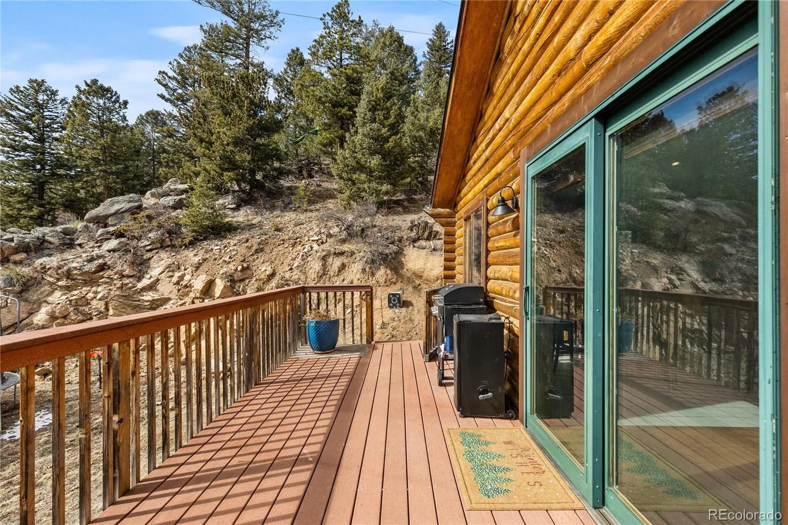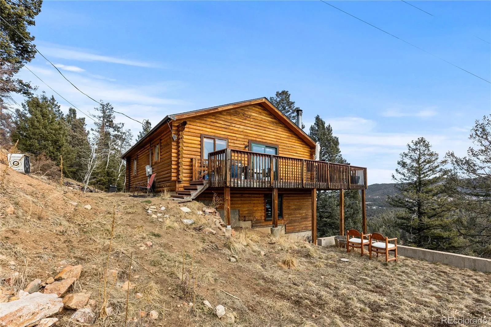 Experience true mountain living in this charming log home on over two private acres in Conifer, CO on a sunny south facing lot. Perched above the other homes on Blue Sky Trail, this property offers breathtaking, unobstructed views of the foothills and ultimate privacy. The oversized three-car garage provides ample storage for vehicles, outdoor gear, or a workshop. Inside, the open-concept living, dining, and kitchen area is perfect for entertaining, with stainless steel appliances in the kitchen, a cozy fireplace in the living room, and expansive windows that flood the space with natural light. Step outside onto the wrap-around deck to take in the sweeping vistas or access the functional flat yard, ideal for kids, dogs, or outdoor gatherings. Upstairs, you’ll find two spacious bedrooms and a full bathroom with a skylight, adding warmth and brightness. The walkout basement features a third bedroom, another full bathroom, a laundry room, and a flexible living space that can serve as a home office, gym, additional living room, or entertainment room. Enjoy the recently added laminate flooring to the basement to make an additional living space. This home offers the perfect blend of rustic charm and modern convenience, located just minutes from grocery stores and restaurants in Aspen Park and Conifer, and only 35 minutes from Denver.