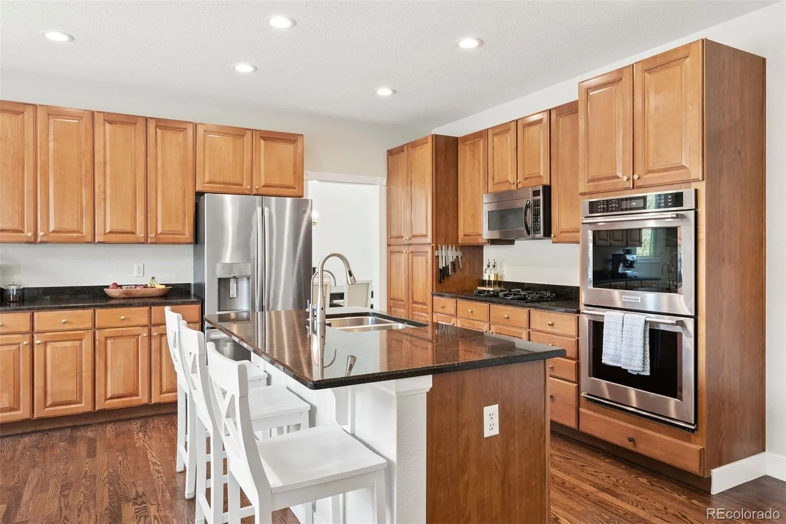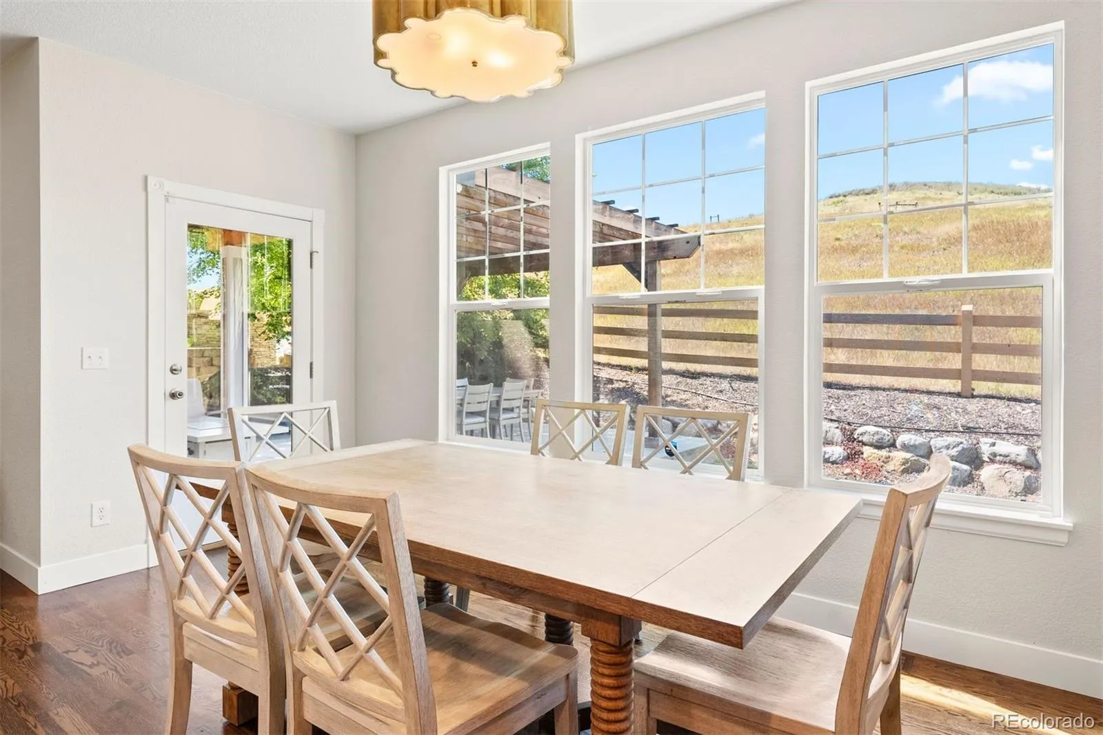 The entry welcomes you with soaring ceilings, rich hardwood floors, and an elegant staircase that opens to formal living and dining areas. The chef’s kitchen features painted cabinetry, granite countertops, stainless appliances with double ovens, a new dishwasher, and a large island with seating. A sunny breakfast nook leads to a pergola-covered patio framed by mature landscaping and open views, ideal for quiet mornings or lively gatherings. Adjacent, the family room centers on a stone-accented fireplace, offering warmth and charm.