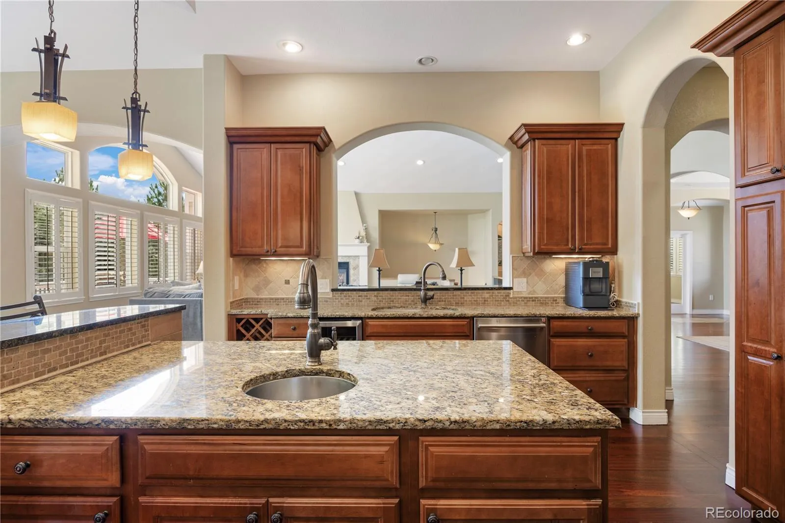 Featuring a rare, walk-out ranch in Soaring Eagle Estates with stunning curb-appeal! This beautiful Great Room ranch offers a spacious sunlit Primary Suite with 5-piece bath and walk-in closet, PLUS a second ensuite, full sized Guest Room with walk-in closet on the main level. The elegant entry leads to an enormous Great Room with volume ceilings, fireplace, built-ins, a wall of windows and a pass-through to the Chef’s kitchen. The kitchen offers granite countertops, expansive cabinets and prep surfaces, an island and a spacious eat-in nook. The formal dining room is connected to the kitchen through an efficient Butler’s Pantry. The office, Powder bath and main floor laundry room complete the main level. The finished, walk-out basement is built for casual entertainment with a wet bar, a rec room sized for a pool table (negotiable), a theater/media room, an exercise room, a powder bath and two additional secondary ensuite bedrooms. The utility room has ample space for seasonal storage too. The outdoor spaces include a generous partially covered upper deck with a stone fireplace, a covered patio at the walk-out level (hot tub included) and a lush, beautifully landscaped, private yard with mature trees, shrubs and perennial flowering plants. The 3 car garage is finished and spacious with plenty of room for a workshop or storage.