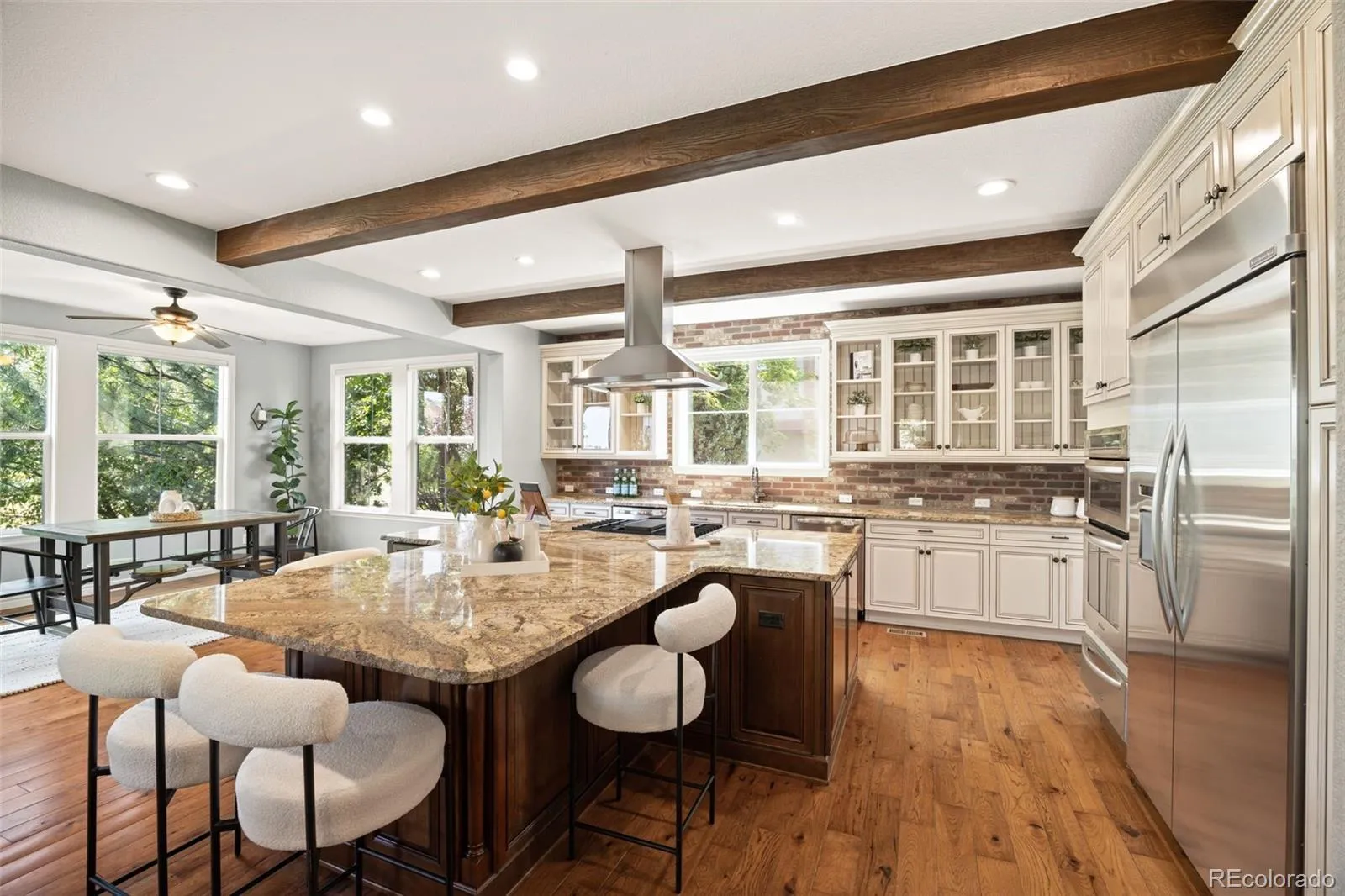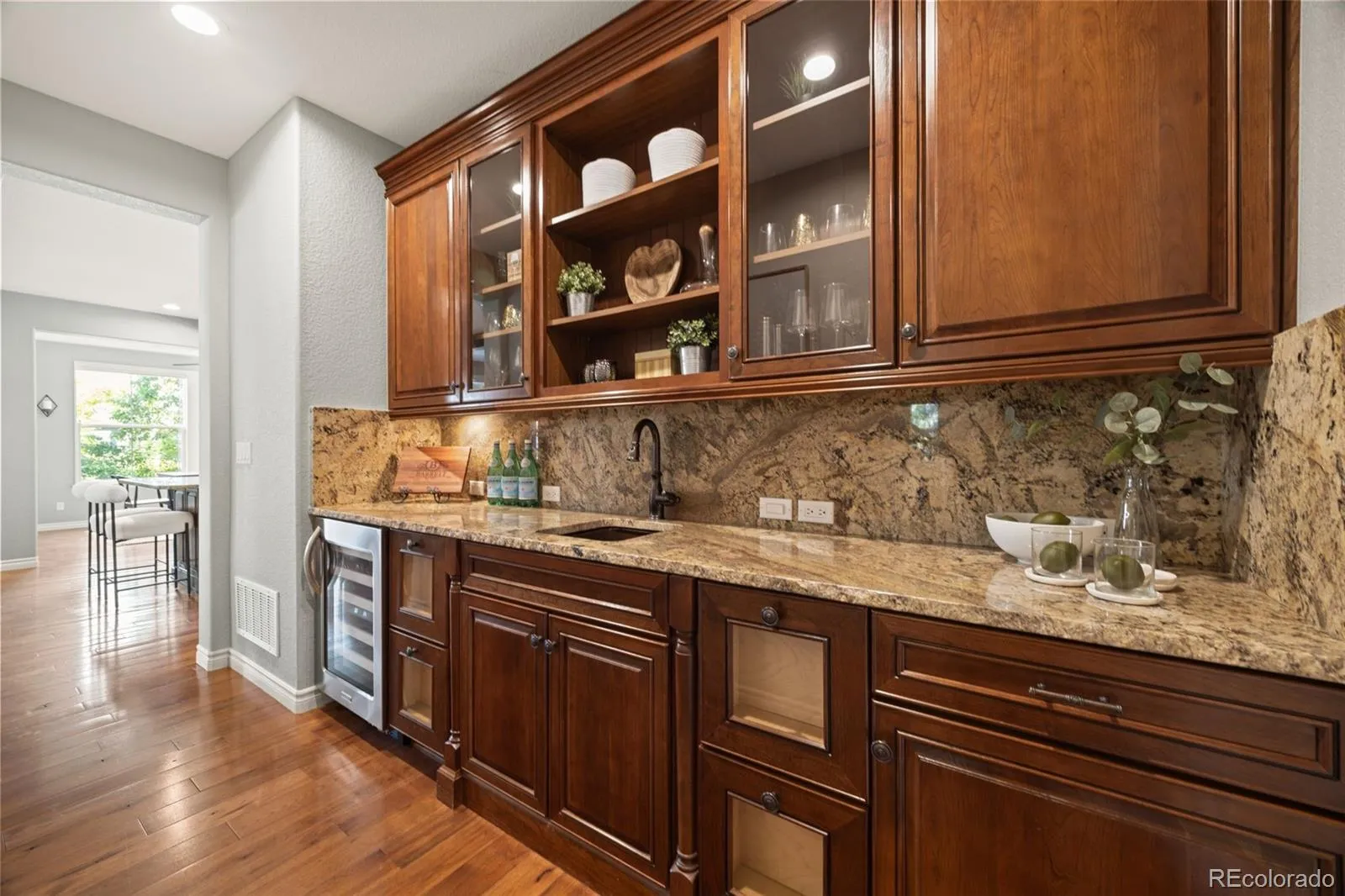 Welcome to this beautifully appointed 5-bedroom, 6-bathroom home nestled in a quiet Highlands Ranch cul-de-sac. Designed with both elegance & functionality in mind, the main level offers a bedroom with en-suite bath & a chef’s kitchen featuring a gas range, warming drawer, double ovens, two dishwashers, a spacious walk-in pantry, extra island storage, & a generous butler’s pantry with appliance closet. The formal dining room is enhanced by a wood-beamed ceiling & a striking two-story brick accent wall, leading upstairs to 4 additional bedrooms. The primary suite boasts dual walk-in closets, a spa-style shower with dual shower heads. Secondary bedrooms include one bedroom with its own en-suite bath & two additional bedrooms sharing a Jack-and-Jill bath & private access to the upper sitting deck with mountain views. The finished basement is perfect for entertaining, complete with a wet bar & a striking double-sided brick fireplace. A tucked-away pocket office adds both convenience and privacy. Throughout the home, plantation shutters, rich wood accents, & premium finishes bring warmth & character. Step outside to enjoy a wraparound patio with a built-in grill, outdoor kitchen, and TV for year-round gatherings. Additional features include dual water heaters, dual-zone heating & cooling, automatic window shades in the main living room and kitchen, a Halo water system, furnace with humidifier, main-level laundry with sink, a three-car garage, newly painted exterior, & custom Jellyfish lighting to create the perfect ambiance in every season. This home seamlessly blends luxury, comfort, & convenience in one perfect package. The Backcountry neighborhood hosts amazing events for residents all year long…the golf cart friendly neighborhood amenities include a clubhouse, Campus Lounge for full service dining, Lost Coffee shop, fitness center, parks and miles of trails for walking, hiking & biking. GOLF CART included in home sale! Live, and love the Backcountry Lifestyle!