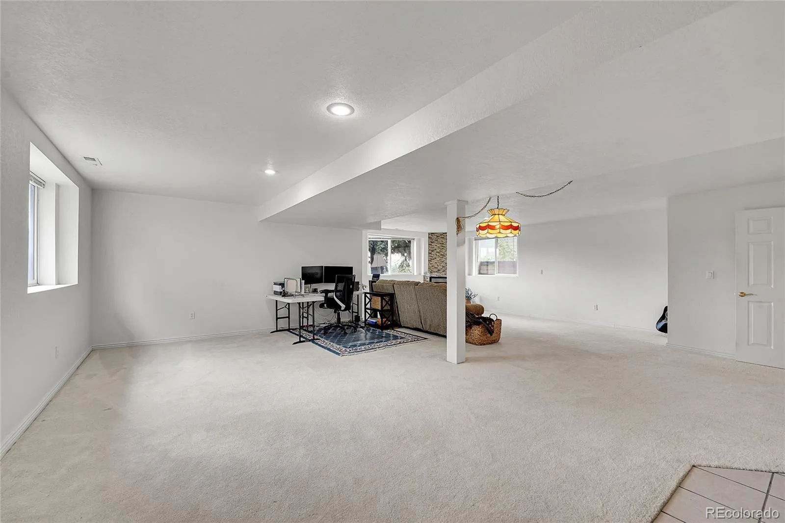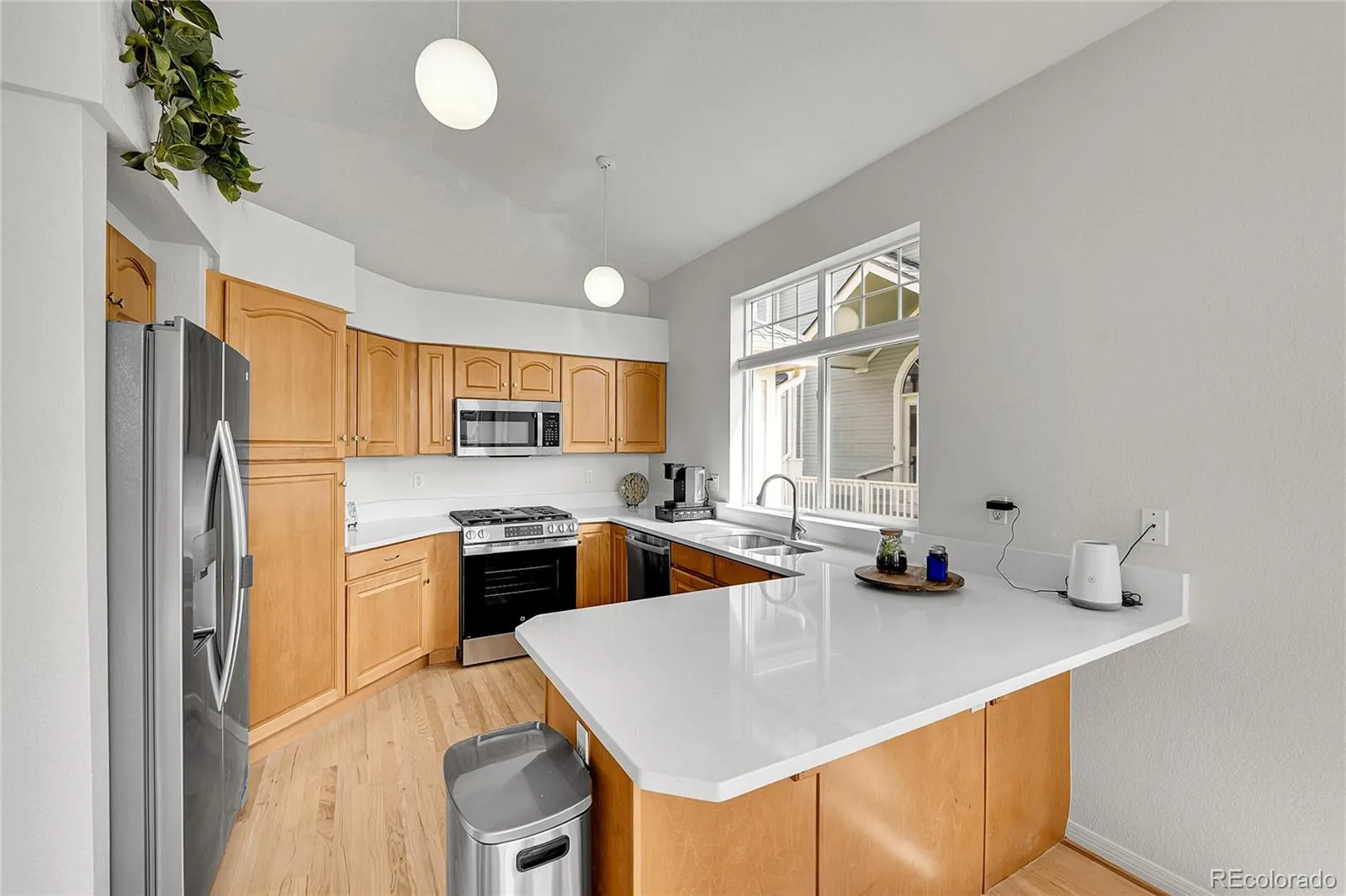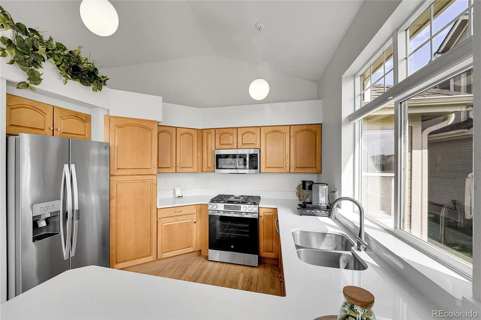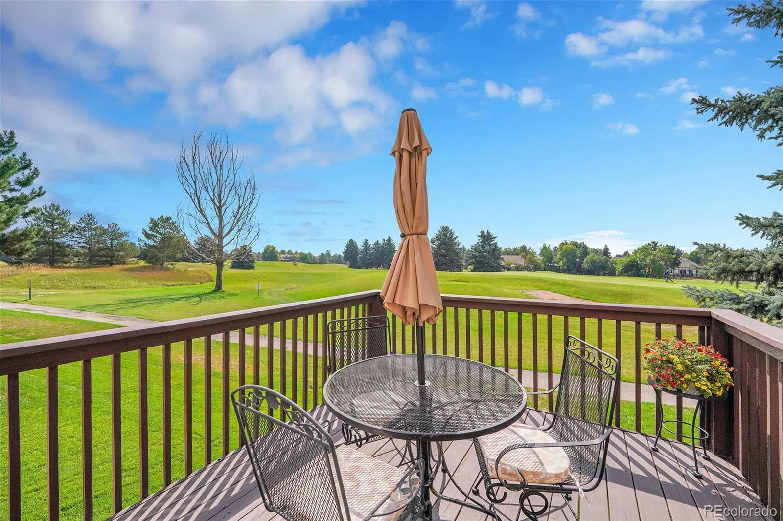 Welcome to this stunning single-family home located in the desirable Eagle Trace community of Broomfield, This expansive property backs to the Eagle Trace Golf Course and features a main floor primary suite plus 2 more bedrooms and 3 additional bathrooms all spread over a generous 3,116 square feet. With a two-car garage and a beautifully landscaped exterior, this residence is perfect for those seeking a blend of low maintenance comfort and elegance in a suburban setting. As you enter, you are greeted by a grand foyer with new lighting and gorgeous new wood flooring leading to a spacious living room adorned with a cozy fireplace and vaulted ceilings, creating an inviting atmosphere. The new hard wood floors and freshly painted walls continue throughout the living room, kitchen and primary bedroom. The kitchen is a chef’s delight, featuring new stainless steel appliances, new quartz countertops, a peninsula, and ample natural light streaming through large windows. The dining area, with its easy access to the fabulous deck overlooking the golf course, is perfect for entertaining guests or simply unwinding while taking in the mountain views. The main level primary bedroom offers a serene retreat with an en-suite bathroom, while the finished basement provides additional living space and a wet bar for recreation or relaxation. Located in Eagle Trace North, you’ll have a virtually maintenance-free yard, and access to community amenities such as nearby golf courses and parks, perfect for outdoor enthusiasts. The neighborhood is known for its quiet, friendly atmosphere and excellent schools; plus you’ll be close to shopping and restaurants. Don’t miss this one!
